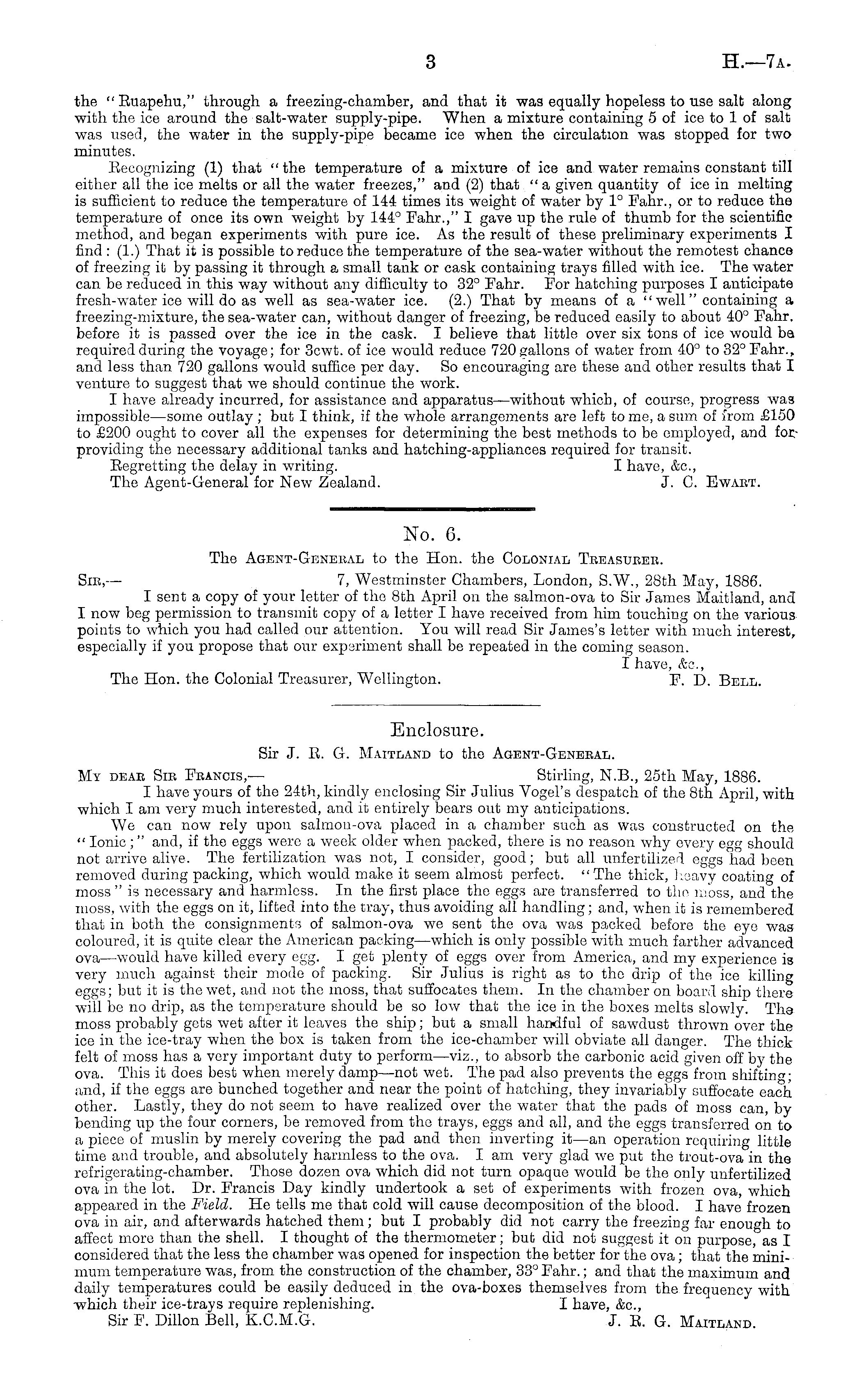 Enclosure. Sir J. E. G. Maitland to tho Agent-Geneeal. My deae Sib Francis, — Stirling, N. 8., 25th May, 1886. I have yours of the 24th, kindly enclosing Sir Julius Vogcl's despatch of the Bth April, with which I am very much interested, and it entirely bears out my anticipations. We can now rely upon salmon-ova placed in a chamber such as was constructed on the " Ionic;" and, if the eggs were a week older when packed, there is no reason why every egg should not arrive alive. The fertilization was not, I consider, good; but all unfertilized eggs had been removed during packing, which would make it seem almost perfect. "The thick, heavy coating of moss" is necessary and harmless. In the first place the eggs are transferred to the moss, and the moss, with the eggs on it, lifted into the tray, thus avoiding all handling; and, when it is remembered that in both the consignments of salmon-ova we sent the ova was packed before the eye was coloured, it is quite clear tho American packing—which is only possible with much farther advanced ova —would have killed every egg. I get plenty of eggs over from America, and my experience is very much against their mode of packing. Sir Julius is right as to tho drip of the ice killing eggs; but it is the wet, and not the moss, that suffocates them. In the chamber on board ship there will bo no drip, as the temperature should be so low that the ice in the boxes melts slowly. Th.3 moss probably gets wet after it leaves the ship; but a small handful of sawdust thrown over the ice in the ice-tray when the box is taken from the ice-chamber will obviate all danger. The thick felt of moss has a very important duty to perform—viz., to absorb the carbonic acid given off by the ova. This it does best when merely damp—not wet. The pad also prevents the eggs from shifting; and, if the eggs are bunched together and near the point of hatching, they invariably suffocate each other. Lastly, they do not seem to have realized over the water that the pads of moss can, by bending up the four corners, be removed from the trays, eggs and all, and tho eggs transferred on to a piece of muslin by merely covering the pad and then inverting it—an operation requiring little time and trouble, and absolutely harmless to the ova. I am very glad we put the trout-ova in the refrigerating-chamber. Those dozen ova which did not turn opaque would be the only unfertilized ova in the lot. Dr. Francis Day kindly undertook a set of experiments with frozen ova, which appeared in the Field. He tells me that cold will cause decomposition of the blood. I have frozen ova in air, and afterwards hatched them ; but I probably did not carry the freezing far enough to affect more than the shell. I thought of the thermometer; but did not suggest it on purpose, as I considered that the less the chamber was opened for inspection the better for the ova; that the minimum temperature was, from the construction of the chamber, 33° Fahr.; and that the maximum and daily temperatures could be easily deduced in the ova-boxes themselves from the frequency with which their ice-trays require replenishing. I have, Sec., Sir F. Dillon Bell, K.G.M.G. J. E. G. Maitland.