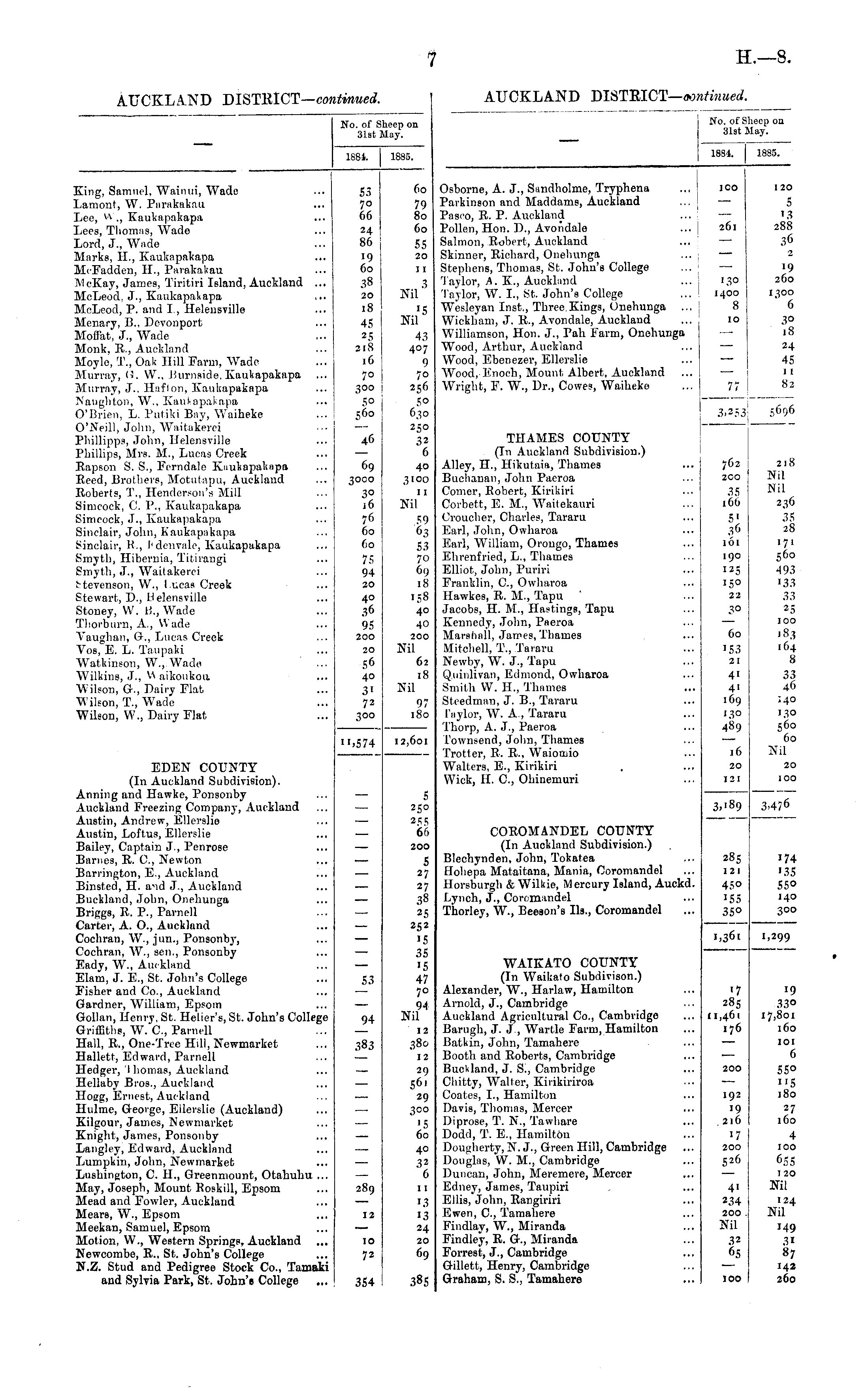 'o. of Sheep ou 31st May. 1884. I 1885. Osborne, A. J., Sandholme, Tryphena Parkinson and Maddains, Auckland Pasoo, R. P. Auckland Pollen, Hon. D., Avondale Salmon, Robert, Auckland Skinner, Kichard, Onehunga Stephens, Thomas, St. John's College Taylor, A. ~K., Auckland Taylor, W. I., St. John's College Wesleyan Inst., Three.Kings, Onehunga ... Wickham, J. R., Avondale, Auckland Williamson, Hon. J., Pah Farm, Onehunga Wood, Arthur, Auckland Wood, Ebenezer, Ellerslie Wood,-Enoch, Mount Albert, Auckland Wright, F. W., Dr., Cowes, Waiheke IOO 261 130 1400 8 IO 120 5 13 288 3» 19 260 1300 6 3° 18 i 24 45 11 82 77 THAMES COUNTY (In Auckland Subdivision.) Alley, H., Hikutain, Thames Buchanan, John Paeroa Comer, Eobert, Kirikiri Corbett, E. M., Waitekauri Croucher, Charles, Tararu Earl, John, Owharoa Earl, William, Orongo, Thames Ehrenfried, L., Thames Elliot, John, Puriri Franklin, C, Owharoa Hawkee, R. M., Tapu Jacobs, H. M., Hastings, Tapu Kennedy, John, Pneroa Marshall, Jan>cs, Thames Mitchell, T., Tararu Newby, W. J-, Tapu Quinlivan, Edmond, Owharoa Smith VV. II., Thames Steedman, J. B., Tararu 1'iiylor, W. A., Tararu Thorp, A. J., Paeroa Townsend, John, Thames Trotter, B. R., Waiomio Walters, E., Kirikiri Wick, H. C, Ohinemuri 3.253 5696 762 200 35 166 218 Nil Nil 236 35 28 ■7 1 560 493 133 3?, 25 100 ■83 164 5' 161 190 15° 22 3° 60 153 21 4 1 4' 169 130 489 33 46 140 J3O 560 60 Nil 20 16 20 121 100 COROMANDEL COUNTY (In Auckland Subdivision.) Bleebynden, John, Tokatea Hohepa Mataitana, Mania, Ooromandel Horsburgh & Williie, Mercury Island, Auckd. Lynch, J., Coremmdel Thorley, W., Beeson's Us., Coromandel 3. "89 3.4/6 285 121 45° 155 35° •74 ■35 55° 140 300 WAIKATO COUNTY (In Waikato Subdivison.) Alexander, W., Harlaw, Hamilton Arnold, J., Cambridge Auckland Agricultural Co., Cambridge Barugh, J. J , Wartle Farm, Hamilton Batkin, John, Tamahere Booth and Roberts, Cambridge Buckland, J. S!, Cambridge Chitty, Waller, Kirikiriroa Coates, I., Hamilton Davis, Thomas, Mercer Diprose, T. N., Tavvhare Dodd, T. E., Hamilton Dougherty, N. J., Green Hill, Cambridge Douglas, W. M., Cambridge Duncan, John, Meremere, Mercer Edney, James, Taupiri Ellis, John, Rangiriri Ewen, C, Tamahere Findlav, W., Miranda Findley, R. a., Miranda Forrest, J., Cambridge G-illett, Henry, Cambridge Graham, S. S., Tamahere >»36i 1,299 '7 285 11,461 176 '9 33° 17,801 160 101 6 200 o 55° "5 180 192 19 216 27 160 A 17 200 526 4 IOO 120 Nil 124 Nil 149 31 87 142 260 41 234 200 . Nil 32 6.5 100