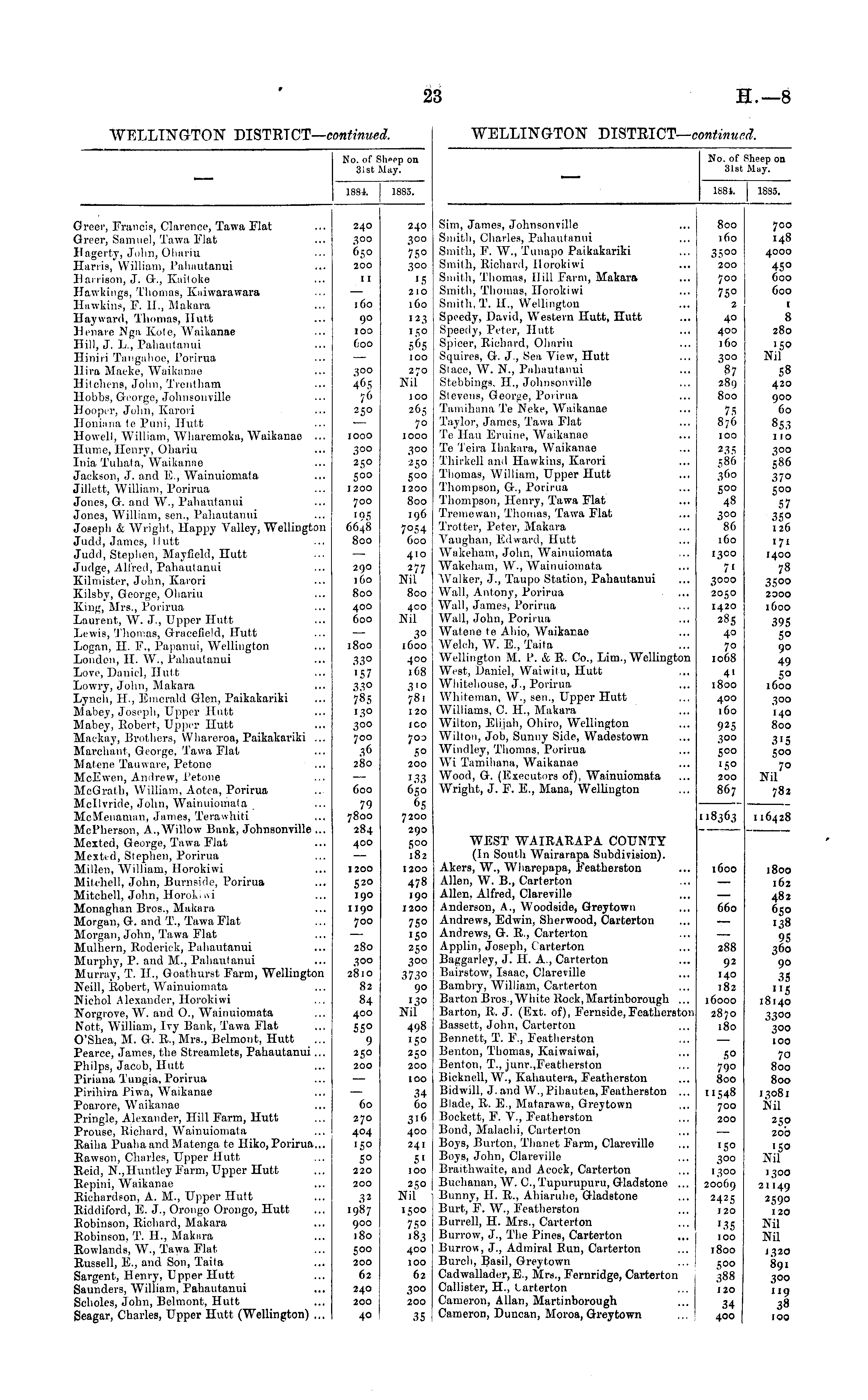 No. of Rh^pp on 31 st May. 188J. 1885. 3reer, Francis, Clarence, Tavva Hat 3reer, Samuel, Tawa Flat Hagerty, John, Oliariu Elanis, William, Pahautanui Harrison, J. G\, Kaitoke Hawkhigs, Thomas, ICuiwarawara Hawkins, F. II., Makara tlaj'uard, Thomas, Hutt Henare Nga Kole, Waikanae Flil], J. L., Pahautanui Hiniri Tangahoe, Porirua [lira Maeke, Waikanae Eitohens, John, Trentham Uobbs, Gi'orge, Johnsonville Hooper, John, Karoii Iloninna te Puni, Hutt Howell, William, Wharemoka, Waikanao ... Eume, Henry, Ohariu [nia Tuhata, Waikanae Jackson, J. and E., Wainuiomala Fillett, William, Porirua Tones, G. and W., Pahautanui Jones, William, sen., Pahautanui Joseph & Wright-, Happy Valley, Wellington ludcl, James, Hutt Tudd, Stephen, Mayfield, Hutt fudge, Alfred, Pahautanui Kilmister, John, Karori Kilsby, George, Ohariu King, Mrs., Porirua Laurent, W. J., Upper Hutt Lewis, Thomas, Gracefield, Hutt Logan, II. F., Papanui, Wellington London, II. W., Pahautanui Love, Daniel, Hutt dowry, John, Makara Lynch, H., Emerald Glen, Paikakariki Mabey, Joseph, Upper Hutt Mabey, Eobert, Upper Hutt Mac-kay, Brothers, Whareroa, Paikakariki ... Marchant, George, Tawa Flat Malcni) Tauware, Petone McEwen, Andrew, l'etone McGrath, William, Aotea, Porirua Mcllvride, John, Wainuiomata McMenaman, James, Terawhiti McPherson, A.,Willow Bank, Johnsonville ... Mexted, George, Tawa Flat Mextid, Steplien, Porirua Millen, William, Horokiwi Mitchell, John, Burnside, Porirua Mitchell, John, HoroLmi Monaghan Bros., Makara Morgan, G. and T\, Tawa Flat Morgan, John, Tawa Flat Mulhern, Eoderiek, Pahautanui Murphy, P. and M., Pahaulanui Murray, T. H., Goathurst Farm, Wellington Neill, Kobert, Wainuiomata Nichol Alexander, Horokiwi Norgrove, W. and O., Wainuiomata Nott, William, Ivy Bank, Tawa Flat O'Shea, M. G. E., Mrs., Belmont, Hutt Pearce, James, the Streamlets, Pahautanui... Philps, Jacob, Hutt Piriuna Tungia, Porirua Pirihira Piwa, Waikanae Poarore, Waikanae Pringle, Alexander, Hill Farm, Hutt Prouse, Kichard, Wainuiomata Raiha PuahaandMatenga te Hiko, Porirua... Rawson, Charles, Upper Hutt Reid, N.,Huntley Farm, Upper Hutt Repini, Waikanae Richurdeon, A. M., Upper Hutt Riddiford, E. J., Orongo Orongo, Hutt Robinson, Eichard, Makara Robinson. T. H., Maknra Rowlands, W., Tawa Flat Russell, K, and Son, Taita Sargent, Henry, Upper Hutt 3aunders, William, Pahautanui Scholes, John, Belmont, Hutt Seagar, Charles, Upper Hutt (Wellington) ... 24° 300 650 200 II i Co 90 100 600 ■JOO 465 250 1000 300 250 500 1200 700 19s 6648 800 290 160 800 400 600 1800 33° 157 33° 785 130 300 700 36 280 240 300 75° 300 15 2IO 160 123 I*° 565 100 270 Nil 100 265 7° 1000 300 "250 500 1200 800 196 7°54 600 410 277 Nil 800 400 Nil 3° 1600 400 168 3'° ;8> 120 ICO 100 50 200 600 79 7800 284 400 '33 650 65 7200 290 500 182 1200 520 190 1190 700 1200 478 190 1200 75° 150 250 300 373° 90 •30 Nil 498 '5° 250 200 280 300 2810 82 84 400 55° 9 250 200 60 270 404 '5° 5° 220 200 32 1987 900 180 100 34 60 3>6 400 241 ji joo 250 Nil 1500 7.S° >83 400 100 62 500 200 62 240 200 300 200 35 40