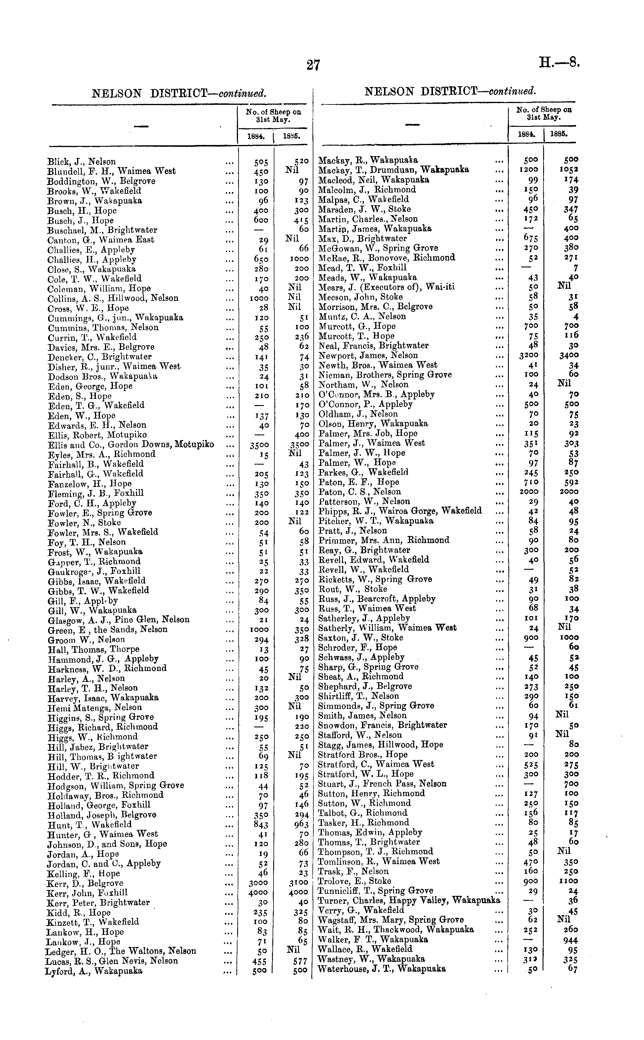 No. of Sheep on 31st May. 1881. 1S85. Mackay, It., WakapuaVa Mackay, T., Drumduan, Wakapuaka Macleod, Neil, Wakapuaka Malcolm, J., Richmond Malpas, 0., Wakefield Marsden, J. W., Stoke Martin, Charles., Nelson Martin, James, Wakapuaka Max, D., Brightwater McG-owan, W., Spring Grove McRae, R., Bonovove, Richmond Mead, T. W., Foxhill Meads, W., Wakapuaka Mears, J. (Executors of), Wai-iti Meeson, John, Stoke Morrison, Mrs. C, Belgrove Mnntz, C. A., Nelson Murcott, G., Hope Murcott, T., Hope ... Neal, Francis, Brightwater Newport, James, Nelson Newth, Bros., Waimea West Nienian, Brothers, Spring Grove Northam, W., Nelson O'Connor, Mrs. B , Appleby O'Connor, P., Appleby Oldham, J., Nelson Olson, Henry, Wakapuaka Palmer, Mrs. Job, Hope Palmer, J., Waimea West Palmer, J. W., Hope Palmer, W., Hope Parkes, G., Wakefield Paton, E. F., Hope Paton, C. S., Nelson Patterson, W., Nelson Pliipps, R. J., Wairoa Gorge, Wakefield Pitcher, W. T., Wakapuaka Pratt, J., Nelson Primmer, Mrs. Ann, Richmond Reay, G-., Brightwater Revell, Edward, Wakefield Revell, W., Wakefield Ricketts, W., Spring Grove Rout, W., Stoke Russ, J., Beavcroft, Appleby Russ, T., Waimea West Satherley, J., Appleby Satherly, William, Waimea West Saxton, J. W., Stoke Schroder, P., Hope Schwass, J., Appleby Sharp, G., Spring Grove Sheat, A., Richmond Shephard, J., Belgrove Shirtliff, T., Nelson Simmonda, J., Spring Grove Smith, James, Nelson Snowdon, Francis, Brightwater Stafford, W., Nelson Stagg, James, Hillwood, Hope Stratford Bros., Hope Stratford, C, Waimea West Stratford, W. L., Hope Stuart, J., French Pass, Nelson Sutton, Henry, Richmond Sutton, W., Richmond Talbot, G., Riclimond Talker, H., Richmond Thomas, Edwin, Appleby Thomas, T., Brightwater Thompson, T. J., Richmond Tomlinson, R., Waimea West Trask, F., Nelson Trolove, E., Stoke Tunnicliff, T., Spring Grove Turner, Charles, Happy Valley, Wakapnaka Verry, G., Wakefield Wagstaff, Mrs. Mary, Spring Grove Wait, R. H., Thackwood, Wakapuaka Walker, F T., Wakapuaka Wallace, R., Wakefield Wastney, W., Wakapuaka Waterhouse, J. T., Wakapuaka 5°° 1200 99 15° 96 45° 172 6?S 270 52 43 5° 58 50 35 700 7S 48 3200 41 100 24 40 5°° 70 20 "5 35i 70 97 245 710 2000 29 42 84 58 90 300 40 500 1052 '74 39 97 347 65 400 400 380 271 7 40 Nil 3' 58 4 700 116 30 3400 34 60 Nil 70 500 75 23 92 303 53 87 250 592 2000 40 48 95 24 80 200 56 52 82 38 100 34 170 Nil 49 3' 90 68 101 24 900 45 52 140 273 290 60 94 170 91 200 525 300 127 2.5° "56 80 1000 60 5* 45 100 250 61 Nil S° Nil 80 200 275 300 700 100 '5o 117 85 60 Nil 35° 250 1100 24 36 45 Nil 260 944 95 325 67 25 48 5° 470 160 900 29 3° 62 252 130 3i» 5°