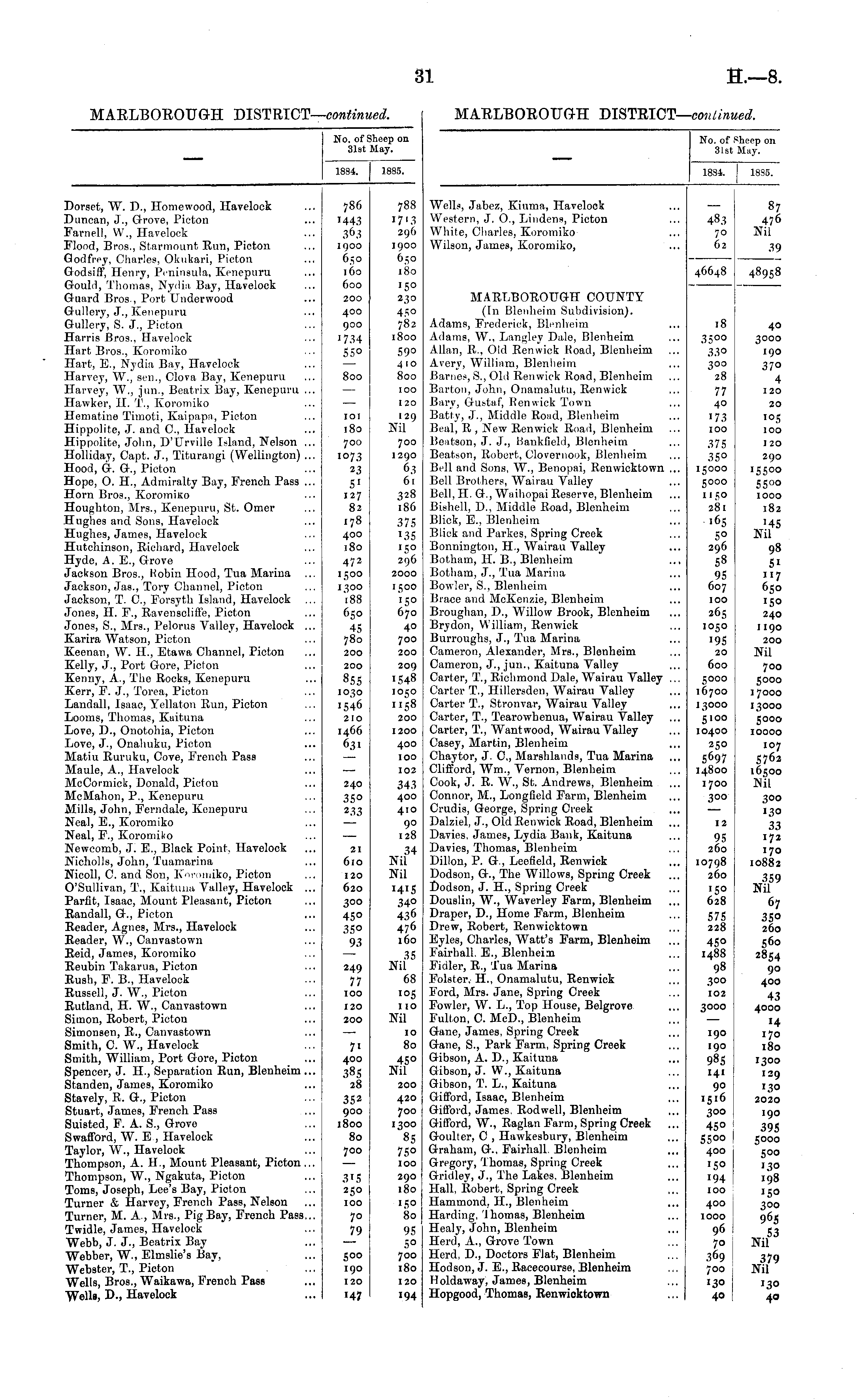 No. of Sheep on 31st May. 1884. | 1885. Dorset, W. D., Homewood, Havelock Duncan, J., Grove, Picton Farnell, VV., Havelock Flood, Bros., Starmount Run, Picton Godfrey, Charles, Okukari, Picton GodsifF, Henry, Peninsula, Kenepuru Gould, Thomas, Nydia Bay, Havelock Guard Bros., Port Underwood Gullery, J., Kenepuru Gullery, S. J., Picton Harris Bros., Havelock Hart Bros., Koromiko Hart, E., Nydia Bay, Havelock Harvey, W., sen., Clova Bay, Kenepuru Harvey, W., jnn., Beatrix Bay, Kenepuru ... Hawker, II. T., Kororm'ko Hematine Timoti, Kaipapn, Picton Hippolite, J. and 0., Havelock Hippolite, John, D'Urville Island, Nelson ... Holliday, Capt. J., Titurangi (Wellington) ... Hood, G. G., Picton Hope, 0. H., Admiralty Bay, French Pass ... Horn Bros., KoromiKO Houghton, Mrs., Kenepuru, St. Omer Hughes and Sons, Havelock Hughes, James, Havelock Hutchinson, Richard, Havelock Hyde, A. E., Grove Jackson Bros., Hobin Hood, Tua Marina Jackson, Jas., Tory Channel, Picton Jackson, T. C, Forayth Island, Havelock Jones, H. F., Ravenscliffe, Picton Jones, S., Mrs., Pelorus Valley, Havelock ... Karira Watson, Picton Keenan, W. H., Etawa Channel, Picton Kelly, J., Port Gore, Picton Kenny, A., The Rocks, Kenepuru Kerr, F. J., Torea, Picton Landall, Isaac, Yellaton Run, Picton Looms, Thomas, Kuituna Love, D., Onotohia, Picton Love, J., Onahuku, Picton Matiu Ruruku, Cove, French Paas Maule, A., Havelock McCormick, Donald, Picton McMahon, P., Kenepuru Mills, John, Ferndale, Kenepuru Neal, E., Koromiko Neal, F., Koromiko Newcomb, J. E., Black Point, Havelock Nicholls, John, Tuamarina Nicoll, C. and Son, Knvoiniko, Picton O'Sullivan, T., Kaituna Valley, Havelock ... Parfit, Isaac, Mount Pleasant, Picton Randall, G., Picton Reader, Agnes, Mrs., Havelock Reader, W., Canvastown Reid, James, Koromiko Reubin Takarua, Picton Rush, F. B., Havelock Russell, J. W., Picton Rutland, H. W., Canvastown Simon, Robert, Picton Simonsen, R., Canvastown Smith, C. W., Havelock Smith, William, Port Gore, Picton Spencer, J. H., Separation Run, Blenheim ... Standen, James, Koromiko Stavely, R. G., Picton Stuart, James, French Pass Suisted, F. A. S., Grove Swafford, W. B , Havelock Taylor, W., Havelock Thompson, A. H., Mount Pleasant, Picton... Thompson, W., Ngakuta, Pioton Toms, Joseph, Lee's Bay, Picton Turner & Harvey, French Pass, Nelson Turner, M. A., Mrs., Pig Bay, French Pass.,. Twidle, James, Havelock Webb, J. J., Beatrix Bay Webber, W., Elmslie's Bay, Webster, T., Picton Wells, Bros., Waikawa, French Pass Wells, D., Havelock 786 1443 1 goo 6i;o 160 600 200 400 900 ■734 55° 800 101 180 700 i°73 23 5 1 127 82 178 400 180 472 1500 1 188 650 45 780 200 200 855 1030 1546 210 1466 631 788 1713 296 1900 6^0 180 '5° 230 450 782 1800 59° 410 800 100 120 129 Nil 700 1290 63 61 328 186 375 i3S '5° 296 2000 1500 '5° 670 40 700 200 209 1548 1050 1158 200 1200 400 100 102 240 35° 233 21 610 120 620 343 400 410 90 128 34 Nil Nil 34° 436 476 160 300 45° 35° 93 249 77 100 35 Nil 68 105 no Nil 120 200 7 1 400 385 28 35 2 900 1800 80 700 10 80 45° Nil 200 420 700 1300 8S 75° 100 3'5 250 100 70 79 290 180 80 500 190 120 H7 95 5° 700 180 120 194