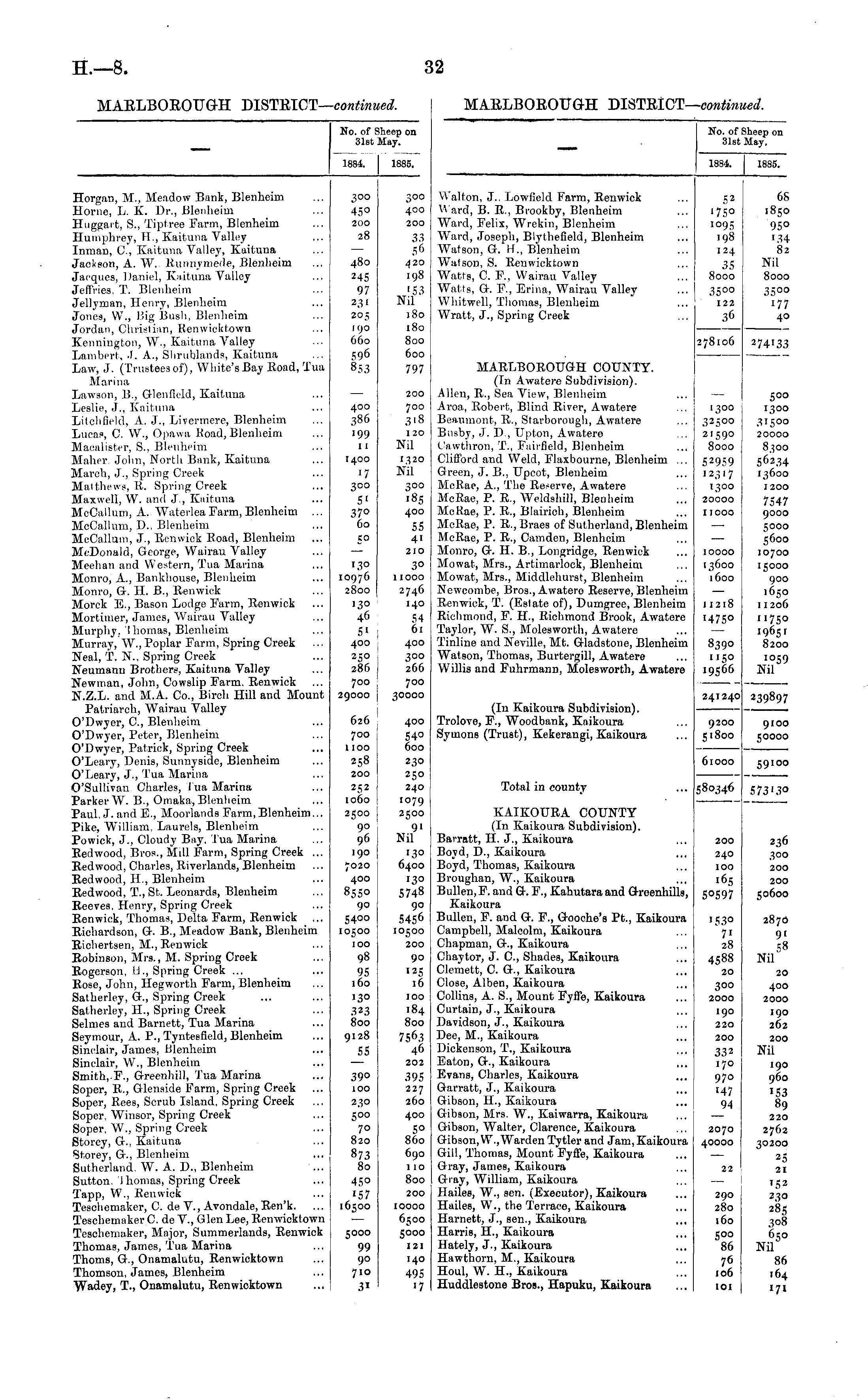 No. of Sheep on 31st May. 1884. | 1885. Walton, J.. Lowfleld Farm, Renwick Ward, B. R., Brookby, Blenheim Ward, Felix, Wrekin, Blenheim Ward, Joseph, Blythefield, Blenheim Watson, G. H., Blenheim Watson, S. Renwicktown Watts, C. F., Wairau Valley Watts, G. F., Brina, Wairau Valley Whitwell, Thomas, Blenheim Wratt, J., Spring Creek 5 2 '75° IO95 198 124 35 8000 6S 1850 95° '34 82 Nil 8000 35°° 122 36 278106 35 00 177 40 MARLBOROUGH COUNTY. (In Awatere Subdivision). Alien, R., Sea View, Blenheim Aroa, Robert, Blind River, Awatere Beaumont, R., Starborough, Awatere Busby, J. D , Upton, Awatere Cawthron, T., Fail-field, Blenheim Clifford and Weld, Flaxbourne, Blenheim ... Green, J. B., Upcot, Blenheim McRae, A., The Reserve, Awatere McRae, P. R., Weldshill, Blenheim McRae, P. R., Blaiiiob, Blenheim McRae, P. R., Braes of Sulherland, Blenheim McRae, P. R., Camden, Blenheim Monro, G. H. B., Longridge, Renwick Mowat, Mrs., Artimarlock, Blenheim Mowat, Mrs., Middlehurst, Blenheim Newcombe, Bros., Awatere Reserve, Blenheim Renwick, T. (Estate of), Dumgree, Blenheim Richmond, F. H., Richmond Brook, Awatere Taylor, W. S., Molesworth, Awatere Tinline and Neville, Mt. Gladstone, Blenheim Watson, Thomas, Burtergill, Awatere Willis and Fuhrmann, Molesworth, Awatere 274133 1300 32.5 00 21590 8000 52959 I23'7 1300 20000 11000 500 1300 3'500 20000 8300 56234 13600 1200 7547 9000 5000 5600 10700 15000 900 1650 11206 11750 19651 8200 10000 13600 1600 1 l.'l.S 14750 8390 1150 19566 IO59 Nil (In Kaikoura Subdivision). Trolove, F., Woodbank, Kaikoura Symons (Trust), Kekerangi, Kaikoura 241240 9200 51800 61000 239897 9100 50000 Total in county 59100 580346 573'30 KAIKOURA COUNTY (In Kaikoura Subdivision). Bavratt, H. J., Kaikoura Boyd, D., Kaikoura Boyd, Thomas, Kaikoura Broughan, W., Kaikoura Bullen.F. and G. F., Kahutaraand Greenhills, Kaikoura Bullen, F. and G. F., Goodie's Pt., Kaikoura Campbell, Malcolm, Kaikoura Chapman, G., Kaikoura Chaytor, J. C, Shades, Kaikoura Clemett, C. G., Kaikoura Close, Alben, Kaikoura Collins, A. S., Mount Fyffe, Kaikoura Curtain, J., Kaikoura Davidson, J., Kaikoura Dee, M., Kaikoura Dickenson, T., Kaikoura Eaton, Or., Kaikoura Evans, Charles, Kaikoura Garratt, J., Knikoura Gibson, H., Kaikoura Gibson, Mrs. W., Kaiwarra, Kaikoura Gibson, Walter, Clarence, Kaikoura Gibson,W.,Warden Tytler and Jam, Kaikoura Gill, Thomas, Mount Fyffe, Kaikoura Gray, James, Kaikoura Gray, William, Kaikoura Hailes, W., sen. (Executor), Kaikoura Hailes, W., the Terrace, Kaikoura Harnett, J., sen., Kaikoura Harris, H., Kaikoura Hately, J., Kaikoura Hawthorn, M., Kaikoura Houl, W. H., Kaikoura Huddlestone Bros., Hapuku, Kaikoura 200 240 100 165 50597 153° 7 1 28 4588 20 300 2000 190 220 200 33 2 170 97° '47 94 236 300 200 200 50600 2870 91 58 Nil 20 400 2000 190 262 200 Nil 2070 40000 22 190 960 «53 89 220 2762 30200 25 21 '52 230 285 308 650 Nil 86 164 171 290 i 280 I 160 5°o 86 76 106 101