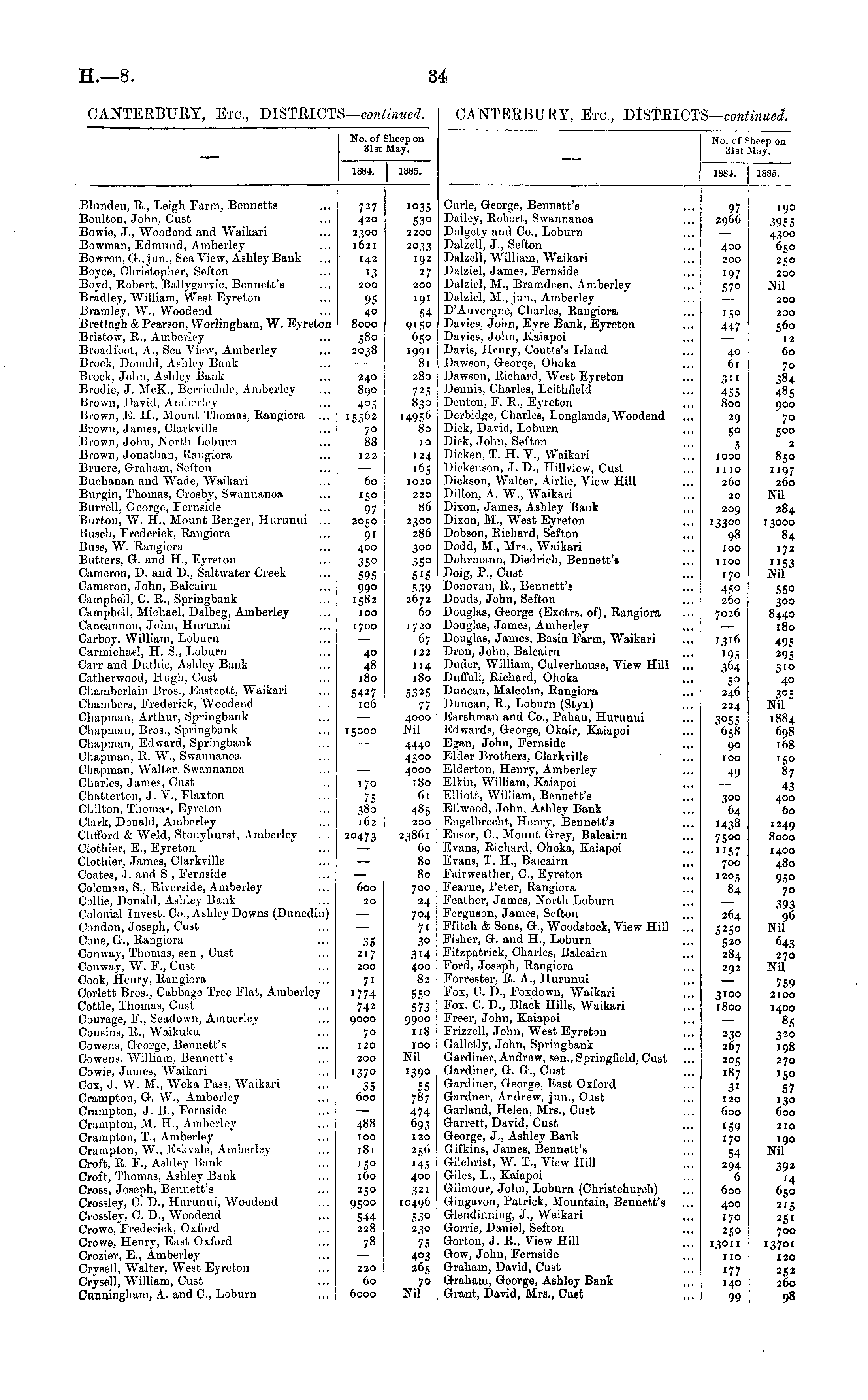 '0. of Sheep on 31st May. 1884. | 1885. Blunden, R., Leigh Farm, Bennetts Boulton, John, Cust Bowie, J., Woodend and Waikari Bowman, Edmund, Amberley Bowron, Gk, jun., Sea View, Ashley Bank Boyce, Christopher, Sefton Boyd, Robert, Ballygarvie, Bennett's Bradley, William, West Eyreton U ramie v, W., Woodend Brettagh & Pearson, Worlingham, W. Eyreton Bristow, R., Amberley Broadfoot, A., Sea View, Amberley Brock, Donald, Ashley Bank Brock, John, Ashley Bank Brodie, J. McK., Berriedalo, Amberley Brown, David, Amberley Brown, E. H., Mount Thomas, Rangiora Brown, James, Clarkville Brown, John, North Loburn Brown, Jonathan, Kangiora Bruere, Graham, Sefton Buchanan and Wado, Waikari Burgin, Thomas, Crosby, Swannauoa Burrell, Greorge, Fernside Burton, W. H., Mount Benger, Hiirunui ... Busch, Frederick, Rangiora Buss, W. Rangiora Butters, GK and H., Eyreton Cameron, D. and D., Saltwater Creek Cameron, John, Balcairn Campbell, C. R., Springbank Campbell, Michael, Dalbeg, Amberley Cancannon, John, Hurunui Carboy, William, Loburn Cariniehael, H. S., Loburn Carr and Duthie, Ashley Bank Cathcrwood, Hugh, Cust Chamberlain Bros., Eastcott, Waikari Chambers, Frederick, Woodend Chapman, Arthur, Springbank Chapman, Bros., Springbank Chapman, Edward, Springbank Chapman, R. W., Swannanoa Chapman, Walter. Swannanoa Charles, James, Cust Chatterton, J. V., Flaxton Chilton, Thomas, Eyretou Clark, Donald, Amberley Clifford & Weld, Stonyhurst, Amberley Clothier, E., Eyreton Clothier, James, Clarkville Coates, J. and S , Fernside Coleman, S., Riverside, Amberley Collie, Donald, Ashley Bank Colonial Invest. Co., Ashley Downs (Dunedin) Condon, Joseph, Cust Cone, GK, Rangiora Conway, Thomas, sen , Cust Conway, W. F., Cust Cook, Henry, Rangiora Corlett Bros., Cabbage Tree Flat, Amberley Cottle, Thomas, Cust Courage, F., Seadown, Amberley Cousins, R., Waikuku Cowens, George, Bennett's Cowens, William, Bennett's Cowie, James, Waikari Cox, J. W. M., Weka Pass, Waikari Crampton, GK W., Amberley Crampton, J. B., Fernside Crampton, M. H., Amberley Crampton, T., Amberley Crampton, W., Eskvnle, Amberley Croft, R. F., Ashley Bank Croft, Thomas, Ashley Bank Cross, Joseph, Bennett's Crossley, C. D., Hurunui, Woodend ...J Crossley, C. D., Woodend Crowe, Frederick, Oxford Crowe, Henry, East Oxford Crozier, E., Amberley Crysell, Walter, West Eyreton Crysell, William, Cust Cunningham, A. and C, Loburn 727 420 2300 1621 142 «3 200 95 40 8000 580 2038 240 890 4°5 i55 62 7° 88 122 60 '5° 97 2050 9' 400 35° S9S 99° 1582 100 1700 40 48 180 5427 106 15000 1035 530 2200 2033 192 27 200 i 9 i 54 9150 650 1991 81 280 725 830 14956 80 10 124 1020 220 86 2^00 286 300 35° 5i5 539 2672 60 1720 67 122 114 180 5325 77 4000 Nil 4440 4300 4000 180 61 485 200 2 3861 60 80 80 170 75 :?8o "162 20473 600 2O 700 24 704 7' 3° 3'4 400 82 55° 573 9900 118 100 Nil H 217 200 7' 1774 742 9000 7° 120 200 '37° 35 600 '39° 55 787 474 693 120 256 MS 400 321 10496 53° 230 75 4°3 265 70 Nil 488 100 181 T 100 250 9500 544 228 78 220 60 6000