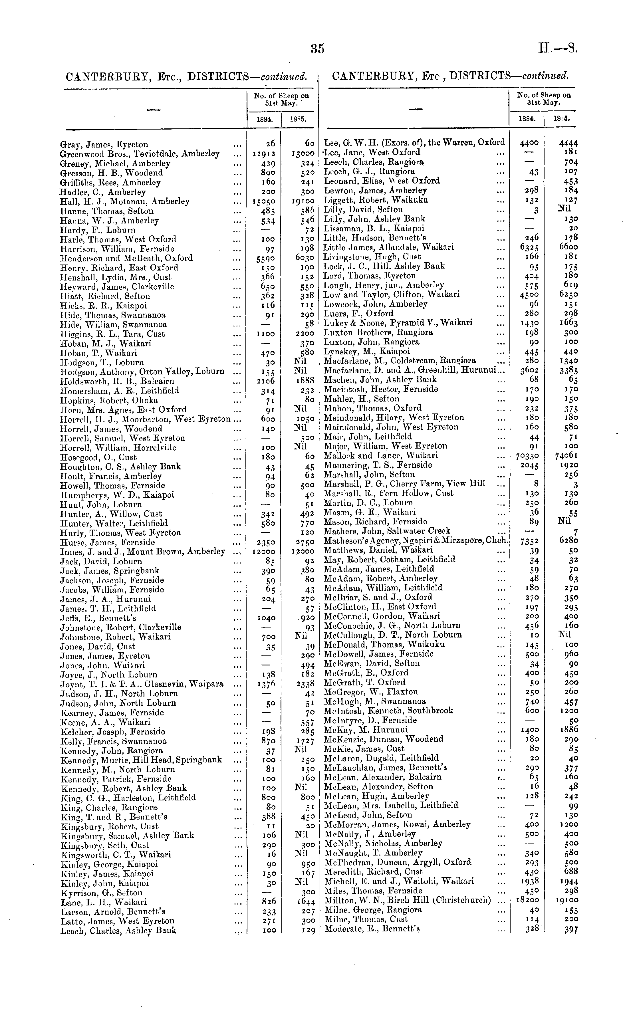 No. of Sheep on 31st May. ' 1884. I 1835. Gray, James, Eyreton Greenwood Bros., Teviotdale, Amberley Greney, Michael, Amberley Gresson, II. B., Woodend Griffiths, Rees, Amberley Hadler, C, Amberley Hall, II. J., Motanau, Amberley Hanna, Thomas, Sef'ton Hanna, W. J., Amberley Hardy, F., Loburn Harle, Thomas, West Oxford Harrison, William, Fernside Henderson and McBeath, Oxford Henry, Richard, East Oxford Henshall, Lydia, Mrs., Oust Heyward, James, Clarkeville Hiattf, Richard, Sefton Hicks, R. It., Kaiapoi Hide, TJiomas, Swannanoa Hide, William, Swannanoa Higgins, R. L., Tara, Cust Hoban, M. J., Waikari Hoban, T., Waikari Hodgson, T., Loburn Hodgson, Anthony, Orton Valley, Loburn ... Holdswortb, R. B., Balcairn Homersham, A. R., Leitbfield Hopkins, Kobert, Olioka Horn, Mrs. Agnes, East Oxford llorrell, H. J., Moorbarton, West Eyreton ... Horrell, James, Woodend Horrell, Samuel, West Eyreton Horrell, William, Horrelville Hosegood, O., Cust Houghton, C. S., Ashley Bank Hoult, Francis, Amberley Howell, Thomas, Fernside Humpherys, W. D., Kaiapoi Hunt, John, Loburn Hunter, A., Willow, Cust Hunter, Walter, Leithfield Hurly, Thomas, West Eyreton Hurse, James, Fernside Innes, J. and J., Mount Brown, Amberley .., Jack, David, Loburn Jack, James, Springbank Jackson, Joseph, Fernside Jacobs, William, Fernside James, J. A., Hurunui James, T. IL, Leithfield Jeffs, E., Bennett's Johnstone, Robert, Clarkeville Jolmstone, Robert, Waikari Jones, David, Cust Jones, James, Eyreton Jones, John, Waikari Joyce, J., Korth Loburn Joynt, T. I. & T. A., Glasnevin, Waipara ... J nelson, J. II., North Loburn Judson, John, North Loburn Kearney, James, Fernside Keene, A. A., Waikari Kelcher, Joseph, Fernside Kelly, Francis, Swannanoa Kennedy, John, Rangiora Kennedy, Murtie, Hill Head, Springbank Kennedy, M., Norlh Loburn Kennedy, Patrick, Fernside Kennedy, Robert, Ashley Bank King, C. G., Harleston, Leithfield King, Charles, Rangiora King, T. and B , Bennett's Kingsbury, Robert, Oust Kingsbury, Samuel, Ashley Bank Kingsbury, Seth, Cust Kiugsworth, C. T., Waikari Kinley, George, Kaiapoi Kinley, James, Kaiapoi Kinley, John, Kaiapoi Kyrrison, G., Sefton Lane, L. H., Waikari Larsen, Arnold, Bennett's Latto, James, West Eyreton Leach, Charles, Ashley Bank 26 60 13000 324 520 241 300 19 100 586 546 72 130 198 6030 190 '5* 55° 328 "5 290 58 2200 37° 580 Nil Nil 1888 12912 429 8i)o 160 200 150.S 0 485 534 100 97 559° 1 so 366 650 362 116 9< 1100 470 3° >5(S 2IC6 3>4 7i 9' 600 232 80 Nil 1050 Nil 140 100 180 i;oo Nil 60 45 62 43 94 90 80 500 40 5 1 492 770 120 275° 12000 92 380 80 43 270 57 .920 93 Nil 342 580 235° 12000 85 39° 59 65 204 1040 700 35 39 290 494 182 2338 42 S1 70 557 285 1727 Nil 250 ■5° 160 Nil 800 •38 >376 5° 198 870 37 100 81 100 TOO 800 80 388 I [ 106 290 16 51 45° 20 Nil 300 Nil 90 ]5° 3° 826 233 100 95° ■ 67 Nil 300 1644 207 300 129