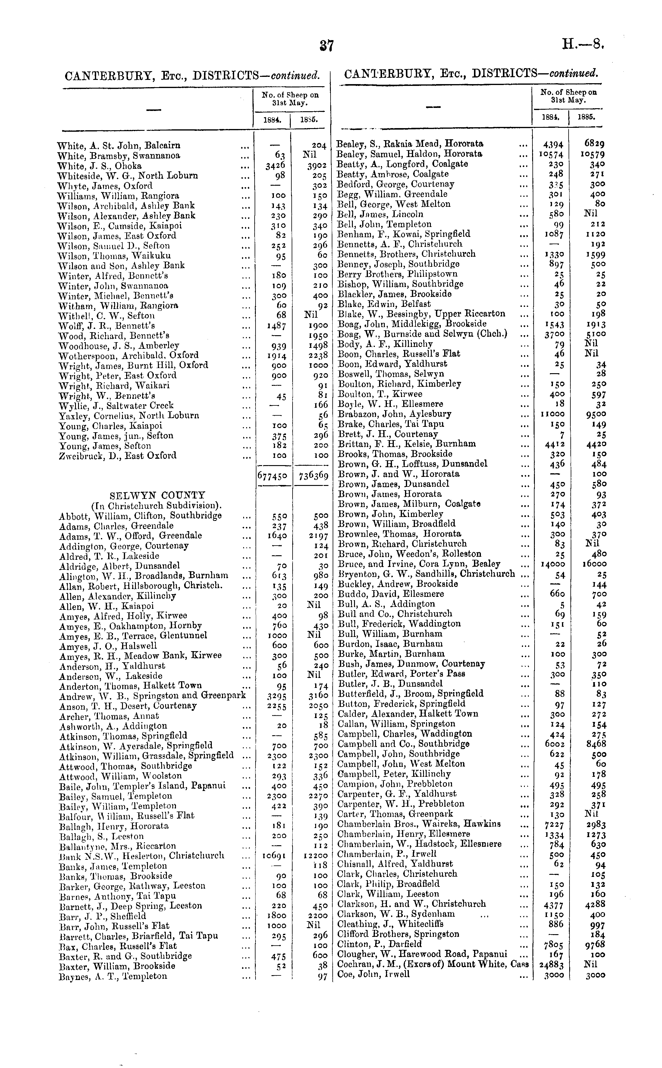 No. of Sheep on 31st May. 1884. I 18=5. White, A. St. John, Balcaim White, Bramsby, Swannanoa White, J. S., Ohoka Whiteside, W. G-., North Loburn Whyte, James, Oxford Williams, William, Eangiora Wilson, Archibald, Ashley Bank Wilson, Alexander, Ashley Bank Wilson, E., Camside, Kaiapoi Wilson, James, East Oxford Wilson, Samuel D., Sefton Wilson, Thomas, Waikuku Wilson and Son, Ashley Bank Winter, Alfred, Bennett's Winter, John, Swannanoa Winter, Miehnel, Bennett's Witham, William, Eangiom Withell, C.W., Sefton Wolff, J. E., Bennett's Wood, Eiehard, Bennett's Woodhouse, J. S., Amberley Wotherspoon, Archibald, Oxford Wright, James, Burnt Hill, Oxford Wright, Peter, East Oxford Wright, Eiehard, Waikari Wright, W., Bennett's Wyllie, J., Saltwater Creek Yaxley, Cornelius, North Loburn Young, Charles, Kaiapoi Young, James, Jan., Sefton Young, James, Softon Zweibruck, U., East Oxford 63 3426 1 S 100 143 230 3'° 82 25 2 95 180 109 300 60 68 1487 204 Nil 3902 205 302 J5° i.S4 290 34° 190 296 60 300 100 210 400 92 Nil 1900 '95° 1498 2238 1000 939 1914 900 900 45 920 91 81 166 56 65 296 200 100 375 182 100 100 SELWYN COUNTY (In Chriltohuroh Subdivision). Abbott, William, Clifton, Southbridge Adams, Charles, G-reendale Adams, T. W., Offord, Greendale Addington, George, Courtenay Aldred, T. E., Lakeside Aldridge, Albert, Dunsandel Alington, W. H., Broadlands, Burnliam Allan, Eobert, Hillsborough, Christch. Allen, Alexander, Killinchy Allen, W. U., Kuiapoi Amyes, Alfred, Holly, Kirweo Amyes, E., Oakliampton, Hornby Amyes, E. B., Terrace, Glenlunnel Amyes, J. O., Halswell Amyes, E. H., Meadow Bank, Kirwee Anderson, H., Yaldhurst Anderson, W., Lakeside Anderton, Tliomas, Halkett Town Andrew, W. B., Springston and Greenpark Anson, T. H., Desert, Courtenay Archer, Tliomas, Annat Ashworth, A., Addington Atkinson, Thomas, Springfield Atkinson, W. Ayersdale, Springfield Atkinson, William, Grassdale, Springfield ... Attwood, Thomas, Southbridge Attwood, William, Woolston Baile, John, Templer's Island, Papanui Bailey, Samuel, Temple! on Bailey, William, Templeton Balfo'ur, V\ iiliam, Eussell's Flat Ballagh, Henry, Hororata Ballftgh, S., Leeston Ballantyne, Mrs., Ricearton Bank N.S.W., Heslerton, Christchurch Banks, James, Templeton Banks, Tliomas, Brookside Barker, George, Kathway, Leeston Barnes, Anthony, Tai Tapu Barnett, J., Deep Spring, Leeston Barr, J. P., Sheffield Barr, John, Russell's Flat Barrett, Charles, Briarfield, Tai Tapu Bax, Charles, Eussell's Flat Baxter, E. and &., Southbridge Baxter, William, Brookside Baynes, A. T., Templeton 6774SO 736369 SS° 237 1640 500 438 2197 124 201 3° 980 149 200 Nil 7° 6,3 '35 300 20 400 760 1000 600 98 43° Nil 600 300 56 100 95 3295 2255 20 700 2300 j 122 ! 500 240 Nil »74 3160 2050 125 18 585 700 2300 "52 336 45° 2270 39° '39 190 250 112 293 400 I 2300 422 I 18. ! 200 10691 12200 118 90 100 68 220 1800 100 1000 295 100 68 45° 2200 Nil 296 100 600 38 97 475 52
