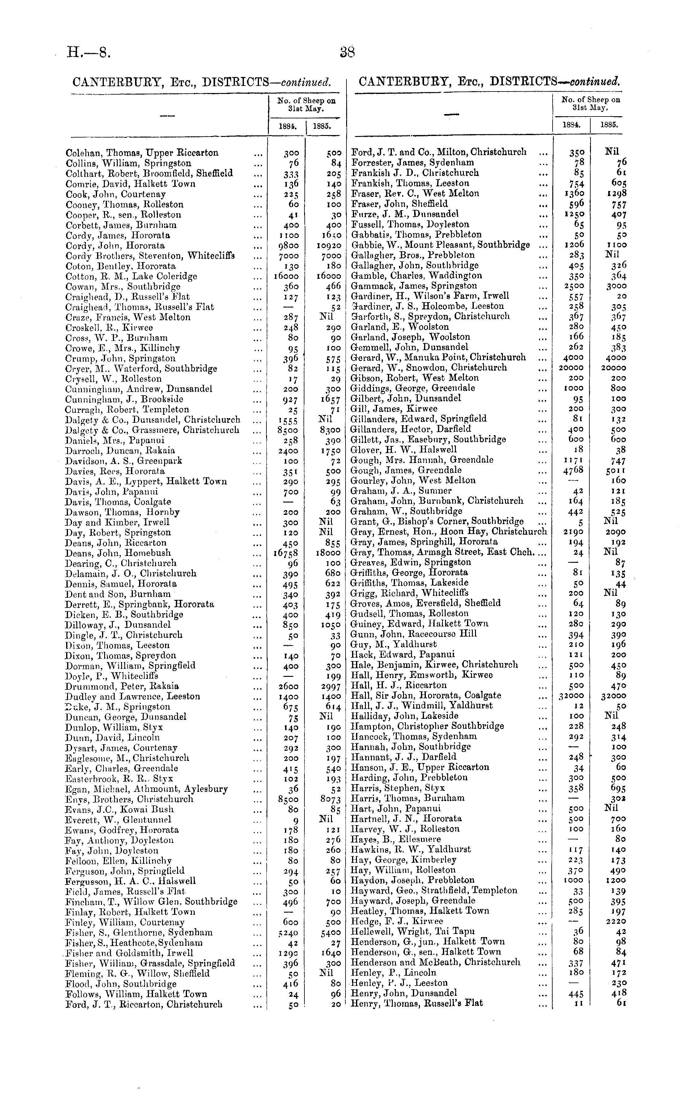 No. of Sheep on 31st May. 1884. 1885. Ford, J. T. and Co., Milton, Ohrittohuroh ... Forrester, James, Sydenham Frankish J. D., Christchurck Prankish, Thomas, Leeston Fraser, Rev. C, West Melton Truer, John, Sheffield Furze, J. M., Dimsandel Fusiell, Thomas, Doyleston Gabbatis, Thomas, Prehbleton Gabbie, W., Mount Pleasant, Southbridge ... Gallagher, Bros., Prebbleton Gallagher, John, Southbridge Gamble, Charles, Waddington Gammack, James, Springston Gardiner, II., Wilson's Farm, Irwell 3-ardiner, J. S., Holcombe, -Leeston 3-arforth, S., Spreydon, Christchureh Garland, B., Woolston Garland, Joseph, Woolston Geminell, John, Dunsandel Gerard, W., Manuka Point, Christehurch Gerard, W., Snowdon, Christchurch Gibson, Kobert, West Melton Giddings, George, Greendale Gilbert, John, Dunsandel Gill, James, Kirwee Gillanders, Edward, Springfield Gillanders, Hector, Darfield Gillett, Jas., Easebury, Southbridge Glover, II. W., Halswell Gough, Mrs. Hannah, Greendale Gough, James, Greendale Gourley, John, West Melton Graham, J. A., Sumner Graham, John, Burnbank, Christclmrch Graham, W., Soutlibvidge Grant, G-., Bishop's Corner, Southbridgo Gray, Ernest, Hon., Hoon Hay, Christehureh Gray, James, Springhill, Hororala Gray, Thomas, Armagh Street, East Chen. ... Greaves, Edwin, Springston Griffiths, G-eorge, Hororata Griffiths, Thomas, Lakeside Grigg, Richard, Whiteeliffs Groves, Amos, Eversfield, Sheffield Gudsell, Thomas, Rolleston G-uiney, Edward, Halkett Town Gunn, John, Racecourso Hill Gruy, II., Yaldhurst Hack, Edward, Papanui Hale, Benjamin, Kirwee, Christchureh Hall, Henry, Emsworth, Kirwee Hall, H. J., Kiccarton Hall, Sir John, Hororata, Coalgate Hall, J. J., Windmill, Yaldhurst Halliday, John, Lakeside Hampton, Christopher Southbridge Hancock, Thomas, Sydenham Hannah, John, Southbridge Hannant, J. J., Darfield Hanson, J. E., Upper Riccarton Harding, John, l'rcbbleton Harris, Stephen, Styx Harris, Thomas, Burnham Hart, John, Papanui Hartnell, J. N., Hororata Harvey, VV. J., Rolleston Hayes, B., Ellesmere Hawkins, R. W, Yaldhurst Hay, George, Kimberley Hay, William, Rolleston Haydon, Joseph, Prebbleton Hayward, Geo., Slrathfield,Templeton Hay ward, Joseph, Greendale Heatley, Thomas, Ilttlkett Town Hedge, F. J., Kirwee Hellewell, Wright, Tai Tapu Henderson, Gh, jun., Halkett Town Henderson, G\, sen., Halkett Town Henderson and McBeath, Christchureh Henley, P., Lincoln Henley, V. J., Leeston Henry, John, Dunsandel Henrv, Thomas, Russell's Flat 35° 78 85 754 1360 596 1250 65 5° 1206 283 4°5 35° 2500 557 258 367 280 166 262 4000 20000 200 1000 95 200 8i 400 600 18 1171 4768 42 164 442 5 2190 194 24 81 Nil 7 6 6i 605 1298 757 407 95 5° 1100 Nil 3*6 3°oo 20 3°5 367 450 ■85 383 4000 20000 200 800 100 300 132 500 600 38 747 5011 160 121 18S 52s Nil 2090 192 Nil 87 i35 44 Nil 89 130 290 39° 196 200 45° 89 470 32000 5° Nil 5° 200 64 120 280 394 210 121 5°° 110 500 32000 12 100 228 292 248 3'4 100 248 34 300 358 300 60 500 695 302 Nil 700 160 80 140 '73 490 1200 500 500 100 117 223 37° 1000 3^ 500 =8 S '39 395 197 2220 36 80 68 337 180 42 98 84 47' 172 230 418 61 445 11