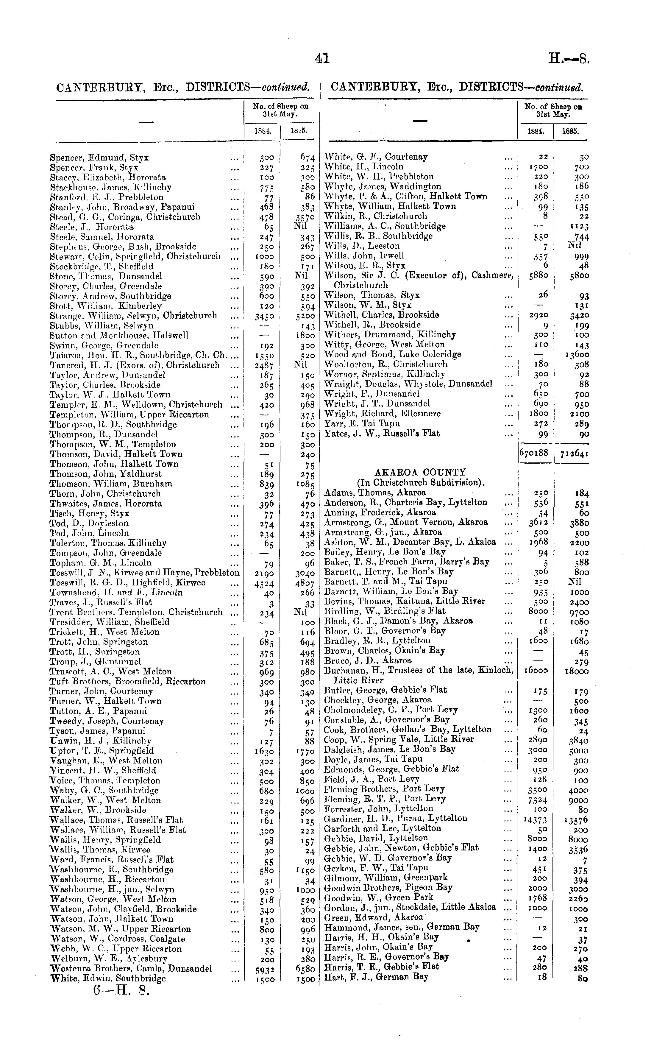 No. of Sheep on 31st May. 1881. I 1885. White, G. F., Courtenay White, H., Lincoln White, W. H., I'rebbleton Whyte, James, Waddington Wliyte, P. & A., Clifton, Halkett Town Whyte, William, Halkett Town Wil'kin, R., Christenurch Williams, A. C, South bridge Willis, R. B., Southbridge Wills, D., Leeston Wills, John, Irwcll Wilson, E. R., Styx Wilson, Sir J. C. (Executor of), Cashmere, Christchurch Wilson, Thomas, Styx Wilson, W. M., Styx Withell, Charles, Brookside Withell, R., Brookside Wither?, Drummond, Killinchy Witty, George, West Melton Wood and Bend, Lake Coleridge Wooltorton, R., Christohurch Wornor, Septimus, Kiliincliy Wraight, Douglas, Whystole, Dunsandel Wright, F., Dunsandel" Wright, J. T., Dunsandel Wright, Richard, Ellesinere Yarr, E. Tai Tapu YateB, J. W., Russell's Mat 22 1700 220 ! l8o 398 99 8 3° 7oo 3oo i86 55° '35 22 11 23 744 Nil 999 48 5800 55° 7 357 6 5880 26 93 131 3420 .'99 100 '43 13600 '308 92 88 700 95° 2100 289 90 712641 2920 9 300 1 ro 180 300 ■70 650 690 1800 272 99 670188 AKAROA COUNTY (In Christchureh Subdivision). Adams, Thomas, Akaroa Anderson, R., Charteris Bay, Lyttelton Anning, Frederick, Akaroa Armstrong, G., Mount Vernon, Akaroa Armstrong, G.,jun., Akaroa Ashton, W. M., Decanter Bay, L. Akaloa ... Bailey, Henry, Le Bon's Bay Bnker, T. S., French Farm, Barry's Bay Barnett,, Henry, Le Bon's Bay Barnett, T. and M., Tai Tapu Barnett, William, Le Eon's Bay Bevins, Thomas, Kaituna, Little River Birdling, W., Birdling's Flat Black, G. J., Damon's Bay, Akaroa Bloor, G. T., Governor's Bay Bradley, R. R., Lyttelton Brown, Charles, Okain's Bay Bruce, J. D., Akaroa Buchanan, H., Trustees of the late, Kinloch, Little River Butler, George, Gebhie's Flat Checkley, George, Akaroa Cholmondeley, C. P., Port Levy Constable, A., Governor's Bay Cook, Brothers, Gollan's Bay, Lyttelton Coop, W., Spring Vale, Little River Dalgleish, James, Le Bon's Bay Doyle, James, Tai Tapu Edmonds, George, Gebbie's Flat Field, J. A., Port Levy Fleming Brothers, Port Levy Fleming, R. T. P., Port Levy Forrester, John, Lyttelton Gardiner, H. D., Purau, Lyttelton Garforth and Lee, Lyttelton Gebbie, David, Lyttelton Gebbie, John, Newton, Gebbie's Flat Gebbie, W. D. Governor's Bay Gerken, F. W., Tai Tapu Gilmour, William, Greenpark Goodwin Brothers, Pigeon Bay Goodwin, W., Green Park Gordon, J., jun., Stockdale, Little Akaloa ... Green, Edward, Akaroa Hammond, James, sen., German Bay Harris, H. H.. Okain's Bay Harris, John, Okain's Bay Harris, R. E., Governor's Bay Harris, T. E., Gebbie's Flat Hart, F. J., German Bay 250 556 54 3612 500 1968 94 5 306 250 935 500 8000 11 48 1600 16000 ■75 1300 260 60 2890 3000 200 184 60 3880 500 2200 102 588 800 Nil 1000 2400 9700 1080 >7 1680 45 279 18000 '79 500 1600 345 24 3840 5000 300 900 100 4000 9000 80 13576 200 8000 3536 7 375 394 3000 2260 95° 128 35°° 7324 ico H.573 5° 8000 1400 12 45i 200 2000 1768 1000 1000 300 21 12 200 47 280 18 37 270 40 28S 80