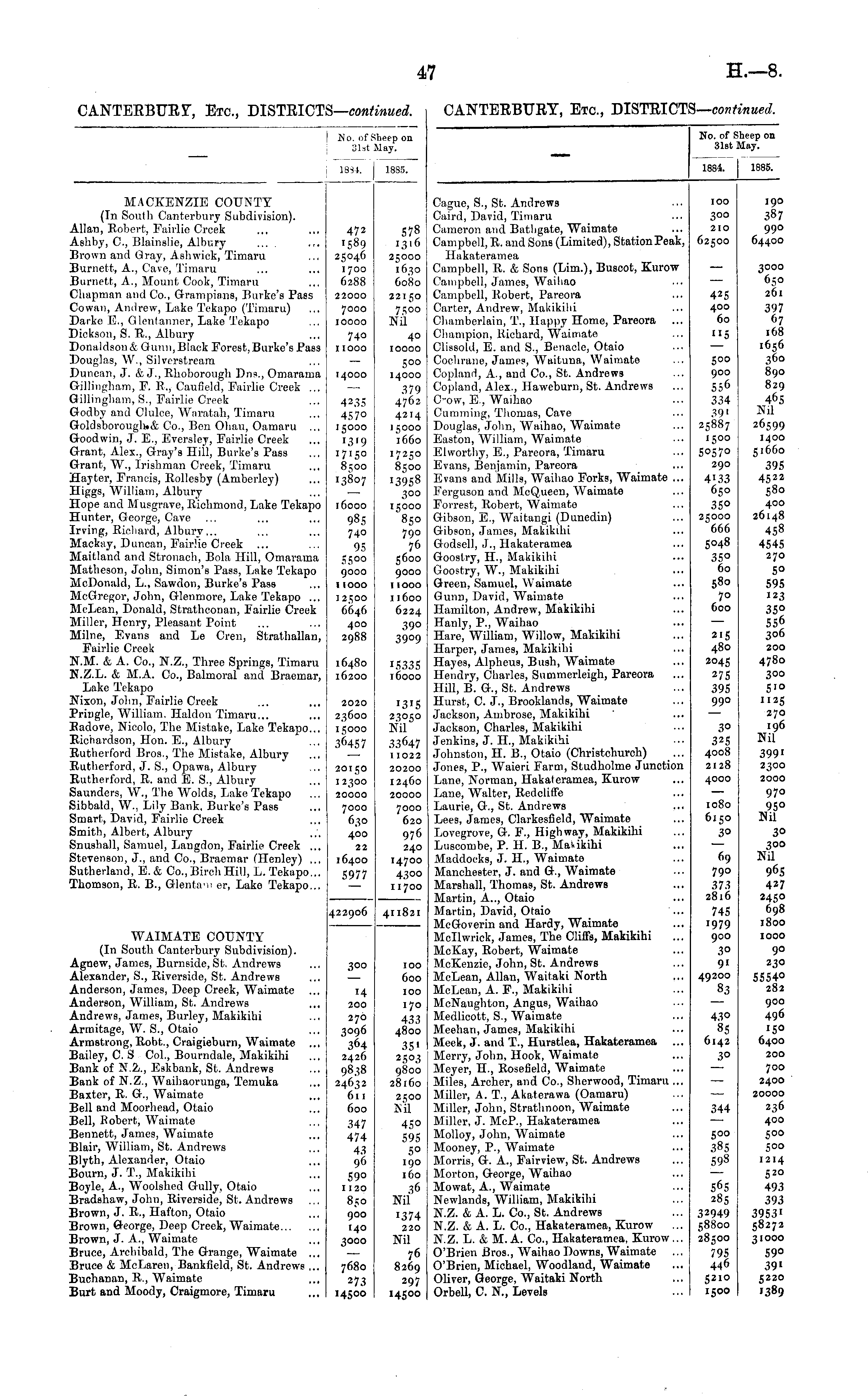 No. of f 31st >heep on May. I 1885. 1834. Cague, S., St. Andrews Caird, David, Timaru Cameron and Bathgate, Waimate Campbell, E. and Sons (Limited), StationPeak, Hakateramea Campbell, E. & Sons (Lim.), Busoot, Kurow Campbell, James, Wailiao Campbell, Robert, Pareora Carter, Andrew, Makikihi Chamberlain, T., Happy Home, Pareora Clmmpion, Richard, Waimate Clissold, E. and S., Benacle, Otaio Cochrane, James, Waituna, Waimate Copland, A., and Co., St. Andrews Copland, Alex., Haweburn, St. Andrews Ow, E., Waihao dimming, Thomas, Cave Douglas, John, Waihao, Waimate Easton, William, Waimate Elworthy, E., Pareora, Timaru Evans, Benjamin, Pareora Evans and Mills, Wailiao Forks, Waimate ... Ferguson and McQueen, Waimate Forrest, Robert, Waimate Gibson, E., Waitangi (Dunedin) Gibson, James, Makikihi Godsell, J., Hakateraniea Goostry, H., Makikihi Goostry, W., Makikihi Green, Samuel, Waimate Gunn, David, Waimate Hamilton, Andrew, Makikihi Hanly, P., Waihao Hare, William, Willow, Makikihi Harper, James, Makikihi Hayes, Alpheus, Bush, Waimate Hendry, Charles, Siimmerleigh, Pareora Hill, B. G., St. Andrews Hurst, C. J., Brooklands, Waimate Jackson, Ambrose, Makikihi Jackson, Charles, Makikihi Jenkins, J. H., Makikihi Johnston, H. B., Otaio (Christchurch) Jones, P., Waieri Farm, Studholme Junction Lane, Norman, Hakateramea, Kurow Lane, Walter, Eedcliffe Laurie, G., St. Andrews Lees, James, Clarkesfield, Waimate Lovegrove, G. F., Highway, Makikihi Luscombe, P. H. B., Makikihi Maddoeks, J. H., Waimate Manchester, J. and G., Waimate Marshall, Thomas, St. Andrews Martin, A.., Otaio Martin, David, Otaio ... McGoverin and Hardy, Waimate Mcllwrick, James, The Cliffs, Makikihi McKay, Robert, Waimate McKenzie, John, St. Andrews McLean, Allan, Waitaki North McLean, A. F., Makikihi McNaughton, Angus, Waihao Medlicott, S., Waimate Meehan, James, Makikihi Meek, J. and T., Hurstlea, Hakateramea ... Merry, John, Hook, Waimate Meyer, H., Eosefield, Waimate Miles, Archer, and Co., Sherwood, Timaru ... Miller, A. T., Akaterawa (Oamaru) Miller, John, Strathnoon, Waimate Miller, J. MeP., Hakateramea Molloy, John, Waimate Mooney, P., Waimate Morris, G. A., Fairview, St. Andrews Morton, George, Waihao Mowat, A., Waimate Newlands, William, Makikihi N.Z. & A. L. Co., St. Andrews N.Z. & A. L. Co., Hakateramea, Kurow N.Z. L. & M. A. Co., Hakateramea, Kurow... O'Brien Bros., Waihao Downs, Waimate O'Brien, Michael, Woodland, Waimate Oliver, George, Waitaki North Orbell, C. N., Levels 100 300 2IO 62500 425 400 60 "5 500 900 556 334 39' 25887 1500 50570 290 4'33 650 35° 25000 666 5048 35° 60 580 7° 600 215 480 2045 275 395 99° 3° 325 4008 2128 190 387 990 64400 3000 6^0 261 397 67 168 1656 360 890 829 465 Nil 26599 1400 51660 395 4522 580 400 26148 458 4545 270 5° 595 123 35° 556 306 200 478o 300 5'° 1125 270 196 Nil 399i 2300 2000 970 95° Nil 4000 1080 6150 30 69 790 373 2816 745 1979 900 3° 9 1 49200 83 3° 300 Nil 965 427 2450 698 1800 1000 90 230 55540 282 430 85 6142 3° 344 500 385 598 565 285 32949 58800 28500 795 446 5210 1500 900 496 '5° 6400 200 700 2400 20000 236 400 500 500 1214 520 493 393 395.31 58272 31000 59° 39' 5220 1389