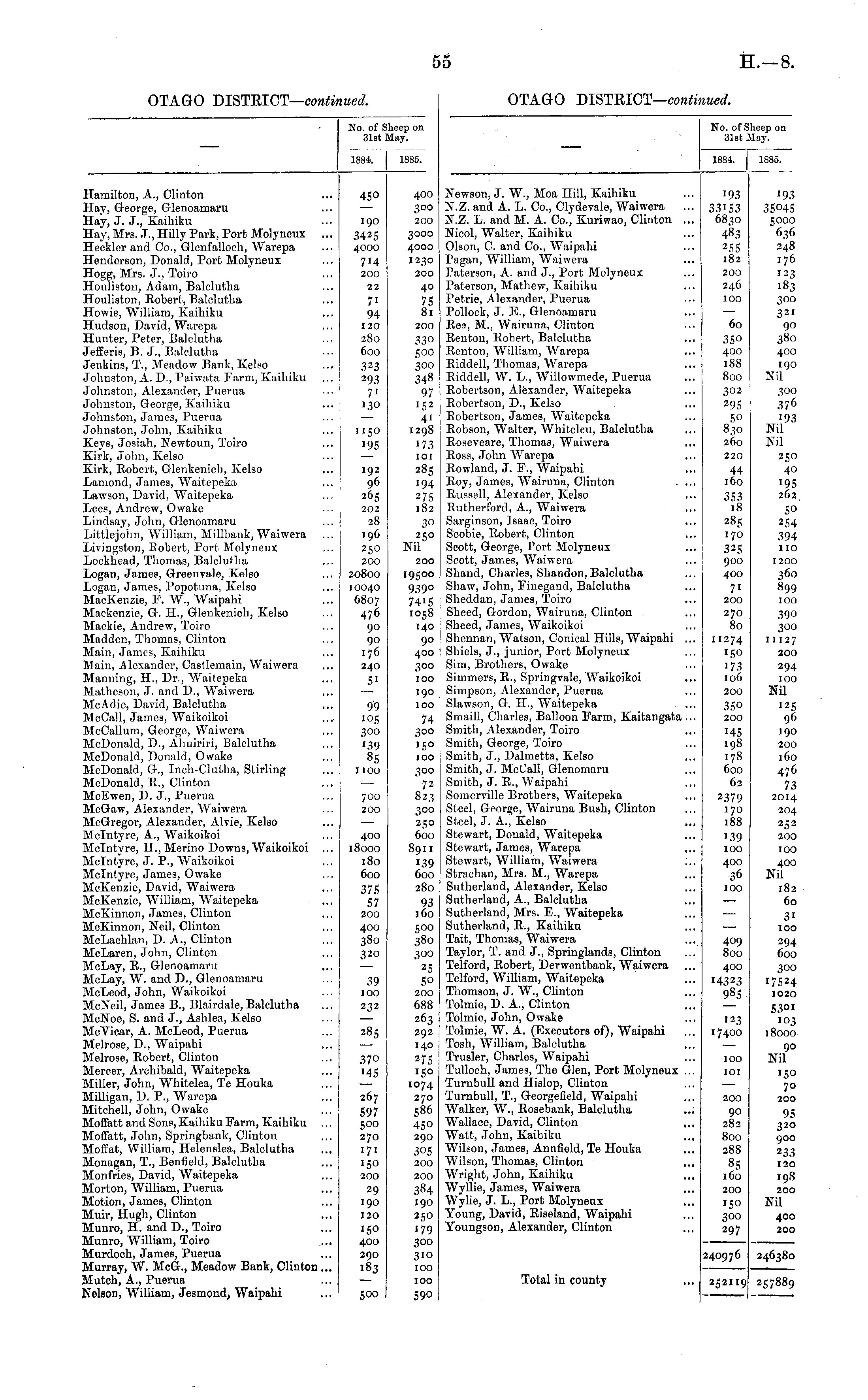 No. of I 31st iheep on May. 1884,. 1885. Hamilton, A., Clinton Hay, George, Glenoamaru Hay, J. J., Kaihiku lay, Mrs. J., Hilly Part, Port Molyneux Heckler and Co., Glenfalloch, Warepa Henderson, Donald, Port Molyneux Hogg, Mrs. J., Toiro Houliston, Adam, Balclutha Houliston, Robert, Balclutba Howie, William, Kaihiku Hudson, David, Warepa Hunter, Peter, Balclutha Fefferis, B, J., Balclutha Fenkins, T., Meadow Bank, Kelso Fohnston, A. D., Paiwata Farm, Kaihiku Fohnston, Alexander, Puerua Fohnston, George, Kaihiku rohnston, James, Puerua Fohnston, John, Kaihiku leys, Josiah, Newtoun, Toiro •Cirk, John, Kelso firk, Robert, Glenkenich, Kelso Lamond, James, Waitepeka Lawson, David, Waitepeka Lees, Andrew, Owake jindsay, John, Glenoamaru uittlejohn, William, Millbank, Waiwera Livingston, Robert, Port Molyneux Lockhead, Thomas, BaleluHia Logan, James, Greenvale, Kelso Logan, James, Popotuna, Kelso HacKenzie, F. W., Waipahi Hackenzie, G. II., Glenkenich, Kelso Hackie, Andrew, Toiro tfadden, Thomas, Clinton Main, James, Kaihiku Wain, Alexander, Castlemain, Waiwera Hanning, H., Dr., Waitepeka tfatheson, J. and D., Waiwera tfeAdie, David, Balclutha HeCall, James, Waikoikoi HcCallum, George, Waiwera HcDonald, D., Ahuiriri, Balclutha HcDonald, Donald, Owake HcDonald, G., Inch-Clutha, Stirling tfcDonald, R., Clinton HcKwen, D. J., Puerua HcGaw, Alexander, Waiwera HcGregor, Alexander, Alvie, Kelso rtclntyre, A., Waikoikoi tfclntyre, H., Merino Downs, Waikoikoi ... tfclntyre, J. P., Waikoikoi ffelntyre, James, Owake tfcKenzie, David, Waiwera tfcKenzie, William, Waitepeka tfcKinnon, James, Clinton tfcKinnon, Neil, Clinton HcLachlan, D. A., Clinton HcLaren, John, Clinton tfcLay, R., Glenoamaru tfcLay, W. and D., Glenoamaru rfcLeod, John, Waikoikoi rfcNeil, James B., Blairdale, Balclutha klcNoe, S. and J., Ashlea, Kelso klcVicar, A. McLeod, Puerua tfelrose, D., Waipahi klelrose, Robert, Clinton klercer, Archibald, Waitepeka filler, John, Whitelea, Te Houka tlilligan, D. P., Warepa tlitchell, John, Owake tfoffatt and Sons, Kaihiku Farm, Kaihiku tloffatt, John, Springbank, Clinton kloffat, William, Helenslea, Balclutha tfonagan, T., Benfield, Balclutha tfonfries, David, Waitepeka Norton, William, Puerua Motion, James, Clinton ttuir, Hugh, Clinton ilunro, H. and D., Toiro tlunro, William, Toiro Murdoch, James, Puerua Murray, W. McG., Meadow Bank, Clinton... lutch, A., Puerua felson, William, Jesmond, Waipahi 45° 190 3425 4000 7H 200 22 71 94 120 280 600 323 293 7' 130 1150 '95 ! 9 2 96 265 202 28 I96 250 200 20800 IOO4O 6807 476 90 90 176 240 51 99 !°5 300 139 85 1100 400 300 200 3000 4000 1230 200 40 75 81 200 33° 500 300 348 97 'S 2 41 I2Q8 173 101 285 194 275 182 30 250 Nil 200 19500 939° 74'S 1058 140 90 400 300 100 190 100 74 300 JS 0 ioo 700 200 400 18000 180 600 375 57 200 400 380 320 300 72 823 300 250 600 8911 139 600 280 93 160 39 100 232 285 370 ■45 267 597 500 270 171 150 200 500 380 300 25 50 200 688 263 292 140 275 J5° 1074 270 586 450 290 305 200 200 384 190 250 179 300 310 100 29 190 120 150 400 290 183 100 500 590