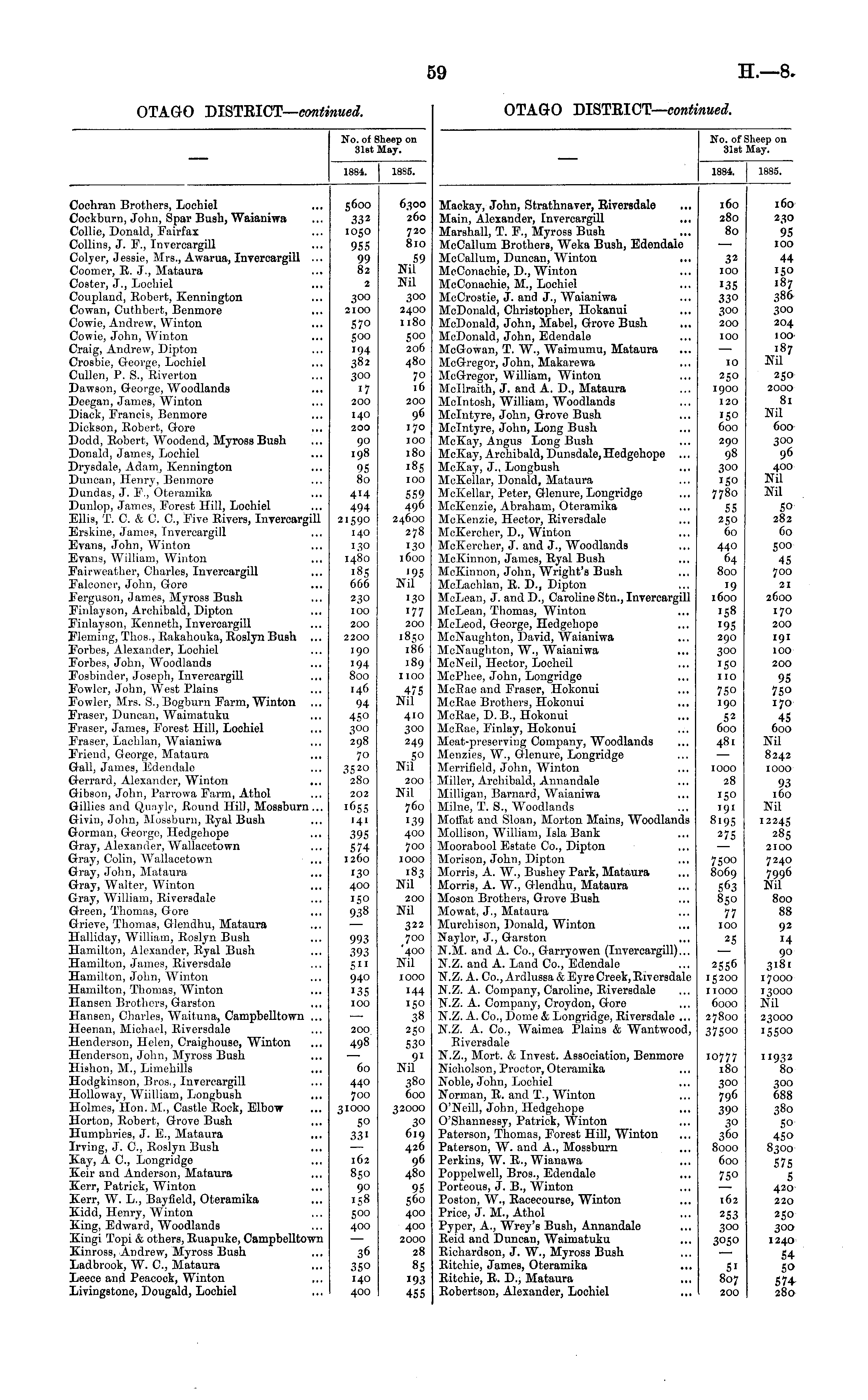 No. of Sheep on 31st May. 1884. | 18S5. Cochran Brothers, Loohiel Cockburn, John, Spar Buah, Waianiwa Collie, Donald, Fairfax Collins, J. F., Invercargill Colyer, Jessie, Mrs., Awarua, Invercargill ... Coomer, R. J., Mataura CoBter, J., Lochiel Coupland, Robert, Kennington Cowan, Cuthbert, Benmore Cowie, Andrew, Winton ... Cowie, John, Winton Craig, Andrew, Dipton Crosbie, George, Lochiel Cullen, P. S., Riverton Dawson, G-eorge, Woodlands Deegan, James, Winton Diack, Francis, Benmore Dickson, Robert, Gore ... Dodd, Robert, Woodend, Myross Bush Donald, James, Lochiel Drysdale, Adam, Kennington Duncan, Henry, Benmore Dundas, J. F,, Oteramika Dunlop, James, Forest Hill, Lochiel Ellis, T. C. & C. 0., Five Rivers, Invercargill Erskine, James, Invercargill Evans, John, Winton Evans, William, Winton Fairweather, Charles, Invercargill Falconer, John, Gore Ferguson, James, Myross Bush Finlayson, Archibald, Dipton Finlayson, Kenneth, Invercargill Fleming, Thos., Rakahouka, Roslyn Bush ... Forbes, Alexander, Lochiel Forbes, John, Woodlands Fosbinder, Joseph, Invercargill Fowler, John, West Plains Fowler, Mrs. S., Bogburn Farm, Winton Fraser, Duncan, Waimatuku Fraser, James, Forest Hill, Lochiel Fraser, Lachlan, Waianiwa Friend, George, Mataura Gall, James, Edendalo Gerrard, Alexander, Winton ... Gibson, John, Parrowa Farm, Athol Gillies and Quayle, Round Hil), Mossburn... Givin, John, Mossburn, Ryal Bush Gorman, George, Hedgehope ... Gray, Alexander, Wallacetown Gray, Colin, AVallacetown Gray, John, Mataura Gray, Walter, Winton Gray, William, Riveredale Green, Thomas, Gore ... Grieve, Thomas, Glendhu, Mataura Halliday, William, Roslyn Bush Hamilton, Alexander, Ryal Bush Hamilton, James, Riversdale Hamilton, John, Winton Hamilton, Thomas, Winton Hansen Brothers, Garston Hansen, Charles, Waituna, Campbelltown ... Heenan, Michael, Riversdale Henderson, Helen, Craighouse, Winton ... Henderson, John, Myross BuBn Hishon, M., Limekills ... Hodgkinson, Bros,, Invercargill Holloway, Wiilliam, Longbush Holmes/lIon.M., Castle Rock, Elbow Horton, Robert, Grove Bush Humphries, J. E., Mataura Irving, J. C, Roslyn Bush. Kay, A C, Longridge Keir and Anderson, Mataura Kerr, Patrick, Winton Kerr, W. L., Bayfleld, Oteramika Kidd, Henry, Winton King, Edward, Woodlands Kingi Topi & others, Ruapuke, Campbelltown Kinross, Andrew, Myross Bush Ladbrook, W. C, Mataura Leece and Peacock, Winton Livingstone, Dougald, Lochiel 5600 1050 955 99 82 2 300 2100 57° 500 194 382 300 17 200 140 200 90 198 95 80 63OO 260 720 8lO 59 Nil Nil 300 2400 1180 500 206 480 70 16 200 9 6 170 100 180 185 100 559 496 24600 278 130 1600 '95 Nil 4*4 494 21590 140 130 1480 185 666 230 100 200 2200 190 194 800 146 94 45° 300 298 70 3520 280 202 1655 141 395 574 1260 130 '77 200 1850 186 189 1100 475 Nil 410 300 249 50 Nil 200 Nil 760 139 400 700 1000 183 Nil 200 Nil 130 400 150 938 993 393 5" 940 135 100 322 700 '400 Nil 200 498 60 440 700 31000 50 33' 162 850 90 158 500 400 1000 144 150 38 250 53° 91 Nil 380 600 32000 30 619 426 96 480 95 560 400 400 2000 28 85 193 455 36 350 140 400