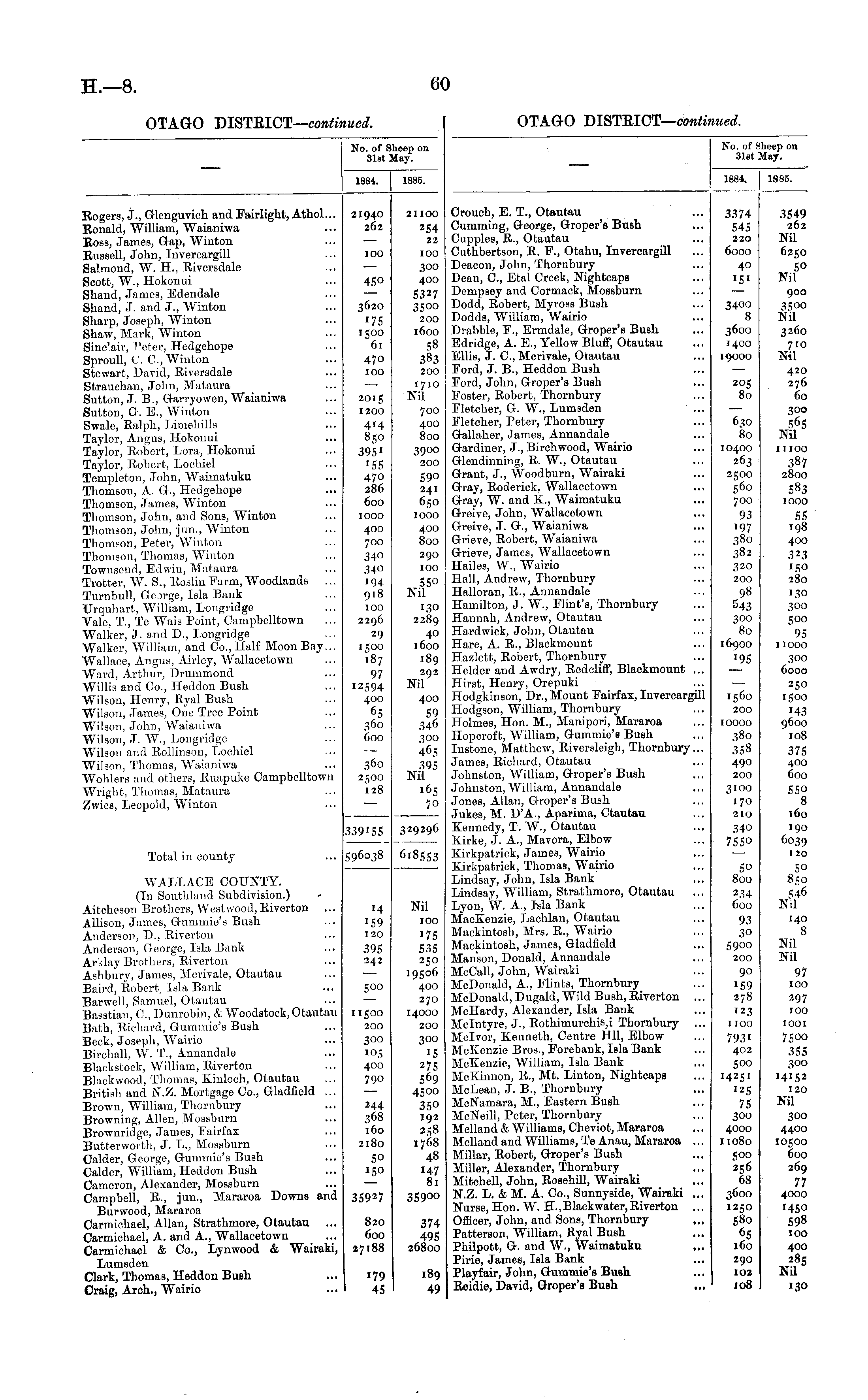 No. of I 31st sheep on May. 1884,. 1885. Crouch, E. T., Otautau Cumming, George, Groper's Bush Cupples, R., Otautau Cuthbertson, R. P., Otahu, Invercargill Deacon, John, Thornbury Dean, C, Btel Creek, Nightcaps Dempsey ami Cormack, Mossburn Dodd, Robert, Myross Bush Dodds, William, Wairio Drabble, F., Ermdale, Groper's Bush Edridge, A. E., Yellow Bluff, Otautau Ellis, J. C, Merivale, Otautau Ford, J. B., Heddon Bush Ford, John, Groper's Bush Foster, Robert, Thornbury Fletcher, G. W., Lumsden Fletcher, Peter, Thornbury Gallaher, James, Annandale Gardiner, J., Bircliwood, Wairio Glendinning, R. W., Otautau Grant, J., Woodburn, Wairaki Gray, Roderick, Wallacetown Gray, W. and K., Waimatuku Greive, John, Wallacetown Greive, J. G., Waianiwa Grieve, Robert, Waianiwa Grieve, James, Wallacetown Hailes, W., Wairio Hall, Andrew, Thornbury Halloran, R., Annandale Hamilton, J. W., Flint's, Thornbury Hannah, Andrew, Otautau Hardwick, John, Otautau Hare, A. R., Blackmount Hazlett, Robert, Thornbury Helder and Awdry, Redcliff, Blackmount ... Hirst, Henry, Orepuki Hodgkiuson, Dr., Mount Fairfax, Invercargill Hodgson, William, Thornbury Holmes, Hon. M., Manipori, Mararoa Ilopcroft, William, Gummie's Bush Instono, Matthew, Riversleigb, Thornbury... James, Richard, Otautau Johnston, William, Groper's Bush Johnston, William, Annandale Jones, Allan, Groper's Bush Jukes, M. D'A., Aparima, Ctautau Kennedy, T. W., Otautau Kirke, J. A., Mavora, Elbow Kirkpatrick, James, Wairio Kirkpatrick, Thomas, Wairio Lindsay, John, Isla Bank Lindsay, William, Strathmore, Otautau Lyon, W. A., Isla Bank MacEenzie, Laehlan, Otautau Mackintosh, Mrs. R., Wairio Mackintosh, James, Gladficld Manson, Donald, Annandale McCall, John, Wairaki McDonald, A., Flints, Thornbury McDonald,Dugald, Wild Bush.Riverton ... Mellardy, Alexander, Isla Bank Mclntyre, J., Rothimurehis,i Thornbury ... Mclvor, Kenneth, Centre Hll, Elbow McKenzie Bros., Forebank, Isla Bank McKenzie, William, Isla Bant McKinnon, R., Mt. Linton, Nightcaps McLean, J. B., Thornbury McNamara, M., Eastern Bush McNeill, Peter, Thornbury Melland & Williams, Cheviot, Mararoa Melland and Williams, Te Anau, Mararoa ... Millar, Robert, Groper's Bush Miller, Alexander, Thornbury Mitchell, John, Rosehill, Wairaki N.Z. L. & M. A. Co., Sunnyside, Wairaki ... Nurse, Hon. W. H.,Blackwater,Riverton Officer, John, and Sons, Thornbury Patterson, William, Kyal Bush Philpott, G. and W., Waimatuku Pirie, James, Isla Bank Playfair, John, Gummie's Bush Reidie, David, Groper's Bush 3374 545 220 6000 40 •S 1 3400 8 3600 1400 19000 205 80 610 80 10400 263 2500 560 700 93 197 380 382 320 200 98 543 300 80 16900 '95 1560 200 10000 380 358 490 200 3549 262 Nil 6250 50 Nil 900 3500 Nil 3260 710 Nil 420 276 60 300 565 Nil moo 387 2800 583 1000 55 198 400 150 280 130 300 500 95 11000 300 6000 250 1500 J43 9600 108 375 400 600 550 8 160 190 6039 120 S° 850 S46 Nil 3100 170 210 340 75SO 50 800 »34 600 93 30 5900 200 90 ■59 278 •23 I IOO 7931 402 500 14251 '25 75 300 4000 11080 500 256 68 3600 1250 580 65 160 140 8 Nil Nil 97 100 297 100 1001 7500 355 300 14152 120 Nil 300 4400 10500 600 269 77 4000 1450 598 100 400 285 Nil 130 290 102 jo8
