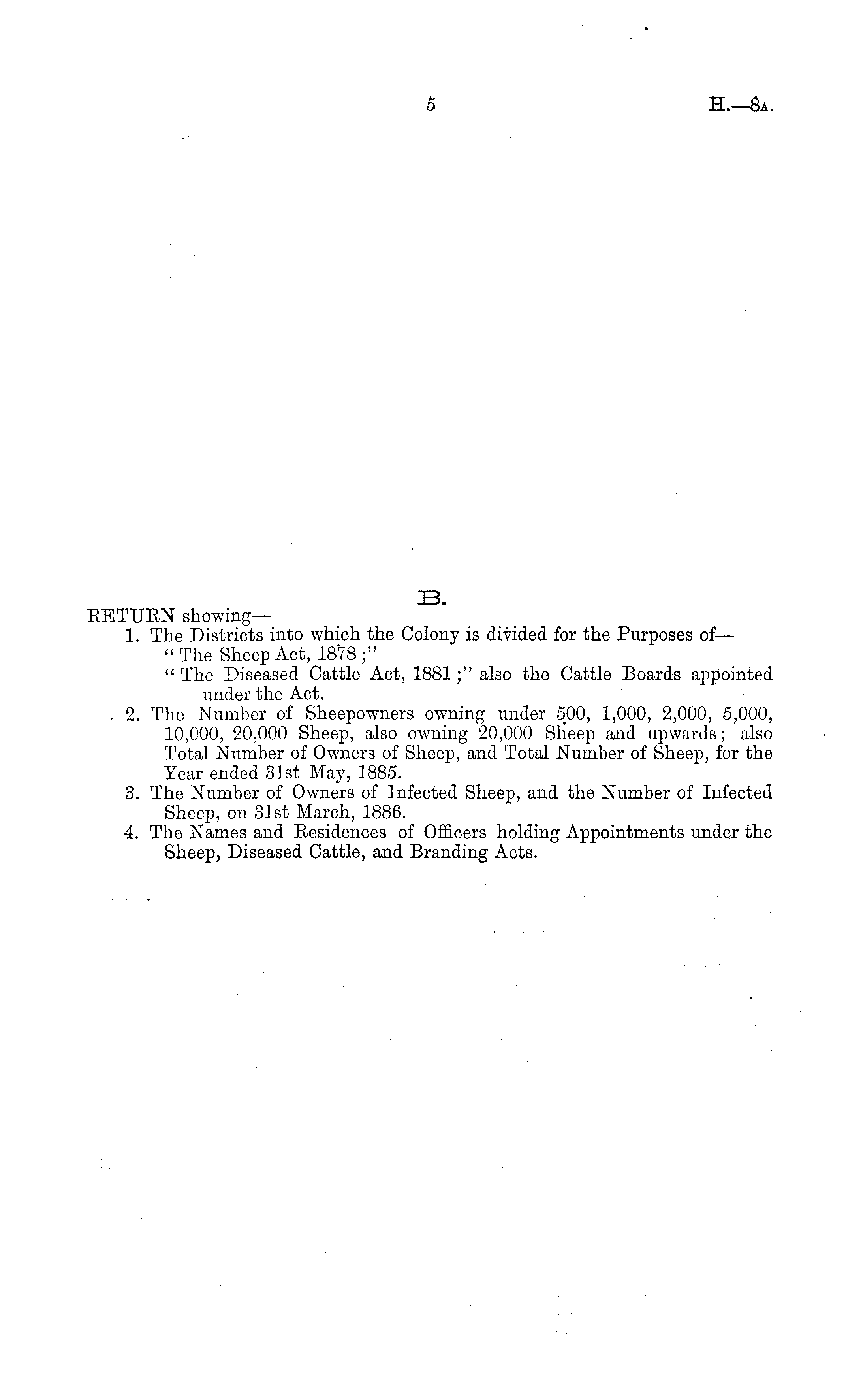 18. EETUBN showing— 1. The Districts into which the Colony is divided for the Purposes of— "The Sheep Act, 1878;" " The Diseased Cattle Act, 1881 ;" also the Cattle Boards appointed under the Act. . 2. The Number of Sheepowners owning under 500, 1,000, 2,000, 5,000, 10,000, 20,000 Sheep, also owning 20,000 Sheep and upwards; also Total Number of Owners of Sheep, and Total Number of Sheep, for the Year ended 31st May, 1885. 3. The Number of Owners of Infected Sheep, and the Number of Infected Sheep, on 31st March, 1886. 4. The Names and Eesidences of Officers holding Appointments under the Sheep, Diseased Cattle, and Branding Acts.