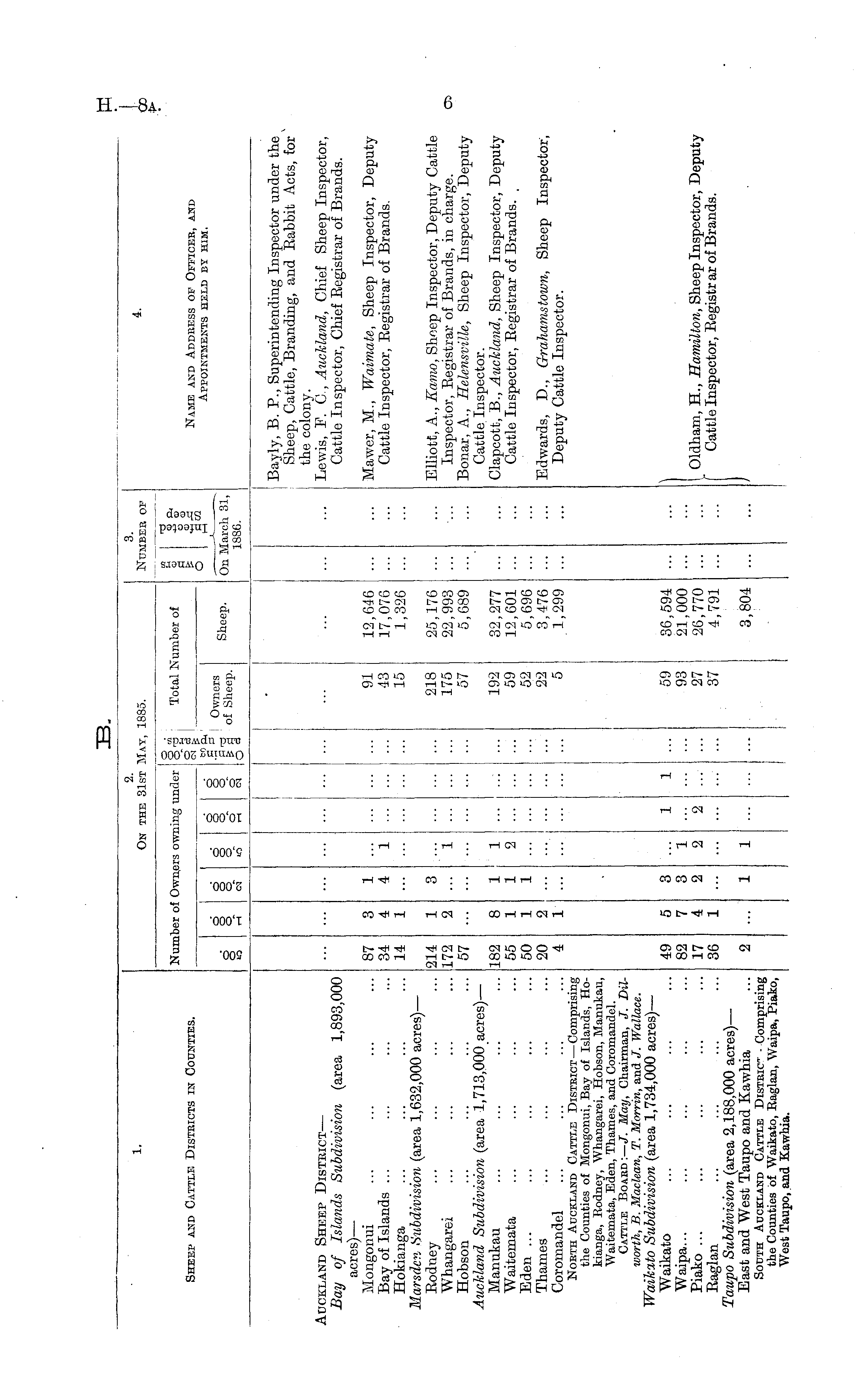 1. 2. On the 31st May, 1885. o. NuMBEB OF 4. Sheep and Cattle Disteicts in Counties. Number of Owners owning under o ■ o" 3 CM teTotal Number of O .2.2 Name and Addbess op Officeb, and Appointments held by him. o o o o o o o •a o o o o o o to p. •S Owners E 3 of Sheep. Sheep. On March 81, 18S6. o Bayly, B. P., Superintending Inspector under the Sheep, Cattle, Branding, and Eabbit Acts, for the colony. Lewis, F. C, Auckland, Chief Sheep Inspector, Cattle Inspector, Chief Eegistrar of Brands. uckland Sheep Distbict — Bay of Islands Subdivision (area 1,893,000 acres) — Mongonui Bay of Islands ... Hokianga Marsdcn Subdivision (area 1,632,000 acres) — Eodney Whangarei Hobson Auckland Subdivision (area 1,713,000 acres) — Manukau Waitemata Eden ... Thames Coromandel North Auckland Cattle District — Comprising the Counties of Mongonui, Bay of Islands, Hokianga, Rodney, Whangarei, Hobson, Manukau, Waitemata, Eden, Thames, and Coromandel. Cattle Boakd :—/. May, Chairman, J. Dilworth, B. Maclean, T. Morrin, and J. Wallace. Waikato Subdivision (area 1,734,000 acres) — Waikato Waipa... Piako ... Eaglan Taupo Subdivision (area 2,188,000 acres) — East and West Taupo and Kawhia South Auckland Cattle Disteic - Comprising the Counties of Waikato, Eaglan, Waipa, Piako, West Taupo, and Kawhia. 87 34 14 214 172 57 182 55 50 20 4 3 4 1 1 2 8 1 1 2 1 1 4 3 1 1 1 1 1 1 2 91 ■13 15 218 175 57 192 59 52 22 5 12,646 17,076 1,326 25,176 22,993 5,689 32,277 12,601 5,696 3,476 1,299 Mawer, M., Waimate, Sheep Inspector, Deputy Cattle Inspector, Eegistrar of Brands. Elliott, A., Kamo, Sheep Inspector, Deputy Cattle Inspector, Eegistrar of Brands, in charge. Bonar, A., Helensville, Sheep Inspector, Deputy Cattle Inspector. Clapcott, B., Auckland, Sheep Inspector, Deputy Cattle Inspector, Eegistrar of Brands. Edwards, D., Grahamstown, Sheep Inspector, Deputy Cattle Inspector. 49 82 17 36 5 7 4 1 3 3 2 2 1 2 1 59 93 27 37 36,594 21,000 26,770 4,791 I Oldham, H., Hamilton, Sheep Inspector, Deputy [ Cattle Inspector, Eegistr ar of Brands. 2 1 1 3,804