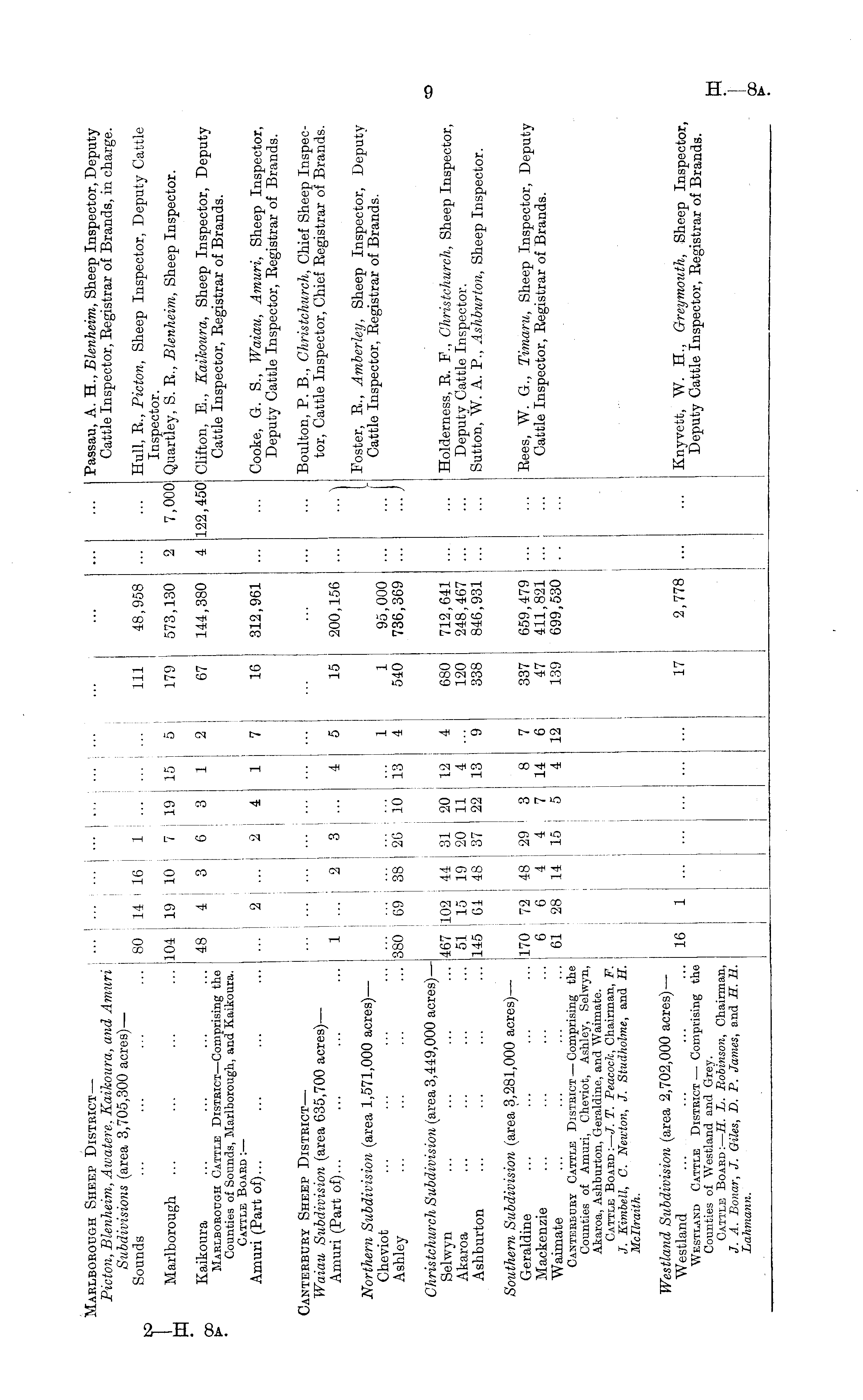 Marlborough Sheep District — Picton, Blenheim, Aivatere, Kaikoura, and Amuri Subdivisions (area 3,705,300 acres) — Sounds ... I Passau, A. H., Blenheim, Sheep Inspector, Deputy Cattle Inspector, Eegistrar of Brands, in charge. 80 30 14 i 16 ! 1 ... 111 48,958 Hull, E., Picton, Sheep Inspector, Deputy Cattle Inspector. Quartley, S. E., Blenheim, Sheep Inspector. Marlborough ... ... ... ... j 104 04 19 : 10 i 7 ! 19 15 5 179 573,130 2 7,000 Kaikoura Marlborough Cattle District —Comprising the Counties of Sounds, Marlborough, and Kaikoura. Cattle Board :— Amuri (Part of)... 48 48 4 3 6 3 1 2 67 144,380 4 122,450 Clifton, E., Kaikoura, Sheep Inspector, Deputy Cattle Inspector, Eegistrar of Brands. ... 2 j ... 2 4 1 ... 2 3 ... 16 312,961 Cooke, G. S., Waiau, Amuri, Sheep Inspector, Deputy Cattle Inspector, Eegistrar of Brands. Canterbury Sheep District— Waiau Subdivision (area 635,700 acres) — Amuri (Part of)... Boulton, P. B., Christchurch, Chief Sheep Inspector, Cattle Inspector, Chief Eegistrar of Brands. Northern Subdivision (area 1,571,000 acres) — Cheviot Ashley 4 5 15 1 540 200,156 95,000 736,369 .., Poster, E., Amberley, Sheep Inspector, Deputy Cattle Inspector, Eegistrar of Brands. 380 69 38 26 10 13 1 4 Christchurch Subdivision (area 3,449,000 acres) — Selwyn Akaroa Ashburton 467 102 44 31 20 51 : 15 19 20 11 145 61 48 37 22 20 11 22 12 4 13 4 680 120 338 712,641 248,467 846,931 Holderness, E. F., Christchurch, Sheep Inspector, Deputy Cattle Inspector. Sutton, W. A. P., Ashburton, Sheep Inspector. 9 Southern Subdivision (area 3,281,000 acres) — Geraldine Mackenzie Waimate Canterbury Cattle District — Comprising the Counties of Amuri, Cheviot, Ashley, Sehvyn, Aiaroa, Ashburton, Geraldine, and Waimate. Cattle Board :— J. T. Peacock, Chairman, F. J. Eimbell, C. Neicton, J. Studholme, and H. Mcllraith. 170 72 48 ' 29 i 3 6 6 4 i 4 7 61 28 j 14 | 15 5 8 14 4 7 6 12 337 47 139 659,479 411,821 699,530 Eees, W. G., Timaru, Sheep Inspector, Deputy Cattle Inspector, Eegistrar of Brands. Westland Subdivision (area 2,702,000 acres) — Westland Westland Cattle District — Comprising the Counties of Westland and Grey. Cattle Board: — H. L. Robinson, Chairman, J. A. Bonar, J. Giles, D. P. James, and 3. H. Lahmann. 16 17 2,778 Knyvett, W. H., Greymouth, Sheep Inspector, Deputy Cattle Inspector, Eegistrar of Brands.