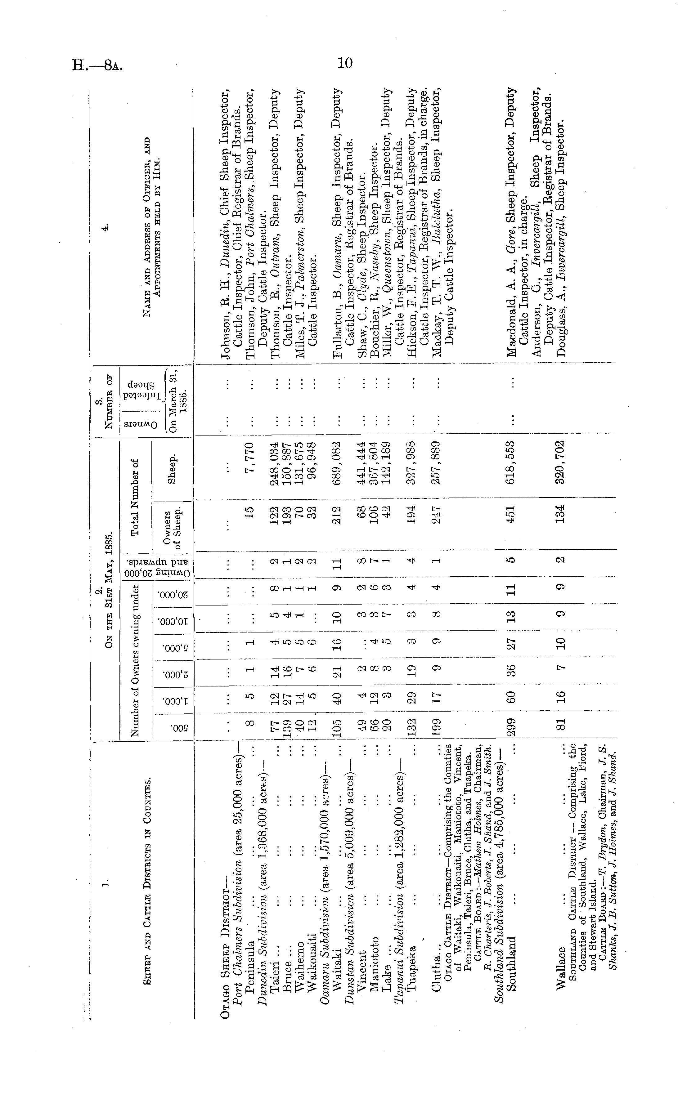 1. 2. On the 31st 3. NUMBER OE i. :at, 1885. Sheep and Cattle Distbicts in Counties. Number of Owners owning under o 9 3 60 P. S a O d Total Number of a o § Name and Address oe Officer, and Appointments held by Him. . . I . d d o o o o o ~ o o o o o 8 9 9 9 d d I Owners of Sheep. Sheep. On March 31," 1886. ! ■ Otago Sheep Disteict — Pori Chalmers Subdivision (area 25,000 acres) — Peninsula Dunedin Subdivision (area 1,368,000 acres) — Taieri ... Bruce ... Waihemo Waikouaiti Oamaru Subdivision (area 1,570,000 acres) — Waitaki Duns tan Subdivision (area 5,009,000 acres) — Vincent Maniototo Lake ... Tapanui Subdivision (area 1,282,000 acres) — Tuapeka 8 77 139 40 12 . 5 12 27 14 5 1 14 16 7 6 1 ... 4 5 5 ! 4 5 ! 1 6 ... 8 1 1 1 2 1 2 2 I 15 122 193 70 32 7,770 248,034 150,887 131,675 96,948 Johnson, B. H., Dunedin, Chief Sheep Inspector, Cattle Inspector, Chief Begistrar of Brands. Thomson, John, Port Chalmers, Sheep Inspector, Deputy Cattle Inspector. Thomson, B., Outram, Sheep Inspector, Deputy Cattle Inspector. Miles, T. J., Palmerston, Sheep Inspector, Deputy Cattle Inspector. 105 40 21 16 10 9 11 | 212 689,082 Pullarton, B., Oamaru, Sheep Inspector, Deputy Cattle Inspector, Begistrar of Brands. Shaw, C, Clyde, Sheep Inspector. Bouchier, B., Naseby, Sheep Inspector. Miller, W., Queenstoivn, Sheep Inspector, Deputy Cattle Inspector, Begistrar of Brands. Hickson, F.E., Tapanui, Sheep Inspector, Deputy Cattle Inspector, Begistrar of Brands, in charge. Mackay, T. T. W., Balclutha, Sheep Inspector, Deputy Cattle Inspector. 49 66 20 A _ 12 o 2 8 3 3 4 3 5 7 2 6 3 8 1 68 106 ; 42 441,444 367,804 142,189 132 29 19 3 3 4 * 194; 327,988 Clutha... Otago Cattle District —Comprising the Counties of Waitaki, Waikouaiti, Maniototo, Vincent, Peninsula, Taieri, Bruce, Clutha, and Tuapeka. Cattle Boaed :— Matheio Holmes, Chairman, R. Charteris, J. Roberts, J. Shand, and J. Smith. Southland Subdivision (area 4,785,000 acres) — Southland 199 17 9 9 ' 8 4 1 247 i 257,889 299 60 36 27 13 11 451 618,553 Macdonald, A. A., Gore, Sheep Inspector, Deputy Cattle Inspector, in charge. Anderson, C., Invercargill, Sheep Inspector, Deputy Cattle Inspector, Begistrar of Brands. Douglass, A., Invercargill, Sheep Inspector. Wallace Southland Cattle District — Comprising the Counties of Southland, Wallace, Lake, Fiord, and Stewart Island. Cattle Boabd :— T. Brydon, Chairman, J. S. Shanks, J. B. Sutton, J. Holmes, and J. Shand. 81 L0 10 134 320,702