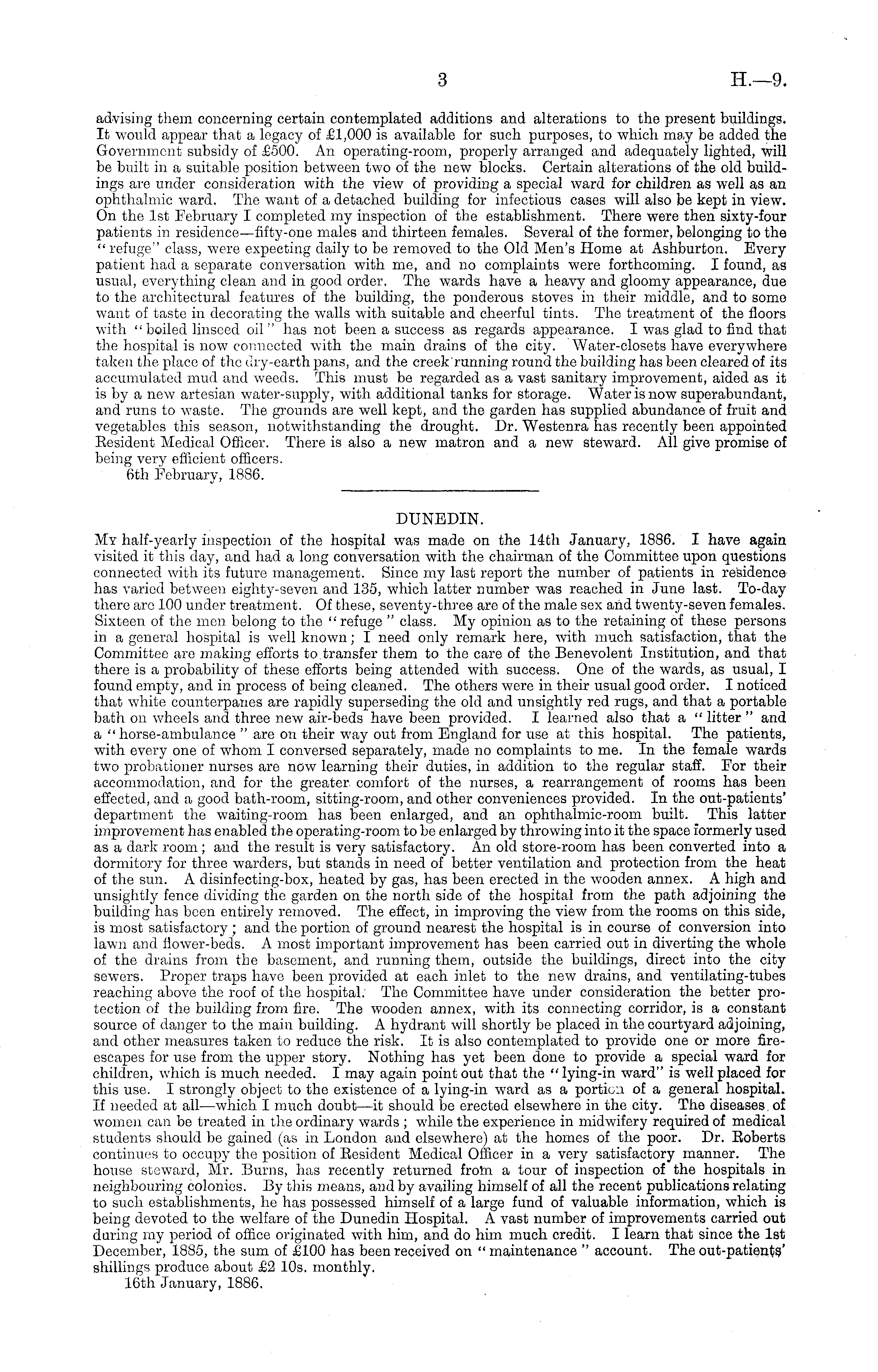advising them concerning certain contemplated additions and alterations to the present buildings. It would appear that a legacy of £1,000 is available for such purposes, to which may be added the Government subsidy of £500. An operating-room, properly arranged and adequately lighted, will be built in a suitable position between two of the new blocks. Certain alterations of the old buildings are under consideration with the view of providing a special ward for children as well as an ophthalmic ward. The want of a detached building for infectious cases will also be kept in view. On the Ist February I completed my inspection of the establishment. There were then sixty-four patients in residence—fifty-one males and thirteen females. Several of the former, belonging to the "refuge" class, were expecting daily to be removed to the Old Men's Home at Ashburton. Every patient had a separate conversation with me, and no complaints were forthcoming. I found, as usual, everything clean and in good order. The wards have a heavy and gloomy appearance, due to the architectural features of the building, the ponderous stoves in their middle, and to some want of taste in decorating the walls with suitable and cheerful tints. The treatment of the floors with "boiled linseed oil" has not been a success as regards appearance. I was glad to find that the hospital is now connected with the main drains of the city. Water-closets have everywhere taken the place of the dry-earth pans, and the creek'running round the building has been cleared of its accumulated mud and weeds. This must be regarded as a vast sanitary improvement, aided as it is by a new artesian water-supply, with additional tanks for storage. Water is now superabundant, and runs to waste. The grounds are well kept, and the garden has supplied abundance of fruit and vegetables this season, notwithstanding the drought. Dr. Westenra has recently been appointed Eesident Medical Officer. There is also a new matron and a new steward. All give promise of being very efficient officers. 6th February, 1886.