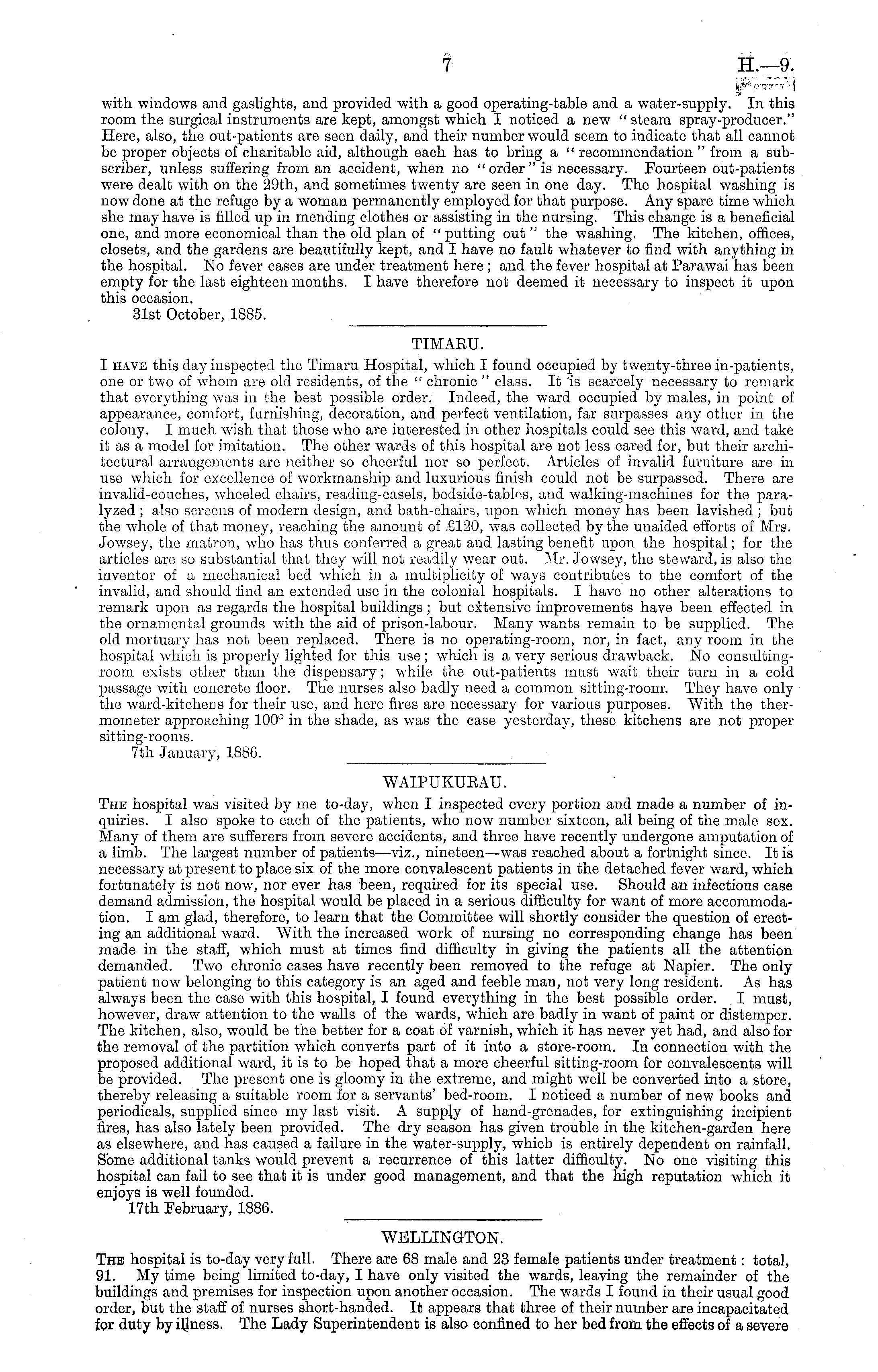 with windows and gaslights, and provided with a good operating-table and a water-supply. In this room the surgical instruments are kept, amongst which I noticed a new " steam spray-producer." Here, also, the out-patients are seen daily, and their number would seem to indicate that all cannot be proper objects of charitable aid, although each has to bring a " recommendation " from a subscriber, unless suffering from an accident, when no " order "is necessary. Fourteen out-patients were dealt with on the 29th, and sometimes twenty are seen in one day. The hospital washing is now done at the refuge by a woman permanently employed for that purpose. Any spare time which she may have is filled up in mending clothes or assisting in the nursing. This change is a beneficial one, and more economical than the old plan of "putting out " the washing. The kitchen, offices, closets, and the gardens are beautifully kept, and I have no fault whatever to find with anything in the hospital. No fever cases are under treatment here ; and the fever hospital at Parawai has been empty for the last eighteen months. I have therefore not deemed it necessary to inspect it upon this occasion. 31st October, 1885.