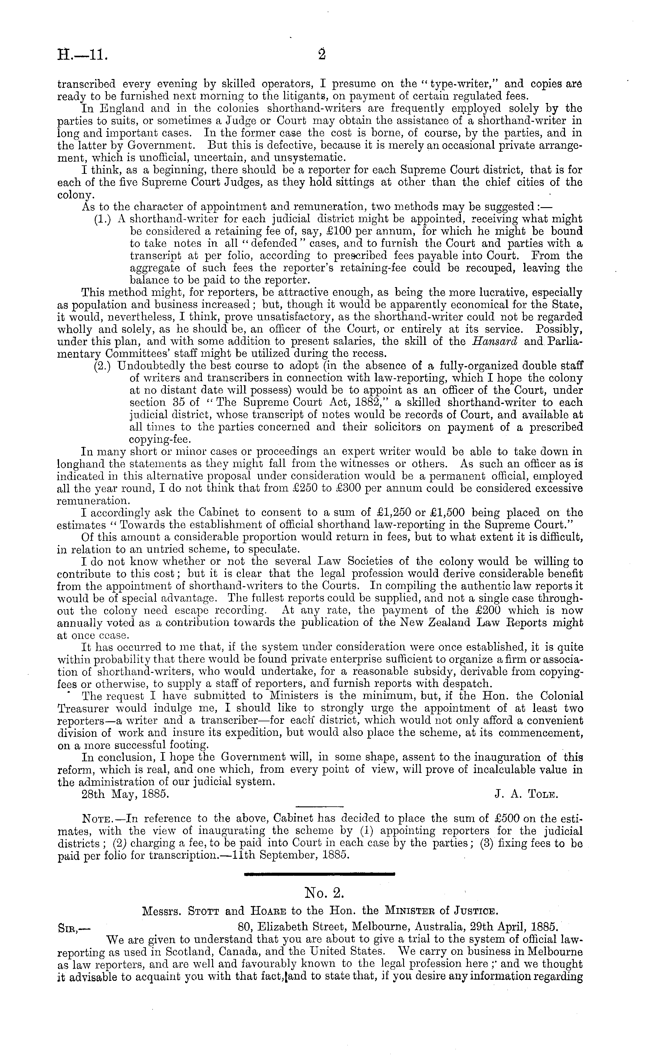 No. 2. Messrs. Stott and Hoare to the Hon. the Minister of Justice. Sir,— 80, Elizabeth Street, Melbourne, Australia, 29th April, 1885. We are given to understand that you are about to give a trial to the system of official lawreporting as used in Scotland, Canada, and the United States. We carry on business in Melbourne as law reporters, and are well and favourably known to the legal profession here * and we thought it advisable to acquaint you with that fact,[and to state that, if you desire any information regarding