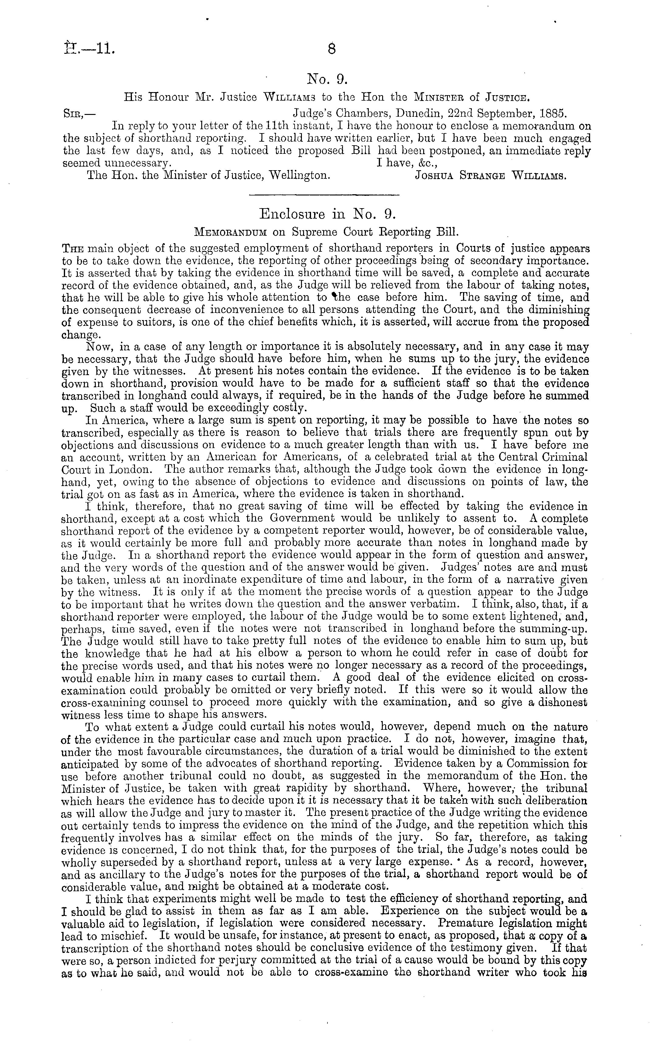 No. 9. His Honour Mr. Justice Williams to the Hon the Minister of Justice, Sir, — Judge's Chambers, Dunedin, 22nd September, 1885. In reply to your letter of the 11th instant, I have the honour to enclose a memorandum on the subject of shorthand reporting. I should have written earlier, but I have been much engaged the last few days, and, as I noticed the proposed Bill had been postponed, an immediate reply seemed unnecessary. I have, &c, The Hon. the Minister of Justice, Wellington. Joshua Strange Williams.