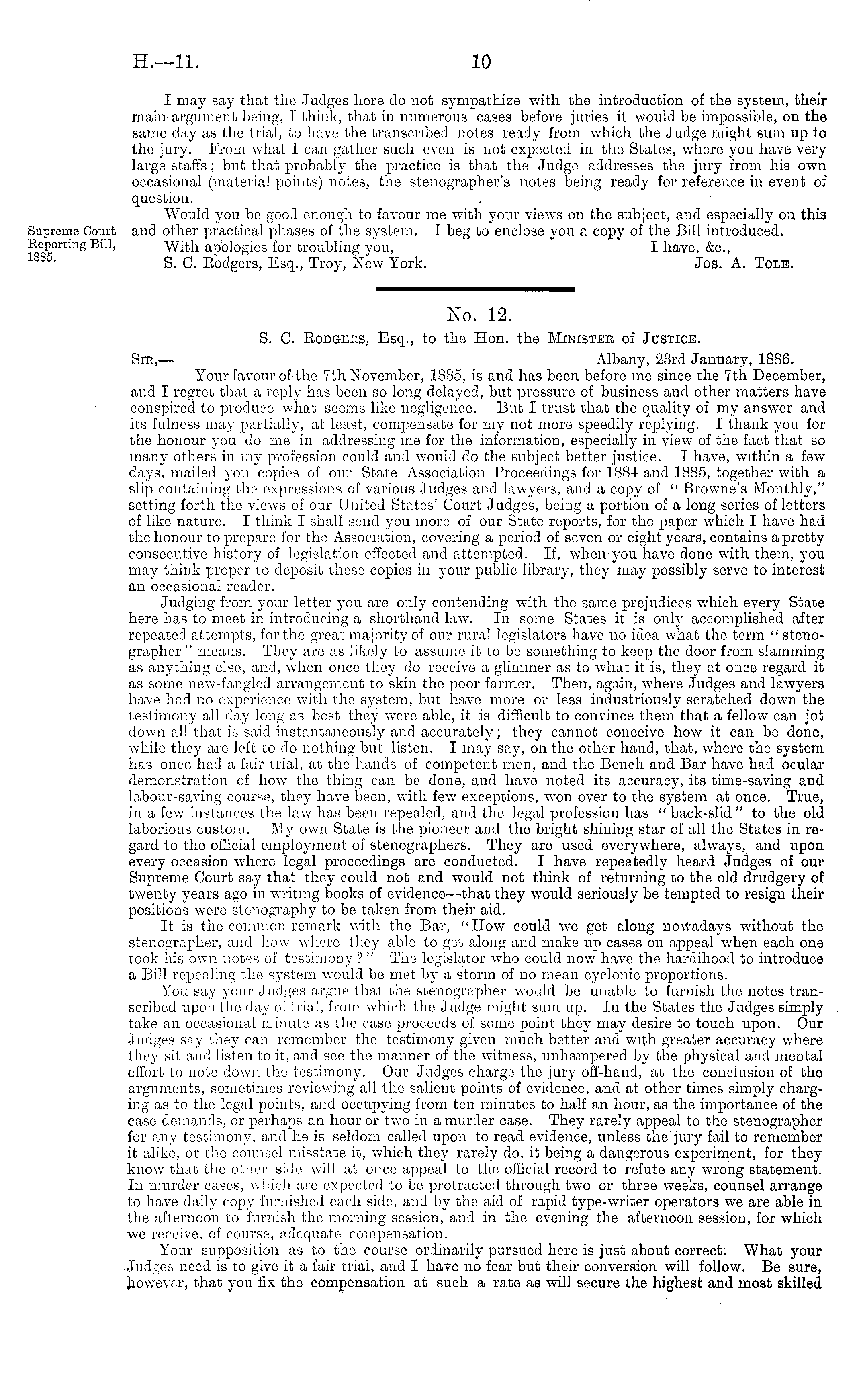 No. 12. S. C. Eodgees, Esq., to the Hon. the Minister of Justice. Sir, — Albany, 23rd January, 1886. Your favour of the 7th November, 1885, is and has been before me since the 7th December, and I regret that a reply has been so long delayed, but pressure of business and other matters have conspired to produce what seems like negligence. But I trust that the quality of my answer and its fulness may partially, at least, compensate for my not more speedily replying. I thank you for the honour you do me in addressing me for the information, especially in view of the fact that so many others in my profession could and would do the subject better justice. I have, within a few days, mailed you copies of our State Association Proceedings for 1881 and 1885, together with a slip containing the expressions of various Judges and lawyers, and a copy of " Browne's Monthly," setting forth the views of our United States' Court Judges, being a portion of a long series of letters of like nature. I think I shall sand you more of our State reports, for the paper which I have had the honour to prepare for the Association, covering a period of seven or eight years, contains a pretty consecutive history of legislation effected and attempted. If, when you have done with them, you may think proper to deposit these copies in your public library, they may possibly serve to interest an occasional reader. Judging from your letter you are only contending with the same prejudices which every State here has to meet in introducing a shorthand law. In some States it is only accomplished after repeated attempts, for the great majority of our rural legislators have no idea what the term " stenographer " means. They are as likely to assume it to be something to keep the door from slamming as anything else, and, when once they do receive a glimmer as to what it is, they at once regard it as some new-fangled arrangement to skin the poor farmer. Then, again, where Judges and lawyers have had no experience with the system, but have more or less industriously scratched down the testimony all day long as best they were able, it is difficult to convince them that a fellow can jot down all that is said instantaneously and accurately; they cannot conceive how it can be done, while they are left to do nothing but listen. I may say, on the other hand, that, where the system has once had a fair trial, at the hands of competent men, and the Bench and Bar have had ocular demonstration of how the thing can bo done, and have noted its accuracy, its time-saving and labour-saving course, they have been, with few exceptions, won over to the system at once. True, in a few instances the law has been repealed, and the legal profession has " back-slid " to the old laborious custom. My own State is the pioneer and the bright shining star of all the States in regard to the official employment of stenographers. They are used everywhere, always, and upon every occasion where legal proceedings are conducted. I have repeatedly heard Judges of our Supreme Court say that they could not and would not think of returning to the old drudgery of twenty years ago in writing books of evidence —that they would seriously be tempted to resign their positions were stenography to be taken from their aid. It is the common remark with the Bar, "How could we get along nowadays without the stenographer, and how where they able to get along and make up cases on appeal when each one took his own notes of testimony ? " The legislator who could now have the hardihood to introduce a Bill repealing the system would be met by a storm of no mean cyclonic proportions. You say your Judges argue that the stenographer would be unable to furnish the notes transcribed upon the day of trial, from which the Judge might sum up. In the States the Judges simply take an occasional minute as the case proceeds of some point they may desire to touch upon. Our Judges say they can remember the testimony given much better and wifh greater accuracy where they sit and listen to it, and see the manner of the witness, unhampered by the physical and mental effort to note down the testimony. Our Judges charge the jury off-hand, at the conclusion of the arguments, sometimes reviewing all the salient points of evidence, and at other times simply charging as to the legal points, and occupying from ten minutes to half an hour, as the importance of the case demands, or perhaps an hour or two in a murder case. They rarely appeal to the stenographer for any testimony, and he is seldom called upon to read evidence, unless the'jury fail to remember it alike, or the counsel misstate it, which they rarely do, it being a dangerous experiment, for they know that the other side will at once appeal to the official record to refute any wrong statement. In murder cases, which are expected to be protracted through two or three weeks, counsel arrange to have daily copy furnished each side, and by the aid of rapid type-writer operators we are able in the afternoon to furnish the morning session, and in the evening the afternoon session, for which we receive, of course, adequate compensation. Your supposition as to the course ordinarily pursued here is just about correct. What your Judges need is to give it a fair trial, and I have no fear but their conversion will follow. Be sure, however, that you fix the compensation at such a rate as will secure the highest and most skilled