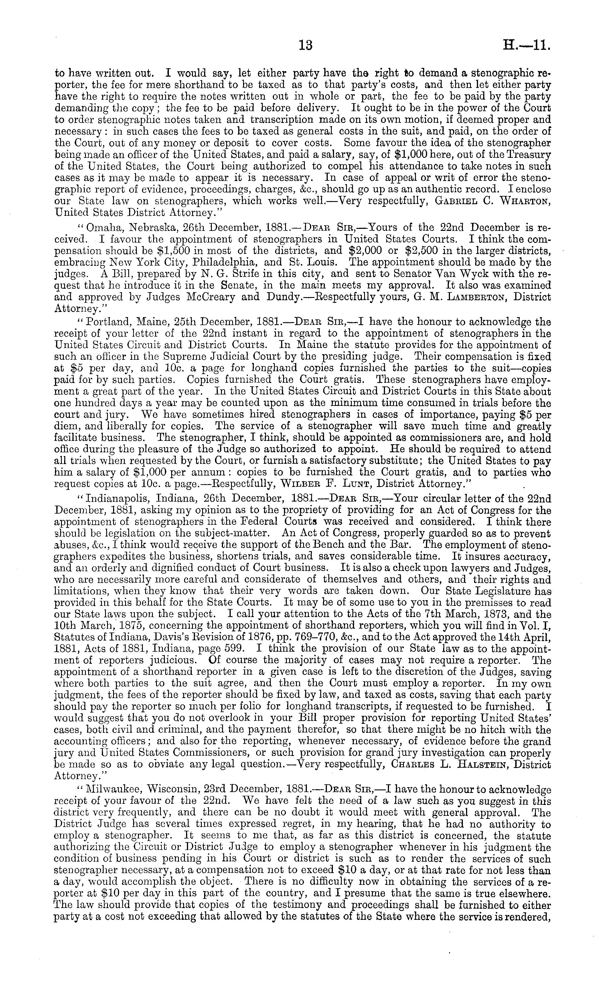 to have written out. I would say, let either party have tha right to demand a stenographic reporter, the fee for mere shorthand to be taxed as to that party's costs, and then let either party have the right to require the notes written out in whole or part, the fee to be paid by the party demanding the copy; the fee to be paid before delivery. It ought to be in the power of the Court to order stenographic notes taken and transcription made on its own motion, if deemed proper and necessary : in such cases the fees to be taxed as general costs in the suit, and paid, on the order of the Court, out of any money or deposit to cover costs. Some favour the idea of the stenographer being made an officer of the United States, and paid a salary, say, of $1,000 here, out of the Treasury of the United States, the Court being authorized to compel his attendance to take notes in such cases as it may be made to appear it is necessary. In case of appeal or writ of error the stenographic report of evidence, proceedings, charges, &c, should go up as an authentic record. I enclose our State law on stenographers, which works •well.—Very respectfully, Gabriel C. Wharton, United States District Attorney." "Omaha, Nebraska, 26th December, 1881. — Dear Sir, —Yours of the 22nd December is received. I favour the appointment of stenographers in United States Courts. I think the compensation should be $1,500 in most of the districts, and $2,000 or $2,500 in the larger districts, embracing New York City, Philadelphia, and St. Louis. The appointment should be made by the judges. A Bill, prepared by N. G. Strife in this city, and sent to Senator Van Wyck with the request that he introduce it in the Senate, in the main meets my approval. It also was examined and approved by Judges McCreary and Dundy.—Eespectfully yours, G. M. Lambeeton, District Attorney." "Portland, Maine, 25th December, 1881.—Dear Sir, —I have the honour to acknowledge the receipt of your letter of the 22nd instant in regard to the appointment of stenographers in the United States Circuit and District Courts. In Maine the statute provides for the appointment of such an officer in the Supreme Judicial Court by the presiding judge. Their compensation is fixed at $5 per day, and 10c. a page for longhand copies furnished the parties to the suit—copies paid for by such parties. Copies furnished the Court gratis. These stenographers have employment a great part of the year. In the United States Circuit and District Courts in this State about one hundred days a year may be counted upon as the minimum time consumed in trials before the court and jury. We have sometimes hired stenographers in cases of importance, paying $5 per diem, and liberally for copies. The service of a stenographer will save much time and greatly facilitate business. The stenographer, I think, should be appointed as commissioners are, and hold office during the pleasure of the Judge so authorized to appoint. He should be required to attend all trials when requested by the Court, or furnish a satisfactory substitute; the United States to pay him a salary of $1,000 per annum: copies to be furnished the Court gratis, and to parties who request copies at 10c. a page.—Eespectfully, Wilber E. Lunt, District Attorney." "Indianapolis, Indiana, 26th December, 1881.—Dear Sir, —Your circular letter of the 22nd December, 1881, asking my opinion as to the propriety of providing for an Act of Congress for the appointment of stenographers in the Federal Courts was received and considered. I think there should be legislation on the subject-matter. An Act of Congress, properly guarded so as to prevent abuses, &c, I think would receive the support of the Bench and the Bar. The employment of stenographers expedites the business, shortens trials, and saves considerable time. It insures accuracy, and an orderly and dignified conduct of Court business. It is also a check upon lawyers and Judges, who are necessarily more careful and considerate of themselves and others, and their rights and limitations, when they know that their very words are taken down. Our State Legislature has provided in this behalf for the State Courts. It may be of some use to you in the premisses to read our State laws upon the subject. I call your attention to the Acts of the 7th March, 1873, and the 10th March, 1875, concerning the appointment of shorthand reporters, which you will find in Vol. I, Statutes of Indiana, Davis's Eevision of 1876, pp. 769-770, &c, and to the Act approved the 14th April, 1881, Acts of 1881, Indiana, page 599. I think the provision of our State law as to the appointment of reporters judicious. Of course the majority of cases may not require a reporter. The appointment of a shorthand reporter in a given case is left to the discretion of the Judges, saving where both parties to the suit agree, and then the Court must employ a reporter. In my own judgment, the fees of the reporter should be fixed by law, and taxed as costs, saving that each party should pay the reporter so much per folio for longhand transcripts, if requested to be furnished. I would suggest that you do not overlook in your Bill proper provision for reporting United States' cases, both civil and criminal, and the payment therefor, so that there might be no hitch with the accounting officers; and also for the reporting, whenever necessary, of evidence before the grand jury and United States Commissioners, or such provision for grand jury investigation can properly be made so as to obviate any legal question.—Very respectfully, Charles L. Halstein, District Attorney." " Milwaukee, Wisconsin, 23rd December, 1881.—Dear Sir, —I have the honour to acknowledge receipt of your favour of the 22nd. We have felt the need of a law such as you suggest in this district very frequently, and there can be no doubt it would meet with general approval. The District Judge has several times expressed regret, in my hearing, that he had
