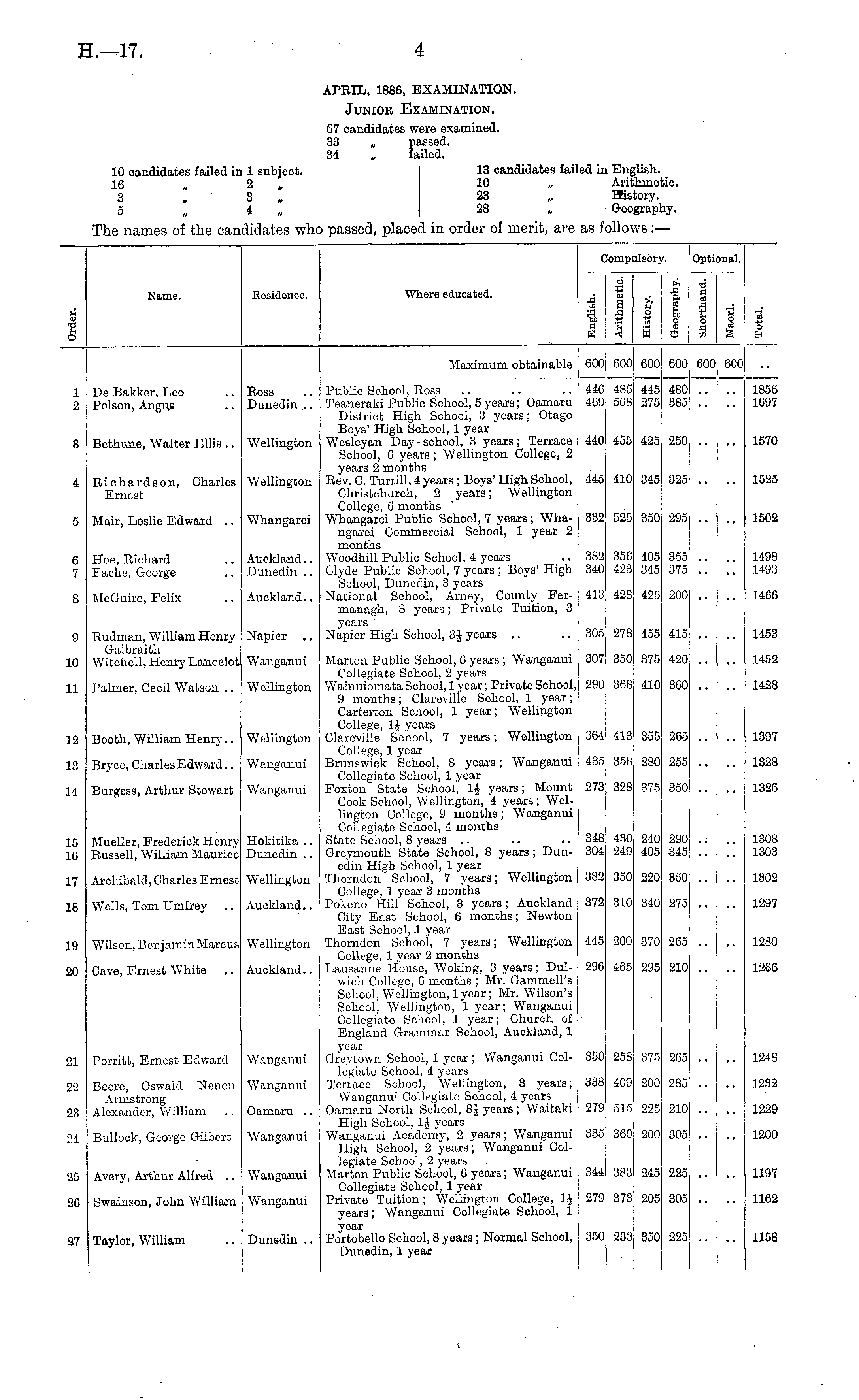 APEIL, 1886, EXAMINATION. Junioe Examination. 67 candidates were examined. 33 „ passed. 34 , failed. 10 candidates failed in 1 subject. 13 candidates failed in English. 16 „ 2 » 10 „ Arithmetic. 3,3. 23 History. 5 „ 4 „ 28 „ Geography. The names of the candidates who passed, placed in order of merit, are as follows:—