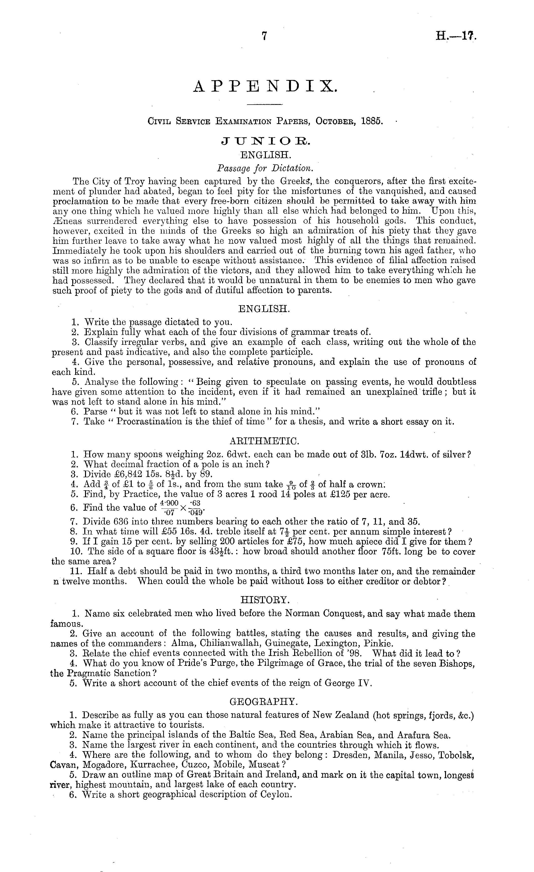 Civil Service Examination Papers, October, 1885. J TJ N" I O R. ENGLISH. Passage for Dictation. The City of Troy having been captured by the Greeks, the conquerors, after the first excitement of plunder had abated, began to feel pity for the misfortunes of the vanquished, and caused proclamation to be made that every free-born citizen should be permitted to take away with him any one thing which he valued more highly than all else which had belonged to him. Upon this, iEneas surrendered everything else to have possession of his household gods. This conduct, however, excited in the minds of the Greeks so high an admiration of his piety that they gave him further leave to take away what he now valued most highly of all the things that remained. Immediately he took upon his shoulders and carried out of the burning town his aged father, who was so infirm as to be unable to escape without assistance. This evidence of filial affection raised still more highly the admiration of the victors, and they allowed him to take everything which he had possessed. They declared that it would be unnatural in them to be enemies to men who gave such proof of piety to the gods and of dutiful affection to parents. ENGLISH. 1. Write the passage dictated to you. 2. Explain fully what each of the four divisions of grammar treats of. 3. Classify irregular verbs, and give an example of each class, writing out the whole of the present and past indicative, and also the complete participle. 4. Give the personal, possessive, and relative pronouns, and explain the use of pronouns of each kind. 5. Analyse the following : " Being given to speculate on passing events, he would doubtless have given some attention to the incident, even if it had remained an unexplained trifle ; but it was not left to stand alone in his mind." 6. Parse " but it was not left to stand alone in his mind." 7. Take " Procrastination is the thief of time " for a thesis, and write a short essay on it. ARITHMETIC. 1. How many spoons weighing 2oz. 6dwt. each can be made out of 31b. 7oz. 14dwt. of silver? 2. What decimal fraction of a pole is an inch? 3. Divide £6,842 15s. B^d. by 89. 4. Add fof£lto | of Is., and from the sum take of -f of half a crown; 5. Find, by Practice, the value of 3 acres 1 rood 14 poles at £125 per acre. 6. Find the value of -sp-X-jn?,. •07 -049 7. Divide 636 into three numbers bearing to each other the ratio of 7, 11, and 35. 8. In what time will £55 16s. 4d. treble itself at 1\ per cent, per annum simple interest ? 9. If I gain 15 per cent, by selling 200 articles for £75, how much apiece did I give for them ? 10. The side of a square floor is 43Jft.: how broad should another floor 75ft. long be to cover the same area? 11. Half a debt should be paid in two months, a third two months later on, and the remainder n twelve months. When could the whole be paid without loss to either creditor or debtor? HISTOEY. 1. Name six celebrated men who lived before the Norman Conquest, and say what made them famous. 2. Give an account of the following battles, stating the causes and results, and giving the names of the commanders: Alma, Chilianwallah, Guinegate, Lexington, Pinkie. 3. Eelate the chief events connected with the Irish Rebellion of '98. What did it lead to ? 4. What do you know of Pride's Purge, the Pilgrimage of Grace, the trial of the seven Bishops, the Pragmatic Sanction ? 5. Write a short account of the chief events of the reign of George IV. GEOGRAPHY. 1. Describe as fully as you can those natural features of New Zealand (hot springs, fjords, &c.) which make it attractive to tourists. 2. Name the principal islands of the Baltic Sea, Red Sea, Arabian Sea, and Arafura Sea. 3. Name the largest river in each continent, and the countries through which it flows. 4. Where are the following, and to whom do they belong : Dresden, Manila, Jesso, Tobolsk, Cavan, Mogadore, Kurrachee, Cuzco, Mobile, Muscat ? 5. Draw an outline map of Great Britain and Ireland, and mark on it the capital town, longest river, highest mountain, and largest lake of each country. 6. Write a short geographical description of Ceylon.