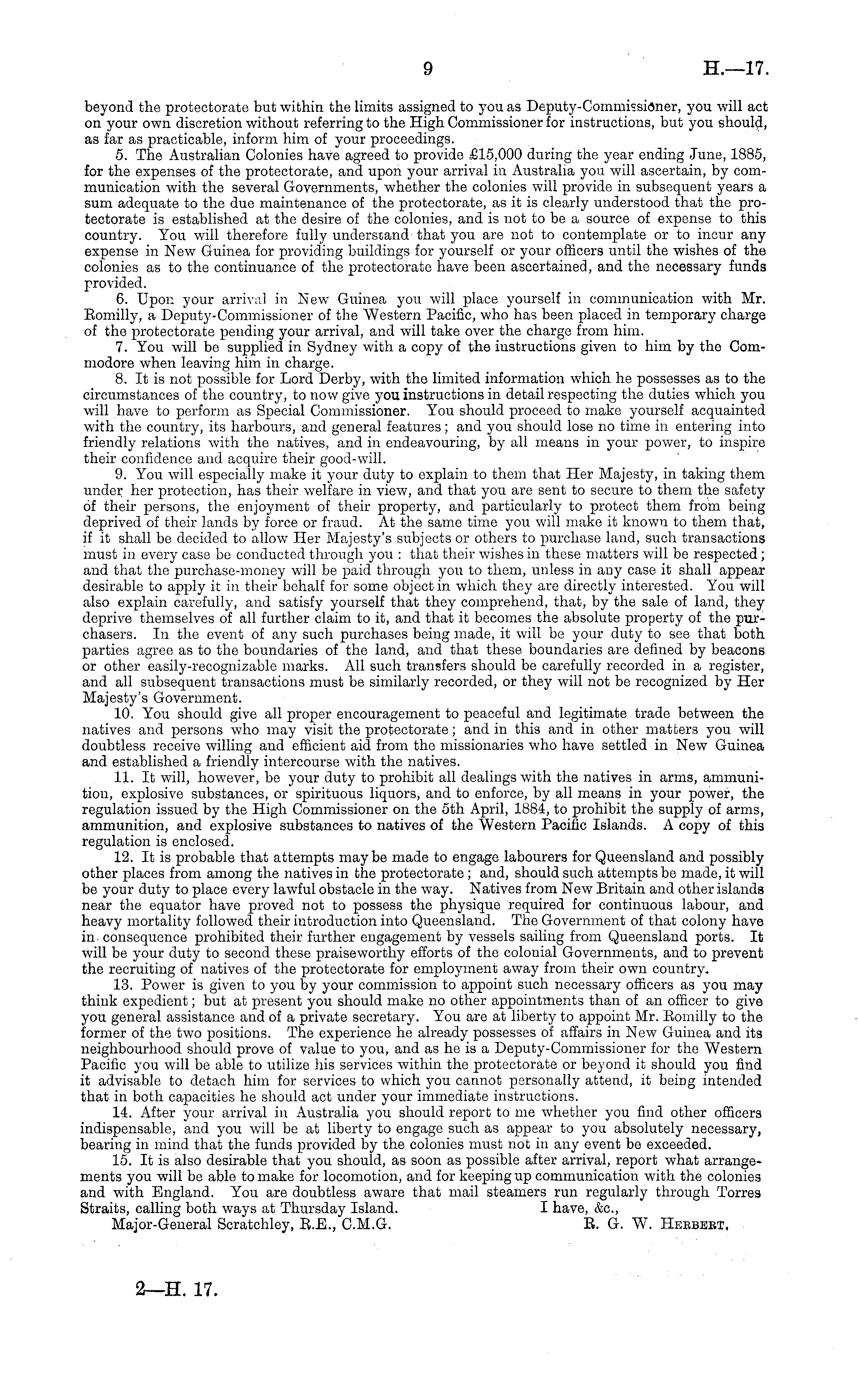 beyond the protectorate but within the limits assigned to you as Deputy-Coimni?si(sner, you will act on your own discretion without referring to the High Commissioner for instructions, but you should, as far as practicable, inform him of your proceedings. 5. The Australian Colonies have agreed to provide £15,000 during the year ending June, 1885, for the expenses of the protectorate, and upon your arrival in Australia you will ascertain, by communication with the several Governments, whether the colonies will provide in subsequent years a sum adequate to the due maintenance of the protectorate, as it is clearly understood that the protectorate is established at the desire of the colonies, and is not to be a source of expense to this country. You will therefore fully understand that you are not to contemplate or to incur any expense in New Guinea for providing buildings for yourself or your officers until the wishes of the colonies as to the continuance of the protectorate have been ascertained, and the necessary funds provided. 6. Upon your arrival in New Guinea you will place yourself in communication with Mr. Eomilly, a Deputy-Commissioner of the Western Pacific, who has been placed in temporary charge of the protectorate pending your arrival, and will take over the charge from him. 7. You will be supplied in Sydney with a copy of the instructions given to him by the Commodore when leaving him in charge. 8. It is not possible for Lord Derby, with the limited information which he possesses as to the circumstances of the country, to now give you instructions in detail respecting the duties which you will have to perform as Special Commissioner. You should proceed to make yourself acquainted with the country, its harbours, and general features; and you should lose no time in entering into friendly relations with the natives, and in endeavouring, by all means in your power, to inspire their confidence and acquire their good-will. 9. You will especially make it your duty to explain to them that Her Majesty, in taking them under her protection, has their welfare in view, and that you are sent to secure to them the safety of their persons, the enjoyment of their property, and particularly to protect them from being deprived of their lands by force or fraud. At the same time you will make it known to them that, if it shall be decided to allow Her Majesty's subjects or others to purchase land, such transactions must in every case be conducted through you : that their wishes in these matters will be respected ; and that the purchase-money will be paid through you to them, unless in any case it shall appear desirable to apply it in their behalf for some object in which they are directly interested. You will also explain carefully, and satisfy yourself that they comprehend, that, by the sale of land, they deprive themselves of all further claim to it, and that it becomes the absolute property of the purchasers. In the event of any such purchases being made, it will be your duty to see that both parties agree as to the boundaries of the land, and that these boundaries are defined by beacons or other easily-recognizable marks. All such transfers should be carefully recorded in a register, and all subsequent transactions must be similarly recorded, or they will not be recognized by Her Majesty's Government. 10. You should give all proper encouragement to peaceful and legitimate trade between the natives and persons who may visit the protectorate; and in this and in other matters you will doubtless receive willing and efficient aid from the missionaries who have settled in New Guinea and established a friendly intercourse with the natives. 11. It will, however, be your duty to prohibit all dealings with the natives in arms, ammunition, explosive substances, or spirituous liquors, and to enforce, by all means in your power, the regulation issued by the High Commissioner on the sth April, 1884, to prohibit the supply of arms, ammunition, and explosive substances to natives of the Western Pacific Islands. A copy of this regulation is enclosed. 12. It is probable that attempts maybe made to engage labourers for Queensland and possibly other places from among the natives in the protectorate ; and, should such attempts be made, it will be your duty to place every lawful obstacle in the way. Natives from New Britain and other islands near the equator have proved not to possess the physique required for continuous labour, and heavy mortality followed their introduction into Queensland. The Government of that colony have in consequence prohibited their further engagement by vessels sailing from Queensland ports. It will be your duty to second these praiseworthy efforts of the colonial Governments, and to prevent the recruiting of natives of the protectorate for employment away from their own country. 13. Power is given to you by your commission to appoint such necessary officers as you may think expedient; but at present you should make no other appointments than of an officer to give you general assistance and of a private secretary. You are at liberty to appoint Mr. Eomilly to the former of the two positions. The experience he already possesses of affairs in New Guinea and its neighbourhood should prove of value to you, and as he is a Deputy-Commissioner for the Western Pacific you will be able to utilize his services within the protectorate or beyond it should you find it advisable to detach him for services to which you cannot personally attend, it being intended that in both capacities he should act under your immediate instructions. 14. After your arrival in Australia you should report to me whether you find other officers indispensable, and you will be at liberty to engage such as appear to you absolutely necessary, bearing in mind that the funds provided by the colonies must not in any event be exceeded. 15. It is also desirable that you should, as soon as possible after arrival, report what arrangeme
