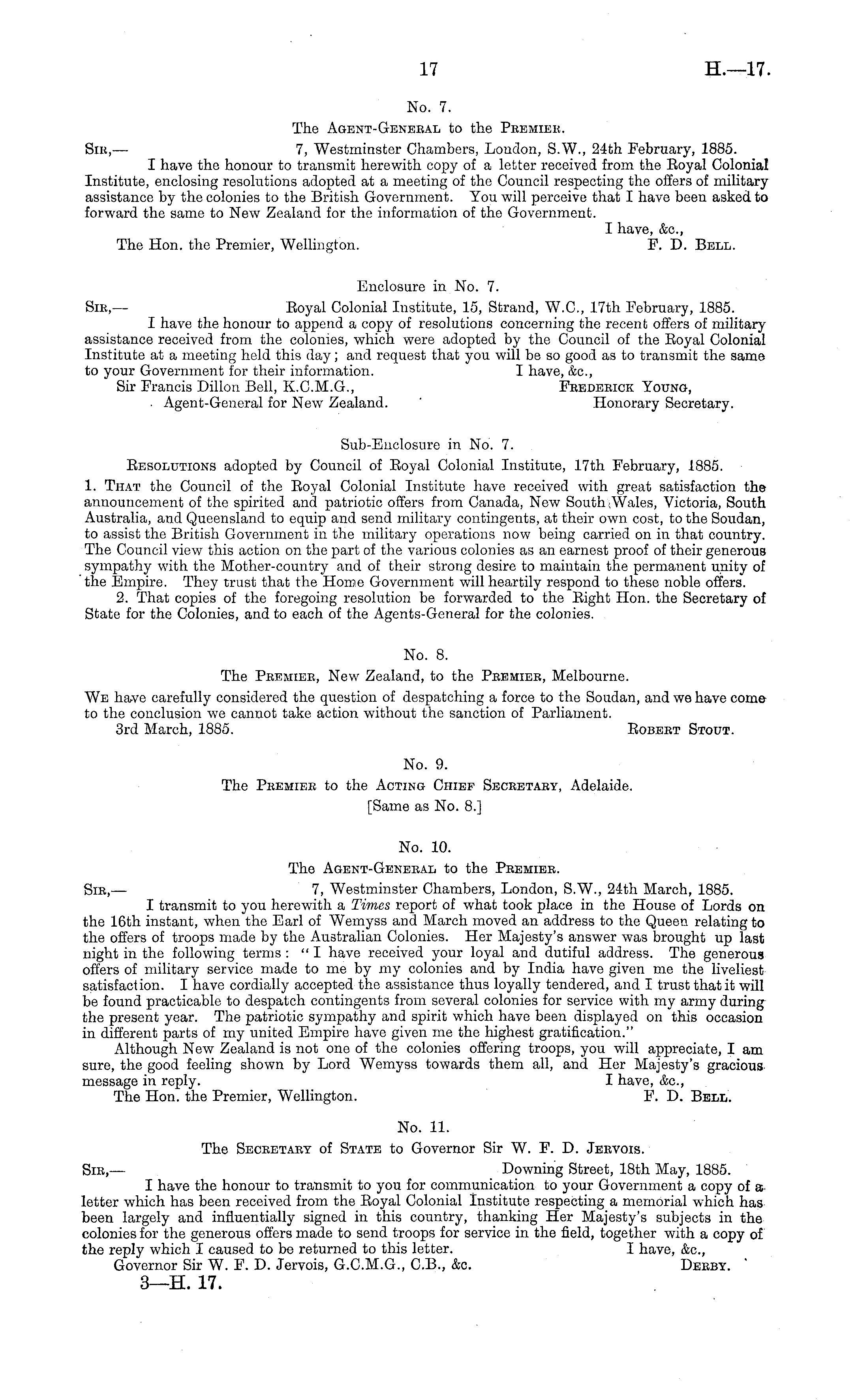 No. 7. The Agent-Genebal to the Peemiee. Sik, — 7, Westminster Chambers, London, S.W., 24th February, 1885. I have the honour to transmit herewith copy of a letter received from the Eoyal Colonial Institute, enclosing resolutions adopted at a meeting of the Council respecting the offers of military assistance by the colonies to the British Government. You will perceive that I have been asked to forward the same to New Zealand for the information of the Government. I have, &c, The Hon. the Premier, Wellington. F. D. Bell. Enclosure in No. 7. Sik,— Eoyal Colonial Institute, 15, Strand, W.C., 17th February, 1885. I have the honour to append a copy of resolutions concerning the recent offers of military assistance received from the colonies, which were adopted by the Council of the Eoyal Colonial Institute at a meeting held this day; and request that you will be so good as to transmit the same to your Government for their information. I have, &c, Sir Francis Dillon Bell, K.C.M.G., Feedekick Young, ■ Agent-General for New Zealand. Honorary Secretary. Sub-Enclosure in No. 7. Besolutions adopted by Council of Boyal Colonial Institute, 17th February, 1885. 1. That the Council of the Boyal Colonial Institute have received with great satisfaction the announcement of the spirited and patriotic offers from Canada, New South Wales, Victoria, South Australia, and Queensland to equip and send military contingents, at their own cost, to the Soudan, to assist the British Government in the military operations now being carried on in that country. The Council view this action on the part of the various colonies as an earnest proof of their generous sympathy with the Mother-country and of their strong desire to maintain the permanent unity of the Empire. They trust that the Home Government will heartily respond to these noble offers. 2. That copies of the foregoing resolution be forwarded to the Bight Hon. the Secretary of State for the Colonies, and to each of the Agents-General for the colonies. No. 8. The Peemieb, New Zealand, to the Pkemiee, Melbourne. We have carefully considered the question of despatching a force to the Soudan, and we have come to the conclusion we cannot take action without the sanction of Parliament. 3rd March, 1885. Bobeet Stout. No. 9. The Peemieb to the Acting Chief Seceetaey, Adelaide. [Same as No. B.] No. 10. The Agent-Geneeal to the Peemieb. Sik,— 7, Westminster Chambers, London, S.W., 24th March, 1885. I transmit to you herewith a Times report of what took place in the House of Lords on the 16th instant, when the Earl of Wemyss and March moved an address to the Queen relating to the offers of troops made by the Australian Colonies. Her Majesty's answer was brought up last night in the following terms : " I have received your loyal and dutiful address. The generous offers of military service made to me by my colonies and by India have given me the liveliest satisfaction. I have cordially accepted the assistance thus loyally tendered, and I trust that it will be found practicable to despatch contingents from several colonies for service with my army during the present year. The patriotic sympathy and spirit which have been displayed on this occasion in different parts of my united Empire have given me the highest gratification." Although New Zealand is not one of the colonies offering troops, you will appreciate, I am sure, the good feeling shown by Lord Wemyss towards them all, and Her Majesty's gracious message in reply. I have, &c, The Hon. the Premier, Wellington. F. D. Bell. No. 11. The Secbetaby of State to Governor Sir W. F. D. Jeevois. Sic,— Downing Street, 18th May, 1885. I have the honour to transmit to you for communication to your Government a copy of a letter which has been received from the Boyal Colonial Institute respecting a memorial which has been largely and influentially signed in this country, thanking Her Majesty's subjects in the colonies for the generous offers made to send troops for service in the field, together with a copy of the reply which I caused to be returned to this letter. I have, &c, Governor Sir W. F. D. Jervois, G.C.M.G., C.8., &c. Deeby. 3—H. 17.