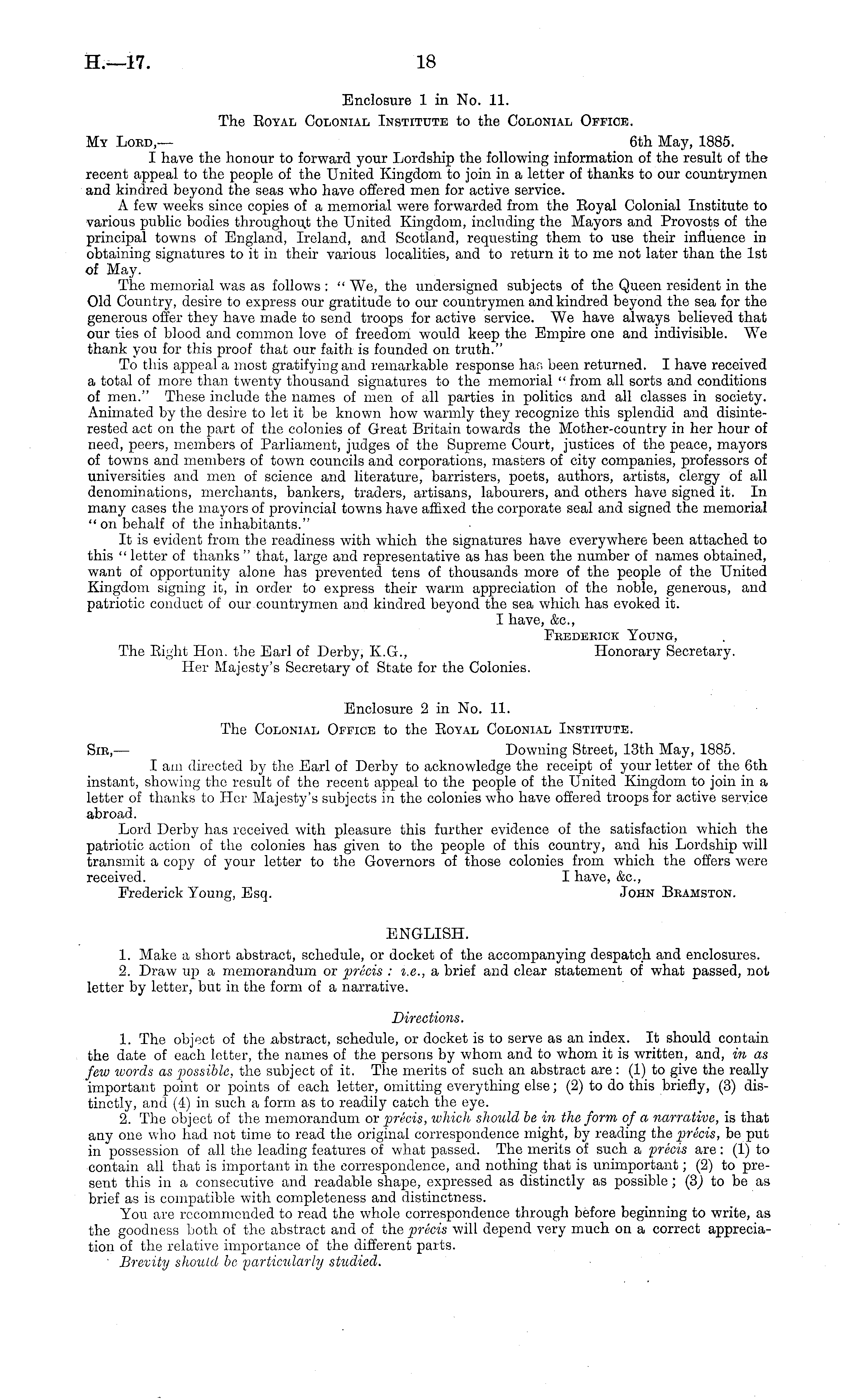 Enclosure 1 in No. 11. The Eoyal Colonial Institute to the Colonial Office. My Lord,— 6th May, 1885. I have the honour to forward your Lordship the following information of the result of the recent appeal to the people of the United Kingdom to join in a letter of thanks to our countrymen and kindred beyond the seas who have offered men for active service. A few weeks since copies of a memorial were forwarded from the Eoyal Colonial Institute to various public bodies throughout; the United Kingdom, including the Mayors and Provosts of the principal towns of England, Ireland, and Scotland, requesting them to use their influence in obtaining signatures to it in their various localities, and to return it to me not later than the Ist of May. The memorial was as follows : " We, the undersigned subjects of the Queen resident in the Old Country, desire to express our gratitude to our countrymen and kindred beyond the sea for the generous offer they have made to send troops for active service. We have always believed that our ties of blood and common love of freedom would keep the Empire one and indivisible. We thank you for this proof that our faith is founded on truth." To this appeal a most gratifying and remarkable response har, been returned. I have received a total of more than twenty thousand signatures to the memorial " from all sorts and conditions of men." These include the names of men of all parties in politics and all classes in society. Animated by the desire to let it be known how warmly they recognize this splendid and disinterested act on the part of the colonies of Great Britain towards the Mother-country in her hour of need, peers, members of Parliament, judges of the Supreme Court, justices of the peace, mayors of towns and members of town councils and corporations, masters of city companies, professors of universities and men of science and literature, barristers, poets, authors, artists, clergy of all denominations, merchants, bankers, traders, artisans, labourers, and others have signed it. In many cases the mayors of provincial towns have affixed the corporate seal and signed the memorial " on behalf of the inhabitants." It is evident from the readiness with which the signatures have everywhere been attached to this " letter of thanks " that, large and representative as has been the number of names obtained, want of opportunity alone has prevented tens of thousands more of the people of the United Kingdom signing it, in order to express their warm appreciation of the noble, generous, and patriotic conduct of our countrymen and kindred beyond the sea which has evoked it. I have, &c, Frederick Young, The Eight Hon. the Earl of Derby, K.G., Honorary Secretary. Her Majesty's Secretary of State for the Colonies. Enclosure 2 in No. 11. The Colonial Office to the Eoyal Colonial Institute. Sir,— Downing Street, 13th May, 1885. I am directed by the Earl of Derby to acknowledge the receipt of your letter of the 6th instant, showing the result of the recent appeal to the people of the United Kingdom to join in a letter of thanks to Her Majesty's subjects in the colonies who have offered troops for active service abroad. Lord Derby has received with pleasure this further evidence of the satisfaction which the patriotic action of the colonies has given to the people of this country, and his Lordship will transmit a copy of your letter to the Governors of those colonies from which the offers were received. I have, &c, Frederick Young, Esq. John Bramston. ENGLISH. 1. Make a short abstract, schedule, or docket of the accompanying despatch and enclosures. 2. Draw up a memorandum or precis : %.e., a brief and clear statement of what passed, not letter by letter, but in the form of a narrative. Directions. 1. The object of the abstract, schedule, or docket is to serve as an index. It should contain the date of each letter, the names of the persons by whom and to whom it is written, and, in as few words as possible, the subject of it. The merits of such an abstract are : (1) to give the really important point or points of each letter, omitting everything else; (2) to do this briefly, (3) distinctly, and (4) in such a form as to readily catch the eye. 2. The object of the memorandum or precis, which should be in the form of a narrative, is that any one who had not time to read the original correspondence might, by reading the precis, be put in possession of all the leading features of what passed. The merits of such a precis are: (1) to contain all that is important in the correspondence, and nothing that is unimportant; (2) to present this in a consecutive and readable shape, expressed as distinctly as possible ; (3) to be as brief as is compatible with completeness and distinctness. You are recommended to read the whole correspondence through before beginning to write, as the goodness both of the abstract and of the precis will depend very much on a correct appreciation of the relative importance of the different parts. Brevity should be particularly studied.