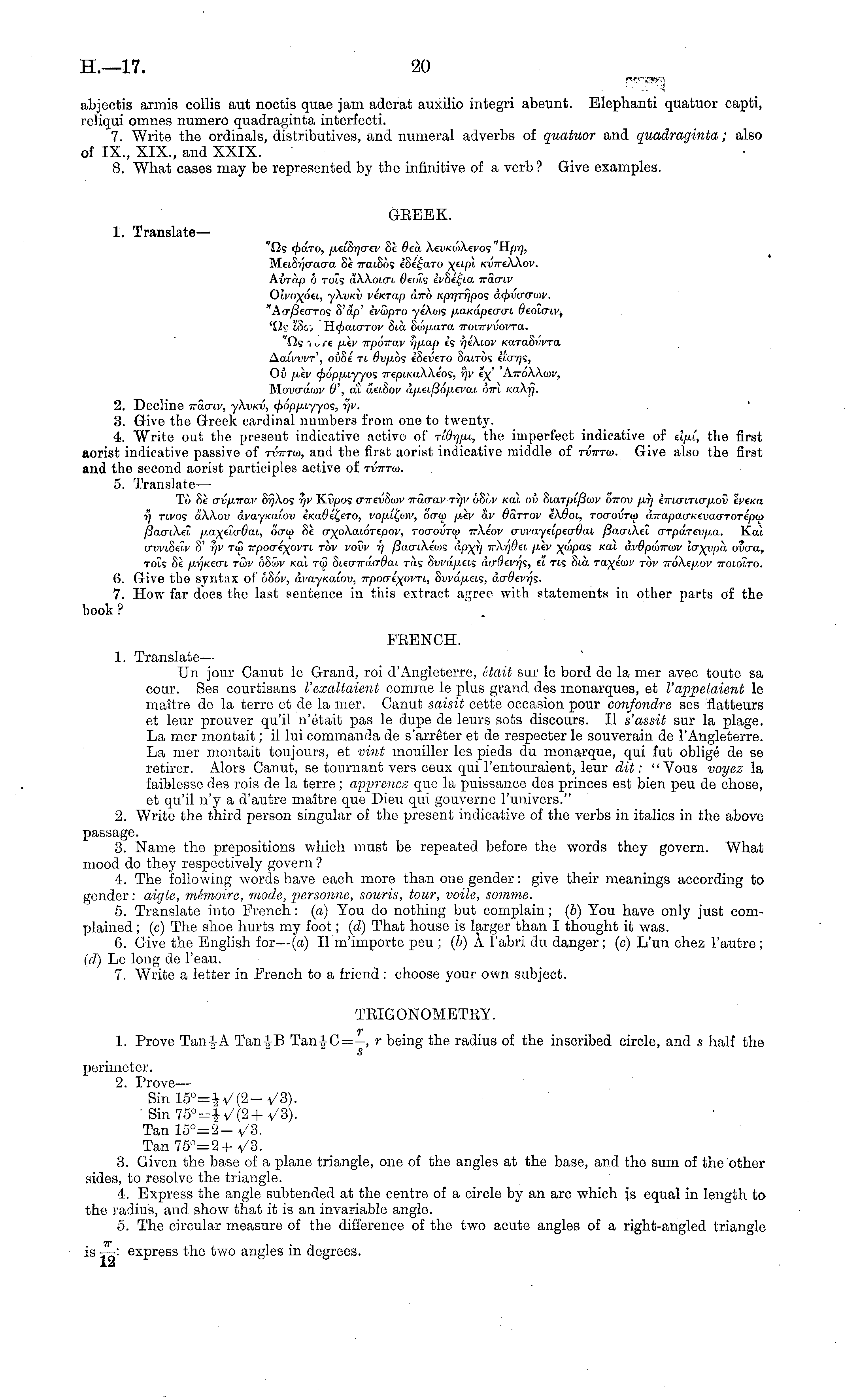 nSTBBFa abjectis armis collis aut noctis quae jam aderat auxilio integri abeunt. Elephanti quatuor capti, reliqui omnes numero quadraginta interfecti. 7. Write the ordinals, distributives, and numeral adverbs of quatuor and quadraginta ; also of IX., XIX., and XXIX. 8. What cases may be represented by the infinitive of a verb ? Give examples. GREEK. 1. Translate — "Os ifrdro, fiMotfWtv 8c 6ca XevKwXtvo*; Rprj, MeiSijcrao-a 8. 7. aiSos -B.£a.To x^V 1- KvireXXov. Avrdp 6 TOIS dXXourL #eo._ ei__£ia rrdcTiv Oivovoll, yXvKv veKrap dirb KprjTrjpOS d<f>vir<Tu>v. "AtrfiaTTos S'dp' tlfStpro y.A.o)_ paicdparaL Beolo-iv, 'fi_ t'Sc; HtpaUTTOV Bia ftdipara Tronrvvovra. "12. \yft piv rrporrav r/pap c. rjiXlOV KaraSvvra Aaivvvr, 0.8. Tt dvpbs iSevero BaiT os ei'cnj., O. pkv <f>6ppiyyos 9rCOIKaAA,€O?, rjv e^' AttoXXwv, M.ovudo>v 6\ dl ueiSoi/ djiafSbpevai mi KaXfj. 2. Decline rrdo-iv, yXvKv, <^op/_fyyos, rjv. 3. Give the Greek cardinal numbers from one to twenty. 4. Write out the present indicative active of riOr/pi, the imperfect indicative of dpi, the first aorist indicative passive of tvtttu), and the first aorist indicative middle of tvwtui. Give also the first and the second aorist participles active of rurrro). 5. Translate — To Se (rvpirav SrjXos rjv Kvpo. cnrevSoiv rrdrrav rrjv oobv Kal ov tyiarpiftaiv brrov py) irrunTurpLov eveKa rj Ttvo. dXXov dvayKaiov _Kc_9_£e.o, vopiQoiv, oo"w p\v dv Odrrov eXOoi, Torroura) d—apao-Kevao-Toripuy /3a<riXei pavtl<r6ai, o<™ 8. tr\oXaioT^pov, toctovtw ttX&ov o-vvayelpecrdai ftaaiXa. crrpdrevpa. Kat <rvviseiv 8' rjv rw Trpocr£)(OVTi rbv vovv rj /3a<nXiws apxf] wXrjdci piv Kal dvdpd>-n-u>v la^vpa ovcra, toTs 8. prJKetri t£>v bSmv Kal tw ftivnrdcrdai ra. Owdp.€K dcrDcvrjs, c" ns Sia ra\ew rbv rrbXepov iroioiro. 6. Give the syntax of 68oV, dvayKaiov, Trpo(Te)(oVTi, OVVdptls, ctcr_?cj'ijs. 7. How far does the last sentence in this extract agree with statements in other parts of the book ? FRENCH. 1. Translate — Un jour Canut le Grand, roi d'Angleterre, etait sax le bord de la mer avec toute sa cour. Ses courtisans I'exaltaient comme le plus grand dcs monarques, et Vappclaicnt le maitre de la terre et de la mer. Canut saisit cette occasion pour confondre ses fiatteurs et leur prouver qu'il n'etait pas le dupe de leurs sots discours. II s'assit sur la plage. La mer montait; il lvi commanda de s'arreter et de respecter le souverain de l'Angleterre. La mer montait toujours, et vint mouiller les pieds dv monarque, gui fut oblige de se retirer. Alors Canut, se tournant vers ceux gui l'entouraient, leur dit: "Vous voycz la faiblesse dcs rois de la terre; apprcnez que la puissance dcs princes est bien peu de chose, et qu'il ny a d'autre maitre que Dieu gui gouverne l'univers." 2. Write the third person singular of the present indicative of the verbs in italics in the above passage. 3. Name the prepositions which must be repeated before the words they govern. What mood do they respectively govern'? 4. The following words have each more than one gender: give their meanings according to gender: aigle, memoire, mode, personne, souris, tour, voile, somme. 5. Translate into French: (a) You do nothing but complain; (b) You have only just complained ; (c) The shoe hurts my foot; (d) That house is larger than I thought it was. 6. Give the English for— (a) II m'importe peu ; (b) A l'abri dv danger; (c) L'un chez l'autre; (d) Le long de l'eau. 7. Write a letter in French to a friend : choose your own subject. TRIGONOMETRY. r 1. Prove TaniA Tan^B TaniC =-, r being the radius of the inscribed circle, and . half the perimeter. 2. Prove — Sinls°=-i r v/(2-v/3). ' Sin 75 0 = iv/(2-|-v/3). Tan 16°=2-^3. Tan 75°= 2+a/3. 3. Given the base of a plane triangle, one of the angles at the base, and the sum of the other sides, to resolve the triangle. 4. Express the angle subtended at the centre of a circle by an arc which is equal in length to the radius, and show that it is an invariable angle. 5. The circular measure of the difference of the two acute angles of a right-angled triangle is rg: express the two angles in degrees. MS