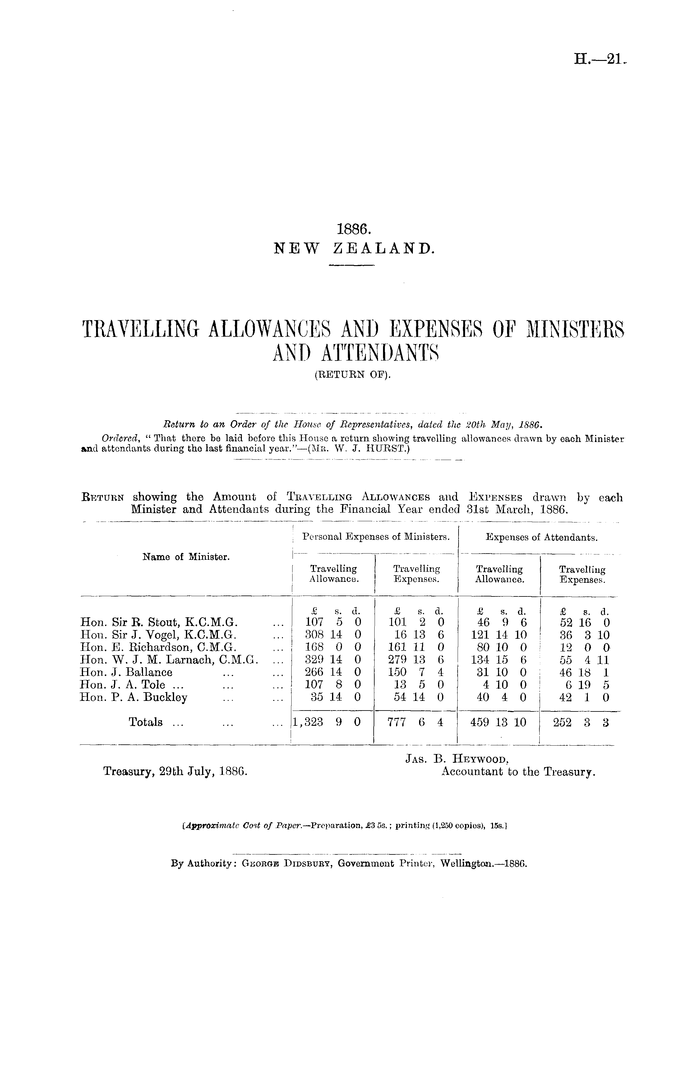Personal Expe: ises of Ministers. Expenses o: Attendants. Name of Minister. Travelling Allowance. Travelling Expenses. Travelling Allowance. Travelling Expenses. Ion. Sir R. Stout, K.C.M.G. Ion. Sir J. Vogel, K.C.M.G. Ion. E. Richardson, C.M.G. Ion. W. J. M. Larnach, C.M.G. Ion. J. Ballance Ion. J. A. Tole ... Ion. P. A. Buckley £ s. cl. 107 5 0 308 14 0 168 0 0 329 14 0 266 14 0 107 8 0 35 14 0 £ 8. d. 101 2 0 16 13 6 161 11 0 279 13 6 150 7 4 13 5 0 54 14 0 £ s. d. 46 9 6 121 14 10 80 10 0 134 15 6 31 10 0 4 10 0 40 4 0 £ s. d. 52 16 0 36 3 10 12 0 0 55 4 11 46 18 1 6 19 5 42 1 0 Totals ... 1,323 9 0 777 6 4 459 13 10 252 3 3