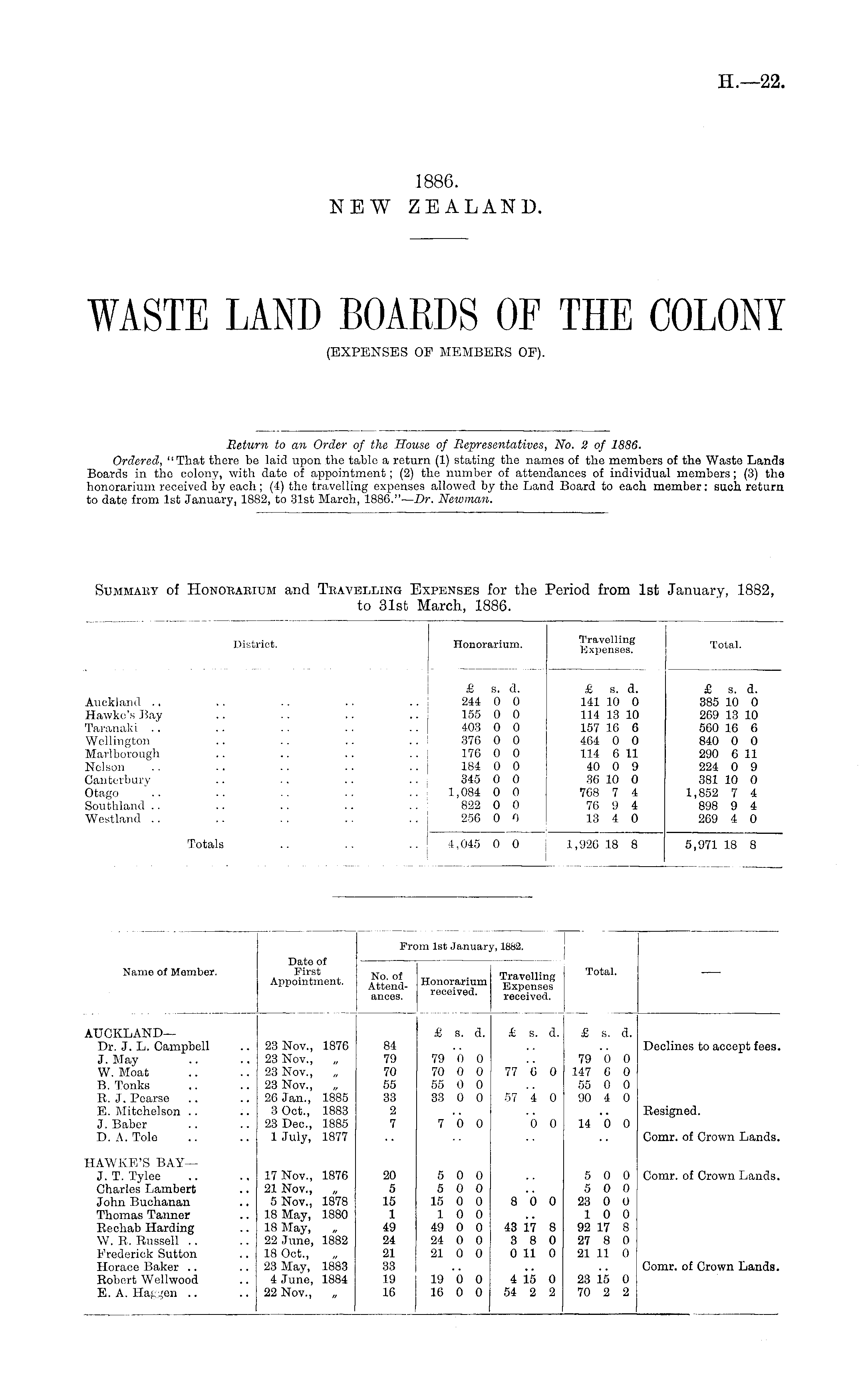 Return to an Order of the House of Representatives, No. 2 of 1886. Ordered, "That there be laid upon the table a return (1) stating the names of the members of the Waste Lands Boards in the colony, with date of appointment; (2) the number of attendances of individual members; (3) the honorarium received by each; (4) the travelling expenses allowed by the Land Board to each member: such, return to date from Ist January, 1882, to 31st March, 1886."— Dr. Newman.