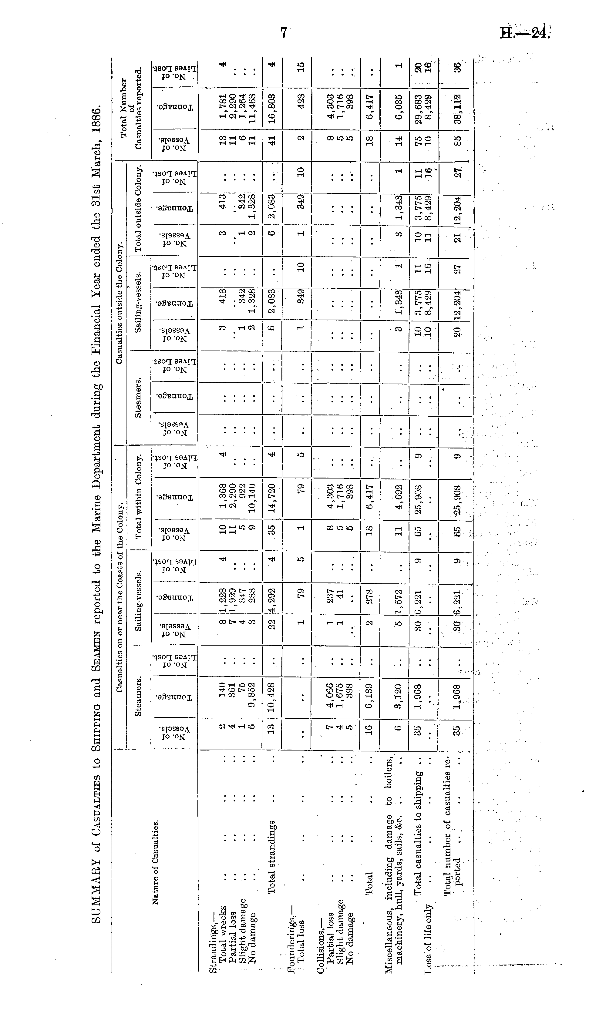 SUMMARY of Casualties to Shipping and Seamen reported to the Marine Department during the Financial Year ended the 31st March, 1886.