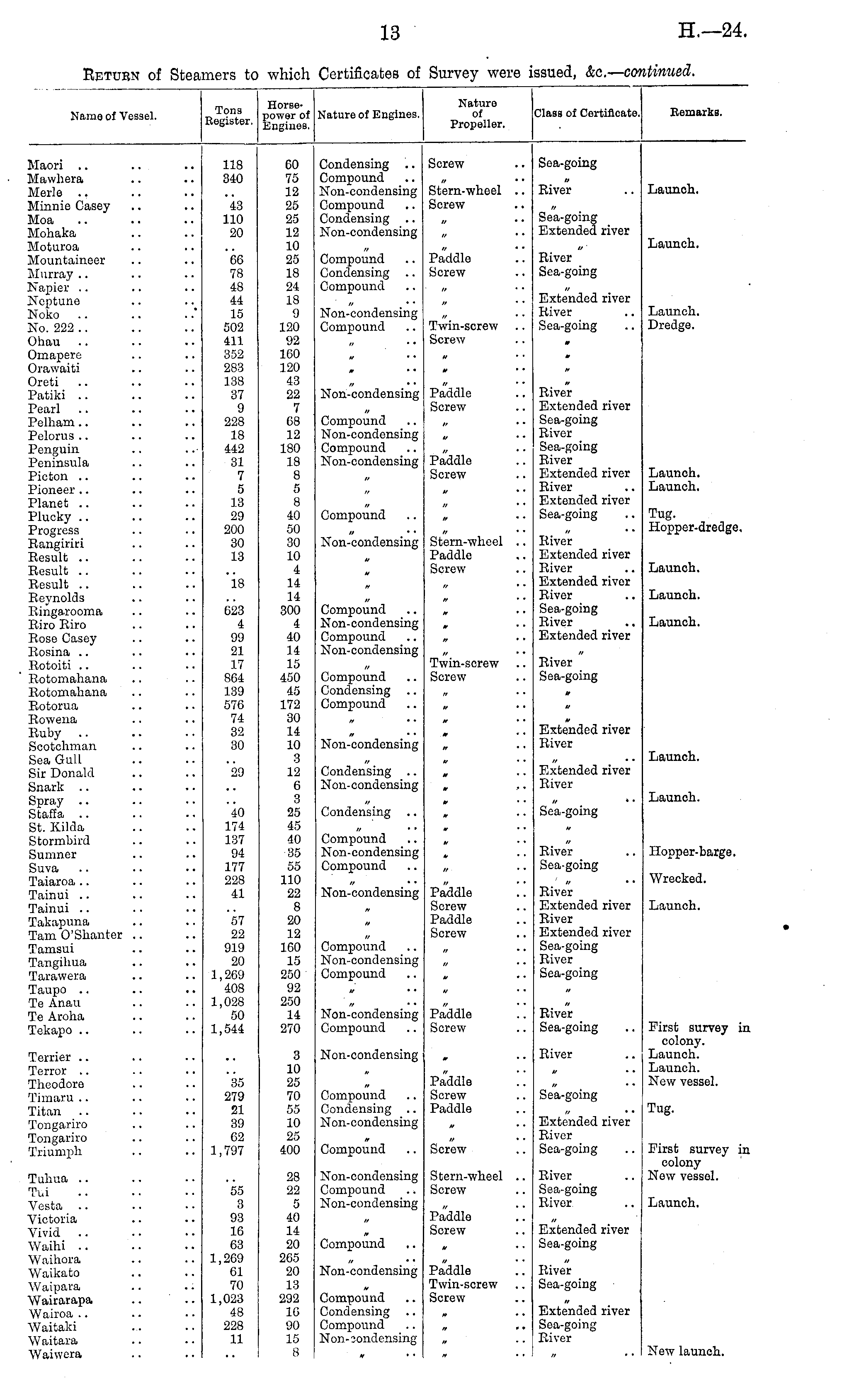 Name of Vessel. Tons Register. Horsepower of Nature of Engines. Engines. Nature of Propoller. Class of Certificate. Bemarks. Maori Mawhera Merle Minnie Casey Moa Mohaka Moturoa Mountaineer Murray Napier Neptune Noko No. 222 .. Ohau Omapere Orawaiti Oreti Patiki Pearl Pelham Pelorus Penguin Peninsula Picton Pioneer Planet .. Plucky Progress Rangiriri Result Result .. Result .. Reynolds Ringa,rooma Riro Riro Rose Casey Rosina Rotoiti .. Rotomahana Rotomahana Rotorua Rowena Ruby Scotchman Sea Gull Sir Donald Snark Spray .. Staffa St. Kilda Stormbird Sumner Suva Taiaroa Tainui Tainui Takapuna Tarn O'Shantor .. Tamsui Tangihua Tarawcra Taupo .. Te Anau Te Aroha Tekapo 118 340 60 75 12 25 25 12 10 25 18 24 18 9 120 92 100 120 43 22 7 68 12 180 18 8 5 8 40 50 30 10 4 14 14 300 4 40 14 15 450 45 172 30 14 10 3 12 6 3 25 45 40 35 55 110 22 8 20 12 160 15 250 92 250 14 270 Condensing .. Compound Non-condensing Compound Condensing .. Non-condensing Screw Soa-going 43 110 20 Stern-wheel .. Screw River Launch. Sea-going Extended river Launch. 66 78 48 44 15 502 411 352 283 138 37 9 228 18 442 31 7 5 13 29 200 30 13 Compound Condensing .. Compound Non-condensing Compound Non-eondensing Paddle !! Screw Twin-screw Screw Paddle Screw River Sea-going Extended river River Sea-going m River Extended river Sea-going River Sea-going River Extended river River Extended river Soa-going Launch. Dredge. Launch. Launch. Compound Non-condensing Compound Non-condensing Paddle Screw Compound Tug. Hopper-dredge. 'is Non-condensing Stern-wheel .. Paddle Screw River Extended river River Extended river River Sea-going River Extended river Launch. Launch. 623 4 99 21 17 864 139 576 74 32 30 Compound Non-condensing Compound Non-condensing Compound Condensing .. Compound Twin-serew Screw River Soa-going Launch. Non-condensing V • • Extended river River Launch. 29 Condensing Non-condensing ft . . Extended river River 40 174 137 94 177 228 41 Condensing » ... *• ■ . Sea-going Launch. Compound Non-condensing Compound River Sea-going Hopper-barge. Non-condensing Paddle !! Screw Paddle Screw River Extended river River Extended river Sea-going River Sea-going Wrecked. 57 22 919 20 1,269 408 1,028 50 1,544 Launch. Compound Non-condensing Compound Non-condensing Compound Paddle Screw River Sea-going First survey in colony. Launch. Launch. New vessel. Terrier Terror Theodore Timaru Titan Tongariro Tongariro Triumph 3 10 25 70 55 10 25 400 Non-condensing River 35 279 21 39 62 1,797 Compound Condensing .. Non-condensing Paddle Screw Paddle Sea-going Extended river River Sea-going Tug. Compound Screw First survey in colony New vessel. Tuhua .. Tui Vesta Victoria Vivid Waihi Waihora "VVaikato Waipara Wairarapa Wairoa Waitaki Waitara Waiwera 55 3 93 1G 63 1,269 61 70 1,023 48 228 11 28 22 5 40 14 20 2G5 20 13 292 16 90 15 8 Non-condensing Compound Non-condensing Stern-wheel .. Screw River Sea-going River Paddle Screw Extended river Soa-going Launch. Compound Non-condensing Paddle ! '. Twin-screw Screw River Sea-going Compound Condensing Compound Non-condensing Extended river Sea-going River New launch. H • •