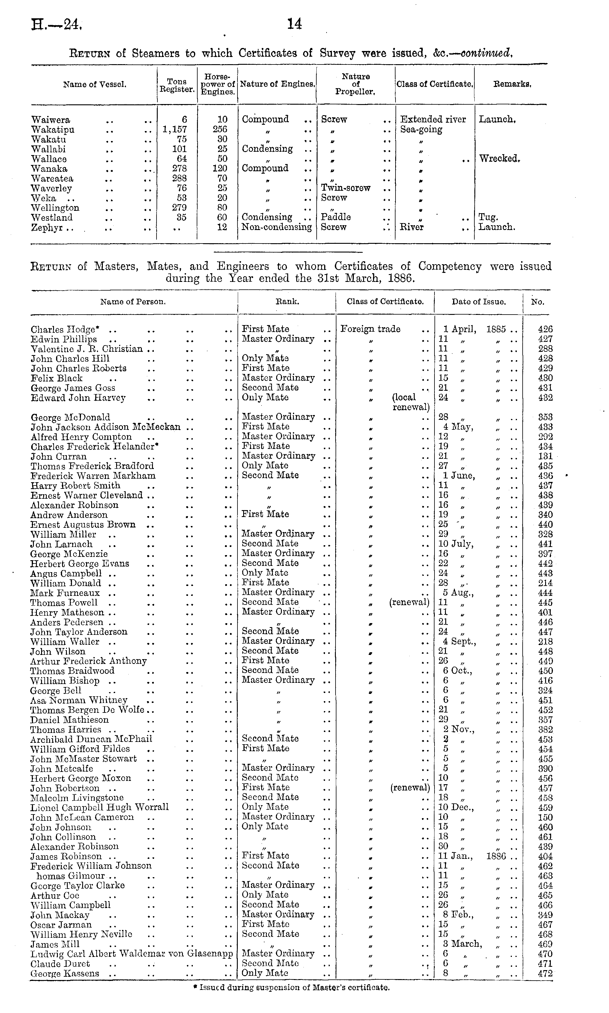 ISTamo of Person. 1 Hank. Class ot Certificate I Date of Issue No. Charles Hodge* Edwin Phillips Valentine J. R. Christian .. John Charles Hill John Charles Roberts Felix Black George James Goss Edward John Harvey First Mato Master Ordinary .. Foreign trade 1 April, 1885 .. 11 „ „ .. 11 , „ .. 11 „ „ ■■ 11 „ „ .. 15 „ „ .. 21 „ „ .. 24 „ „ .. 426 427 288 428 429 430 431 432 Only Mats First Mate Master Ordinary .. Second Mate Only Mate (local renewal) George McDonald John Jackson Addison McMeckan Alfred Henry Compton Charles Frederick Helander* John Outran Thorns s Frederick Bradford Frederick Warren Markham Harry Robert Smith Ernest Warner Cleveland Alexander Robinson Andrew Anderson Ernest Augustus Brown William Miller John Larnach George McKenzie Herbert George Evans Angus Campbell William Donald Mark Fumeaux Thomas Powell Henry Matheson Anders Pedersen John Taylor Anderson William Waller .. John Wilson Arthur Frederick Anthony Thomas Braidwood William Bishop George Bell Asa Norman Whitney Thomas Bergen Do Wolfe Daniel Mathieson Thomas Harries Archibald Duncan McPhail William Gifford Fildes .. John McMaster Stewart John Metcalfe Herbert George Moxon John Robertson Malcolm Livingstone Lionel Campbell Hugh Worrall John McLean Cameron John Johnson John Collinson Alexander Robinson James Robinson Frederick William Johnson homas Gilmour... George Taylor Clarke Arthur Coo William Campbell John Mackay Oscar Jarman William Henry Neville James Mill Ludwig Carl Albert Waldernar von Glasenapp Claude Duret George Kassens .. Master Ordinary .. First Mato Master Ordinary .. First Mate Master Ordinary .. Only Mate Second Mate 28 „ „ .. 4 May, „ .. 12 „ „ .. 19 „ „ .. 21 „ „ .. 27 „ „ .. 1 June, „ .. 11 „ „ ... 1G „ „ ■■ 16 „ „ .. 10 . „ .. 25 „ „ .. 23 „ „ .. 10 July, „ .. 16 „ „ .. 22 „ „ .. 24 „ „ .. 28 „• „ .. 5 Aug., „ .. 11 . „ .. n , , ... 21 „ „ .. 24 „ „ .. 4 Sept., „ .. 21 „ .. 26 „ „ .. 6 Oct., „ .. 6 „ „ .. G „ „ .. G „ „ .. 21 „ „ ... 29 „ „ .. 2 Nov., „ .. 2 5 "„ "„'.'. 5 » „ ■• 5 „ „ 17 „ „ .. 18 „ „ .. 10 Dec 10 „ „ .. 15 „ „ .. 18 „ „ .. 30 „ „ .. 11 Jan., 1886 .. 11 „ . .-. 11 , „ ... 18 „ „ ".. 26 „ „ .. 26 „ „ .. 8 Feb., „ .. 15 „ „ .. 15 „ „ .. 8 March, „ .. G „ .. 6 „ „ .. 8 „ .. 353 433 292 434 131 435 43G 437 438 439 340 440 328 441 397 442 443 214 444 445 401 44G 447 218 448 449 450 416 324 451 452 357 382 453 454 455 390 456 457 458 459 150 460 461 439 404 462 463 464 465 466 349 467 468 469 470 471 472 First Mate // • • Master Ordinary .. Second Mato Master Ordinary .. Second Mato Only Mato First Mato Master Ordinary .. Second Mate Master Ordinary .. ir • • (renewal) Second Mate Master Ordinary .. Second Mate First Mate Second Mate Master Ordinary .. *■ • • tr * • » • * ft • • it • ■ Second Mate First Mate Master Ordinary .. Second Mato First Mate Second Mato Only Mate Master Ordinary .. Only Mate „ (renewal) * • • First Mato Second Mate Master Ordinary .. Only Mate Second Mato Master Ordinary .. First Mato Second Mato Master Ordinary .. Second Mate Only Mate .. * Issued during suspension of Master's certificate.