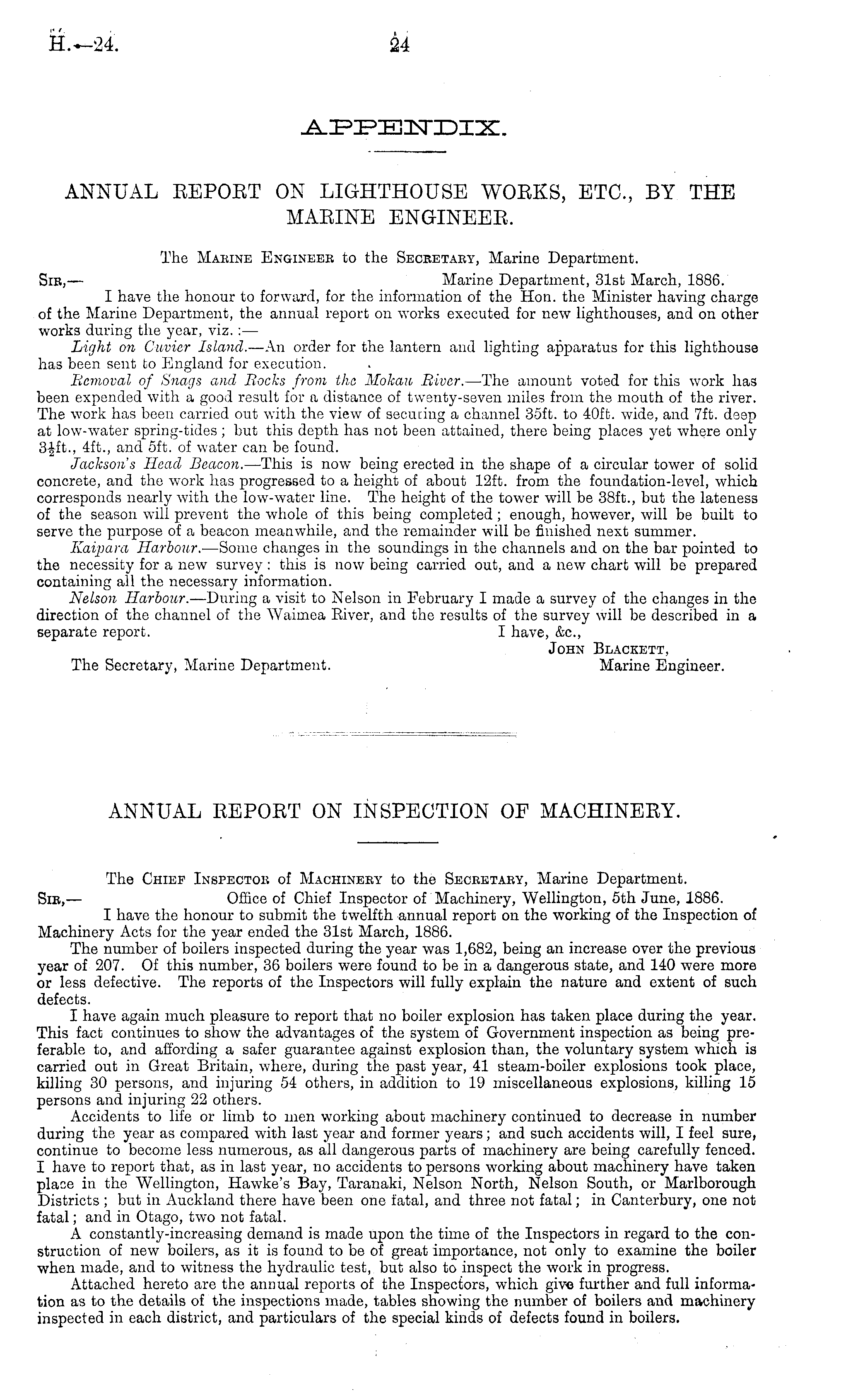 The Chief Inspectok of Machineky to the Seceetaey, Marine Department. Sic, — Office of Chief Inspector of Machinery, Wellington, sth June, 1886. I have the honour to submit the twelfth annual report on the working of the Inspection of Machinery Acts for the year ended the 31st March, 1886. The number of boilers inspected during the year was 1,682, being an increase over the previous year of 207. Of this number, 36 boilers were found to be in a dangerous state, and 140 were more or less defective. The reports of the Inspectors will fully explain the nature and extent of such defects. I have again much pleasure to report that no boiler explosion has taken place during the year. This fact continues to show the advantages of the system of Government inspection as being preferable to, and affording a safer guarantee against explosion than, the voluntary system which is carried out in Great Britain, where, during the past year, 41 steam-boiler explosions took place, killing 30 persons, and injuring 54 others, in addition to 19 miscellaneous explosions, killing 15 persons and injuring 22 others. Accidents to life or limb to men working about machinery continued to decrease in number during the year as compared with last year and former years; and such accidents will, I feel sure, continue to become less numerous, as all dangerous parts of machinery are being carefully fenced. I have to report that, as in last year, no accidents to persons working about machinery have taken plase in the Wellington, Hawke's Bay, Taranaki, Nelson North, Nelson South, or Maiiborough Districts ; but in Auckland there have been one fatal, and three not fatal; in Canterbury, one not fatal; and in Otago, two not fatal. A constantly-increasing demand is made upon the time of the Inspectors in regard to the construction of new boilers, as it is found to be of great importance, not only to examine the boiler when made, and to witness the hydraulic test, but also to inspect the work in progress. Attached hereto are the annual reports of the Inspectors, which give further and full information as to the details of the inspections made, tables showing the number of boilers and machinery inspected in each district, and particulars of the special kinds of defects found in boilers.