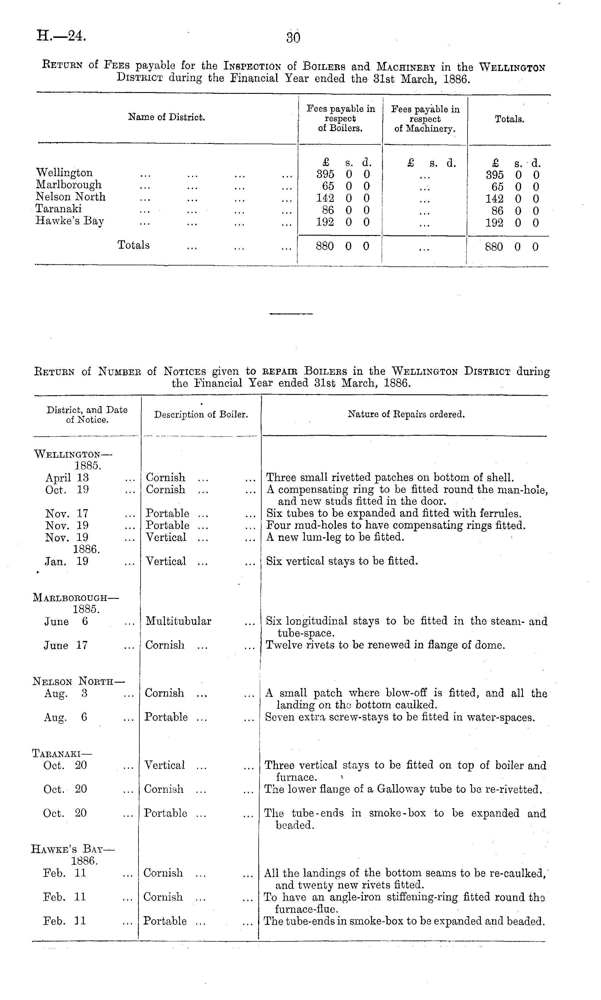 Name of District. ccs payable in respect of Boilers. Fees payable in respect of Machinery. Totals. Wellington Maryborough Nelson North Taranaki Hawke's Bay £ 395 65 142 86 192 s. a. 0 0 0 0 0 0 0 0 0 0 £ s. a. £ 395 65 142 86 192 s. d. 0 0 0 0 0 0 0 0 0 0 Totals 880 0 0 880 0 0