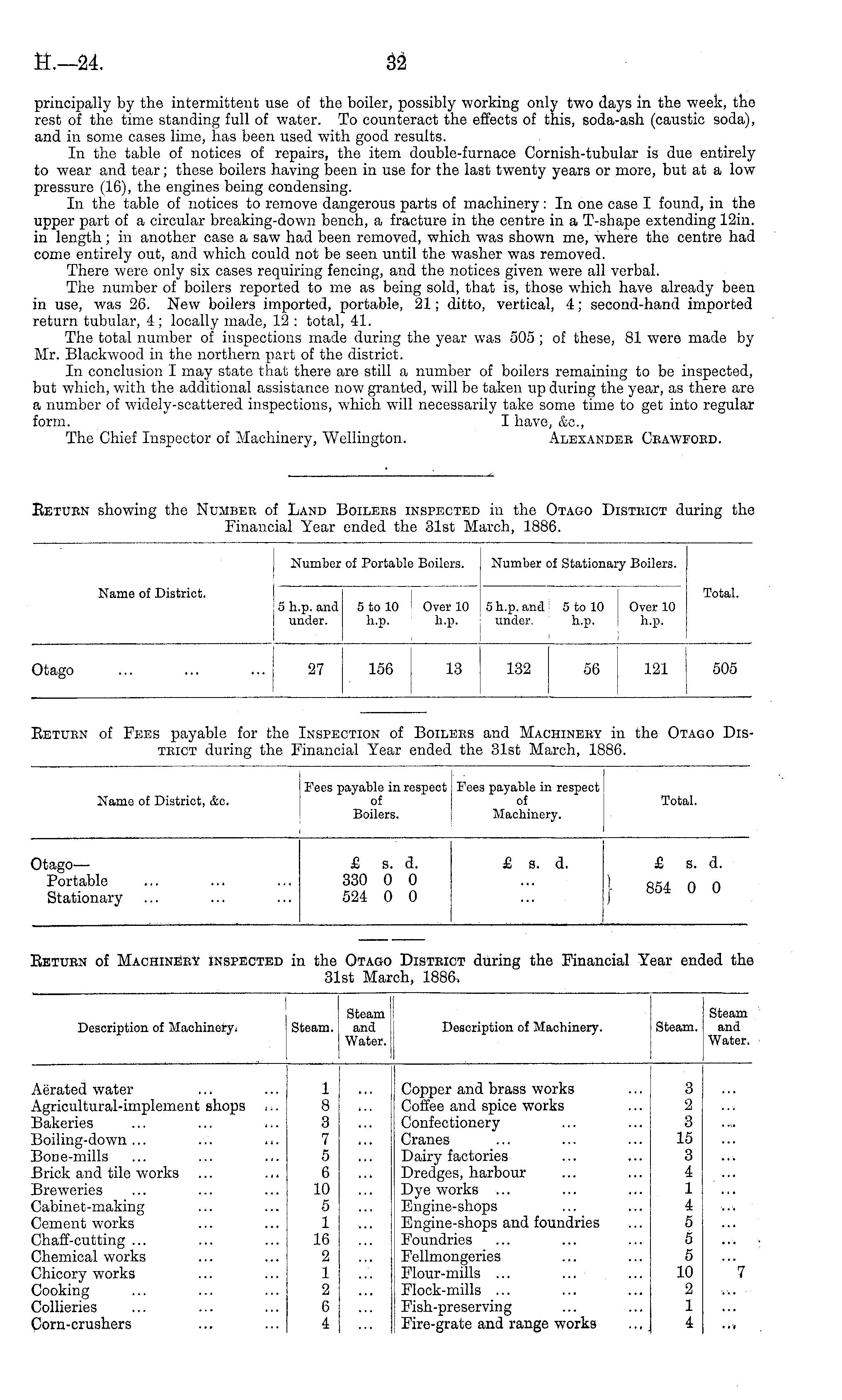 principally by the intermittent use of the boiler, possibly working only two days in the week, the rest of the time standing full of water. To counteract the effects of this, soda-ash (caustic soda), and in some cases lime, has been used with good results. In the table of notices of repairs, the item double-furnace Cornish-tubular is due entirely to wear and tear; these boilers having been in use for the last twenty years or more, but at a low pressure (16), the engines being condensing. In the table of notices to remove dangerous parts of machinery: In one case I found, in the upper part of a circular breaking-down bench, a fracture in the centre in a T-shape extending 12in. in length; in another case a saw had been removed, which was shown me, where the centre had come entirely out, and which could not be seen until the washer was removea. There were only six cases requiring fencing, and the notices given were all verbal. The number of boilers reported to me as being sold, that is, those which have already been in use, was 26. New boilers imported, portable, 21; ditto, vertical, 4; second-hand imported return tubular, 4; locally made, 12 : total, 41. The total number of inspections made auring the year was 505 ; of these, 81 were made by Mr. Blackwood in the northern part of the district. In conclusion I may state that there are still a number of boilers remaining to be inspected, but which, with the additional assistance now granted, will be taken up during the year, as there are a number of widely-scattered inspections, which will necessarily take some time to get into regular form. I have, &c, The Chief Inspector of Machinery, Wellington. Alexander Ceawfobd.