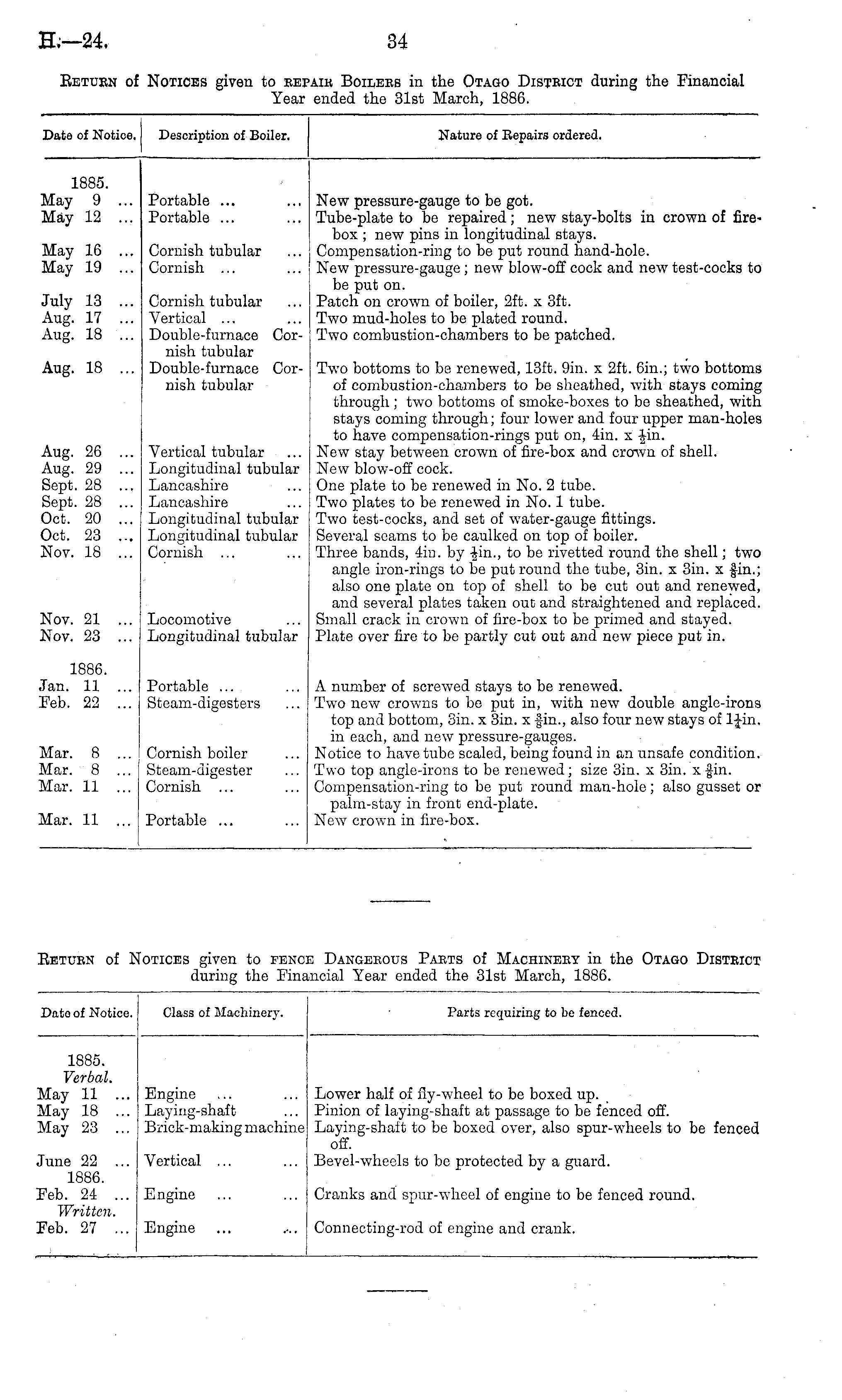 Return of Notices given to repair Boilers in the Otago District during the Financial Year ended the 31st March, 1886.