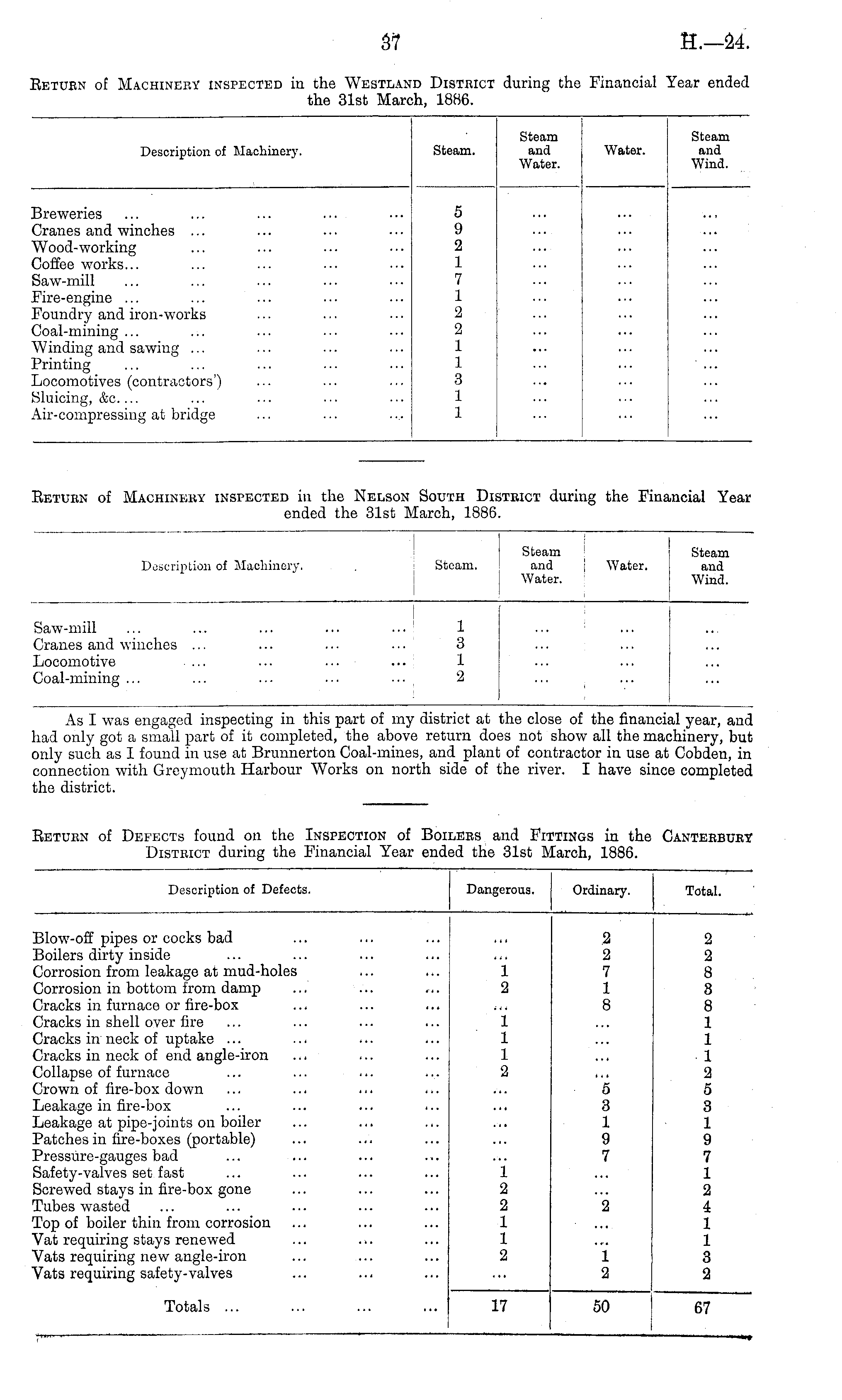 As I was engaged inspecting in this part of my district at the close of the financial year, and had only got a small part of it completed, the above return does not show all the machinery, but only such as I found in use at Brunnerton Coal-mines, and plant of contractor in use at Cobden, in connection with Greymouth Harbour Works on north side of the river. I have since completed the district.