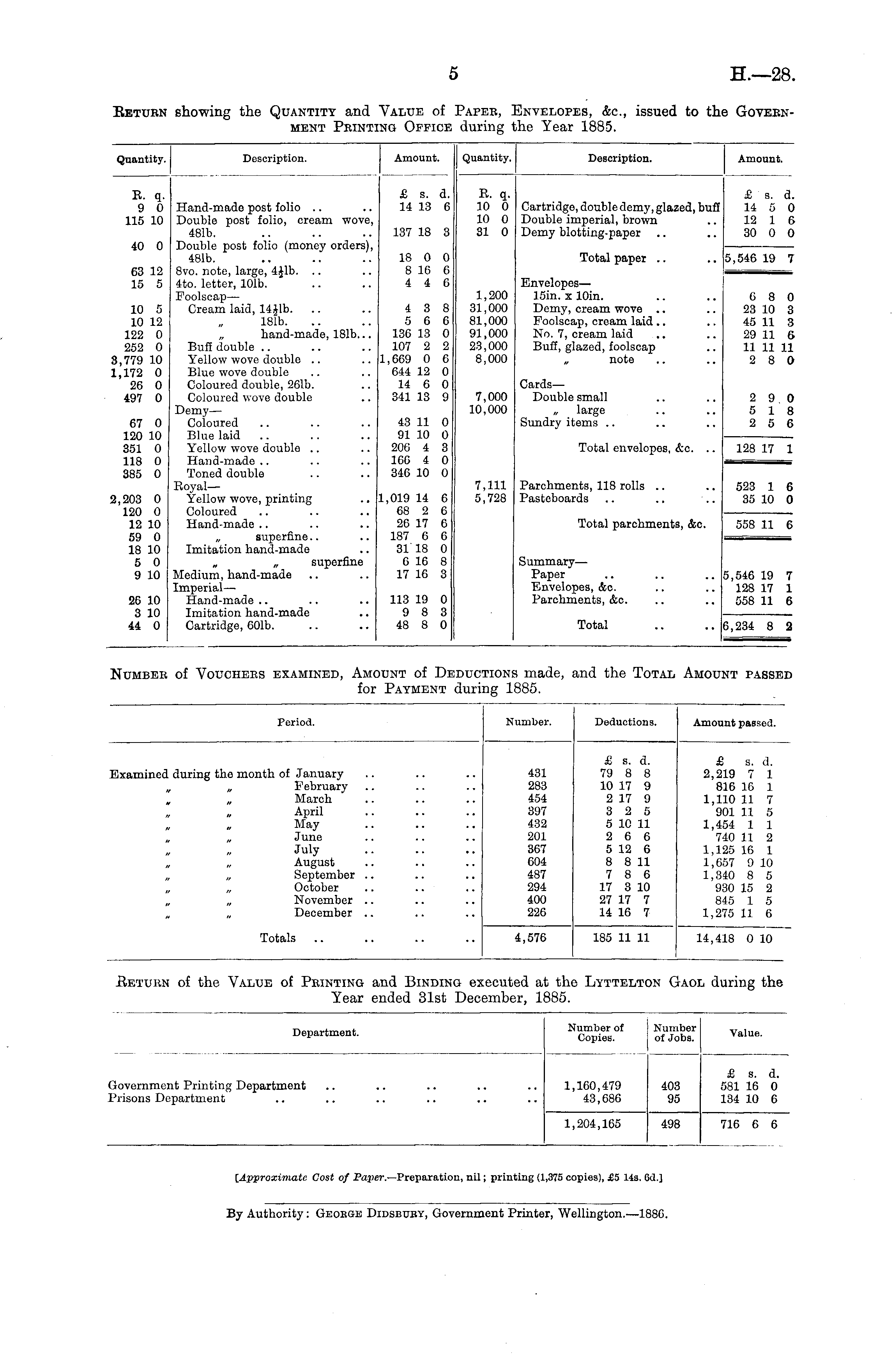 Return showing the Quantity and Value of Paper, Envelopes, &c., issued to the Government Printing Office during the Year 1885.