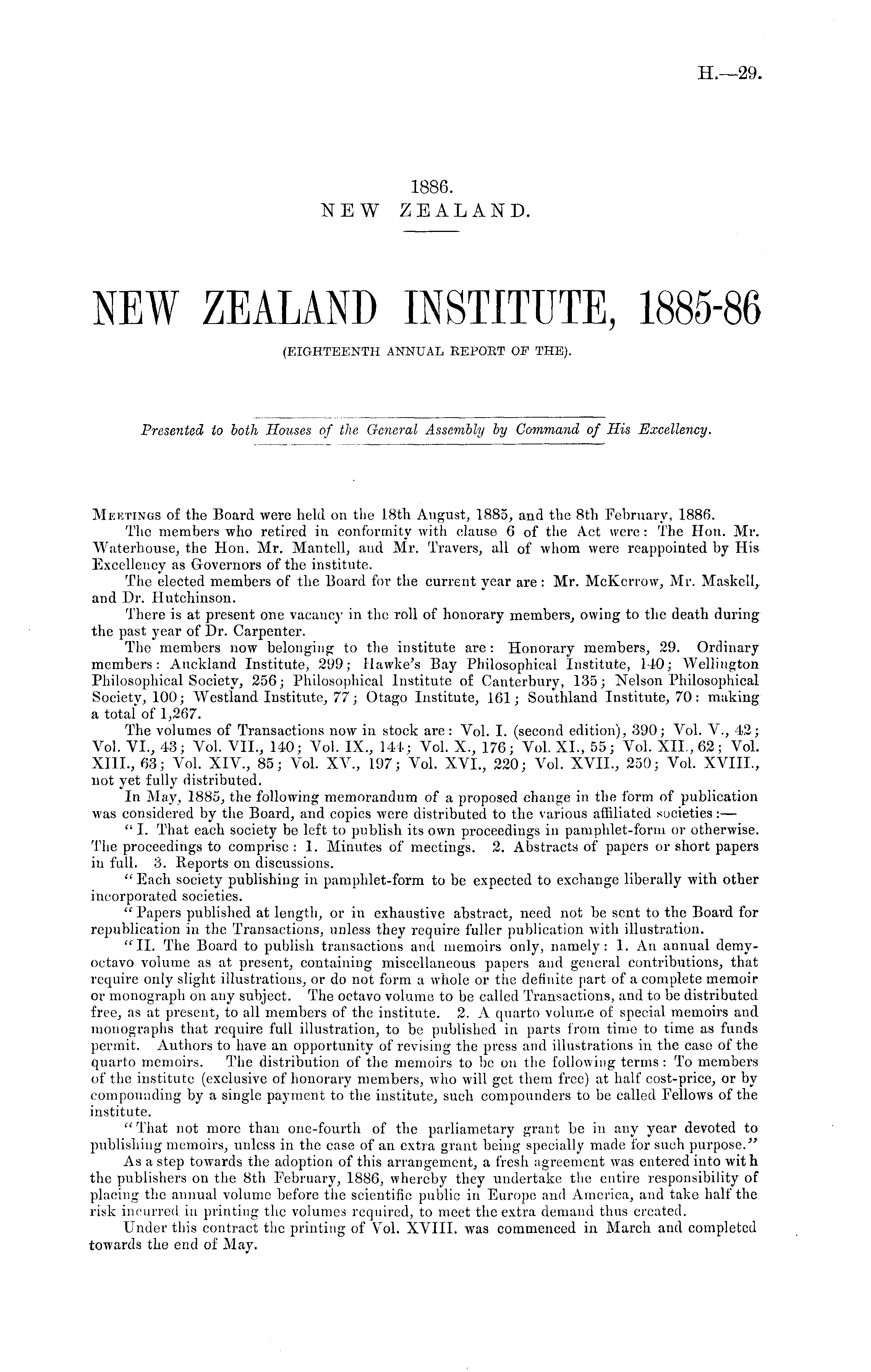 Meetings of the Board were held on the 18th August, 1885, and the Bth February, 1886. The members who retired in conformity with clause 6 of the Act were: The Hon. Mr. Waterhouse, the Hon. Mr. Mantcll, and Mr. Travers, all of whom were reappointed by His Excellency as Governors of the institute. The elected members of the Board for the current year arc : Mr. McKcrrow, Mr. Masked, and Dr. Hutchinson. There is at present one vacancy in the roll of honorary members, owing to the death during the past year of Dr. Carpenter. The members now belonging to the institute are : Honorary members, 29. Ordinary members: Auckland Institute, 299; Hawke's Bay Philosophical Institute, 140; Wellington Philosophical Society, 256; Philosophical Institute of Canterbury, 135; Nelson Philosophical Society, 100; Westland Institute, 77 ; Otago Institute, 161; Southland Institute, 70 : making a total of 1,267. The volumes of Transactions now in stock are: Vol. I. (second edition), 390; Vol. V., 42; Vol. VI., 43; Vol. VII., 140; Vol. IX., 141; Vol. X., 176; Vol. XL, 55; Vol. XII., 62; Vol. XIII., 63; Vol. XIV., 85; Vol. XV., 197; Vol. XVI., 220; Vol. XVII., 250; Vol. XVIII., not yet fully distributed. In May, 1885, the following memorandum of a proposed change in the form of publication was considered by the Board, and copies were distributed to the various affiliated societies: — " I. That each society be left to publish its own proceedings in pamphlet-form or otherwise. The proceedings to comprise :1. Minutes of meetings. 2. Abstracts of papers or short papers in full. 3. Beports on discussions. "Each society publishing in pamphlet-form to be expected to exchange liberally with other incorporated societies. "Papers published at length, or in exhaustive abstract, need not be sent to the Board for republication in the Transactions, unless they require fuller publication with illustration. "11. The Board to publish transactions and memoirs only, namely: 1. An annual demyoctavo volume as at present, containing miscellaneous papers and general contributions, that require only slight illustrations, or do not form a whole or the definite part of a complete memoir or monograph on any subject. The octavo volume to be called Transactions, and to be distributed free, as at present, to all members of the institute. 2. A quarto volume of special memoirs and monographs that require full illustration, to be published in parts from time to time as funds permit. Authors to have an opportunity of revising the press and illustrations in the case of the quarto memoirs. The distribution of the memoirs to be on the following terms: To members of the institute (exclusive of honorary members, who will get them free) at half cost-price, or by compounding by a single payment to the institute, such compounders to be called Fellows of the institute. "That not more than one-fourth of the parliametary grant be in any year devoted to publishing memoirs, unless in the case of an extra grant being specially made for such purpose." As a step towards the adoption of this arrangement, a fresh agreement was entered into with the publishers on the Bth February, 1886, whereby they undertake the entire responsibility of placing the annual volume before the scientific public in Europe and America, and take half the risk incurred in printing the volumes required, to meet the extra demand thus created. Under this contract the printing of Vol. XVIII. was commenced in March and completed towards the end of May.
