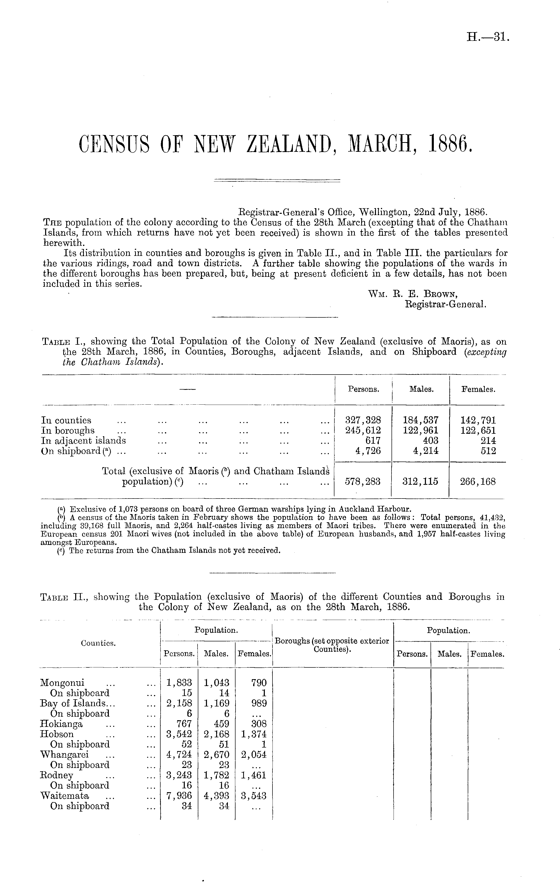 Registrar-General's Office, Wellington, 22nd July, 1886. The population of the colony according to the Census of the 28th March (excepting that of the Chatham Islands, from which returns have not yet been received) is shown in the first of the tables presented herewith. Its distribution in counties and boroughs is given in Table 11., and in Table 111. the particulars for the various ridings, road and town districts. A further table showing the populations of the wards in the different boroughs has been prepared, but, being at present deficient in a few details, has not been included in this series. Wm. R. E. Brown, Registrar-General.