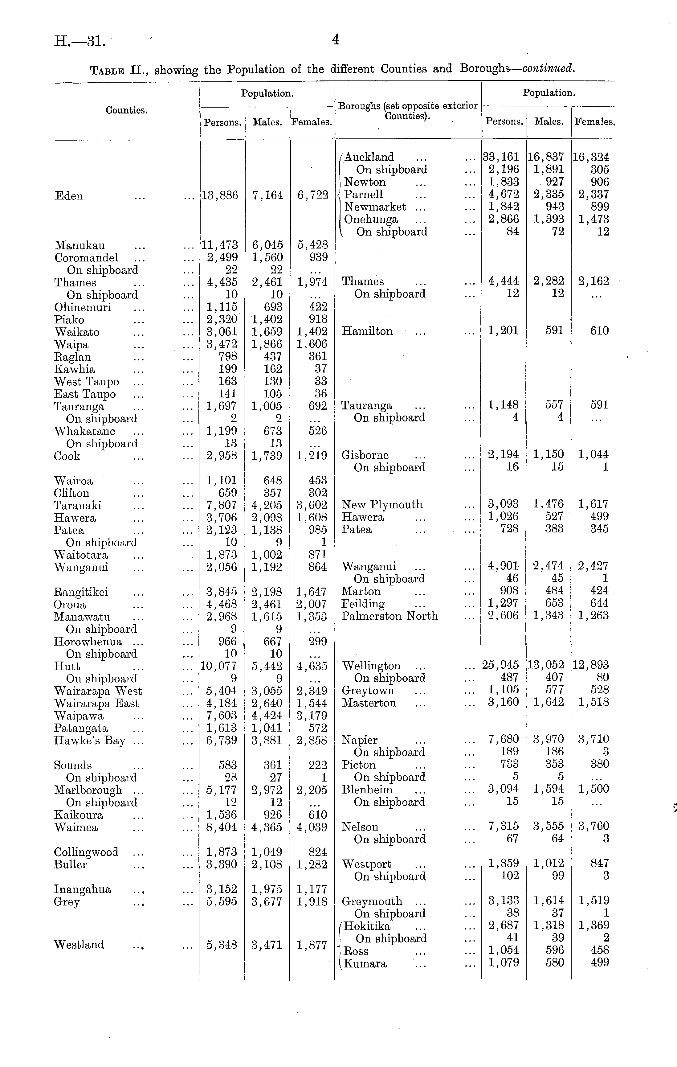 Population. Population. Counties. Persons. Males. Females. Boroughs (set opposite exterior Counties). Persons. Males. Females, Eden 13,886 7,164 6,722 /Auckland On shipboard ] Newton Parnell Newmarket ... Onehunga \ On shipboard 33,161 2,196 1,833 4,672 1,842 2,866 84 16,837 1,891 927 2,335 943 1,393 72 16,324 305 906 2,337 899 1,473 12 Manukau Coromandel On shipboard Thames On shipboard Ohincmuri Piako Waikato Waipa Eaglan Kawhia West Taupo ... East Taupo rauranga On shipboard Whakatane On shipboard I!ook 11,473 2,499 22 4,435 10 1,115 2,320 3,061 3,472 798 199 163 141 1,697 2 1,199 13 2,958 6,045 1,560 22 2,461 10 693 1,402 1,659 1,866 437 162 130 105 1,005 2 673 13 1,739 5,428 939 1,974 422 918 1,402 1,606 361 37 33 36 692 Thames On shipboard Hamilton 4,444 12 1,201 2,282 12 591 2,162 610 Tauranga On shipboard 591 1,148 4 557 4 526 1,219 Gisborne On shipboard 2,194 16 1,150 15 1,044 1 Wairoa Dlifton faranaki Eawera Patea On shipboard Waitotara Wanganui 1,101 659 7,807 3,706 2,123 1.0 1,873 2,056 648 357 4,205 2,098 1,138 9 1,002 1,192 453 302 3,602 1,608 985 1 871 864 New Plymouth Hawera Patea 3,093 1,026 728 1,476 527 383 1,617 499 345 Bangitikei Droua 3,845 4,468 2,968 9 966 10 10,077 9 5,404 4,184 7,603 1,613 6,739 2,198 2,461 1,615 9 667 10 5,442 9 3,055 2,640 4,424 1,041 3,881 1,647 2,007 1,353 Wanganui On shipboard Marton Feilding Palmerston North 4,901 46 908 1,297 2,606 2,474 45 484 653 1,343 2,427 1 424 644 1,263 Manawatu On shipboard Eorowhenua ... On shipboard Eutt On shipboard Wairarapa West Wairarapa East Waipawa Patangata Eawke's Bay ... 299 4,635 2,349 1,544 3,179 572 2,858 Wellington On shipboard Greytown Masterton 25,945 487 1,105 3,160 13,052 407 577 1,642 12,893 80 528 1,518 Sounds On shipboard Marlborough ... On shipboard Kaikoura Waimea 583 28 5,177 12 1,536 8,404 361 27 2,972 12 926 4,365 222 1 2,205 Napier On shipboard Picton On shipboard Blenheim On shipboard 7,680 189 733 5 3,094 15 3,970 186 353 5 1,594 15 3,710 3 380 1,500 610 4,039 Nelson On shipboard 7,315 67 3,555 64 3,760 3 Dollingwood Buller 1,873 3,390 1,049 2,108 824 1,282 Westport On shipboard 1,859 102 1,012 99 847 3 [nangahua jrey 3,152 5,595 1,975 3,677 1,177 1,918 Greymouth ... On shipboard (Hokitika On shipboard 1 Ross (Kumar a 3,133 38 2,687 41 1,054 1,079 1,614 37 1,318 39 596 580 1,519 1 1,369 2 458 499 Westland 5,348 1,877 3,471