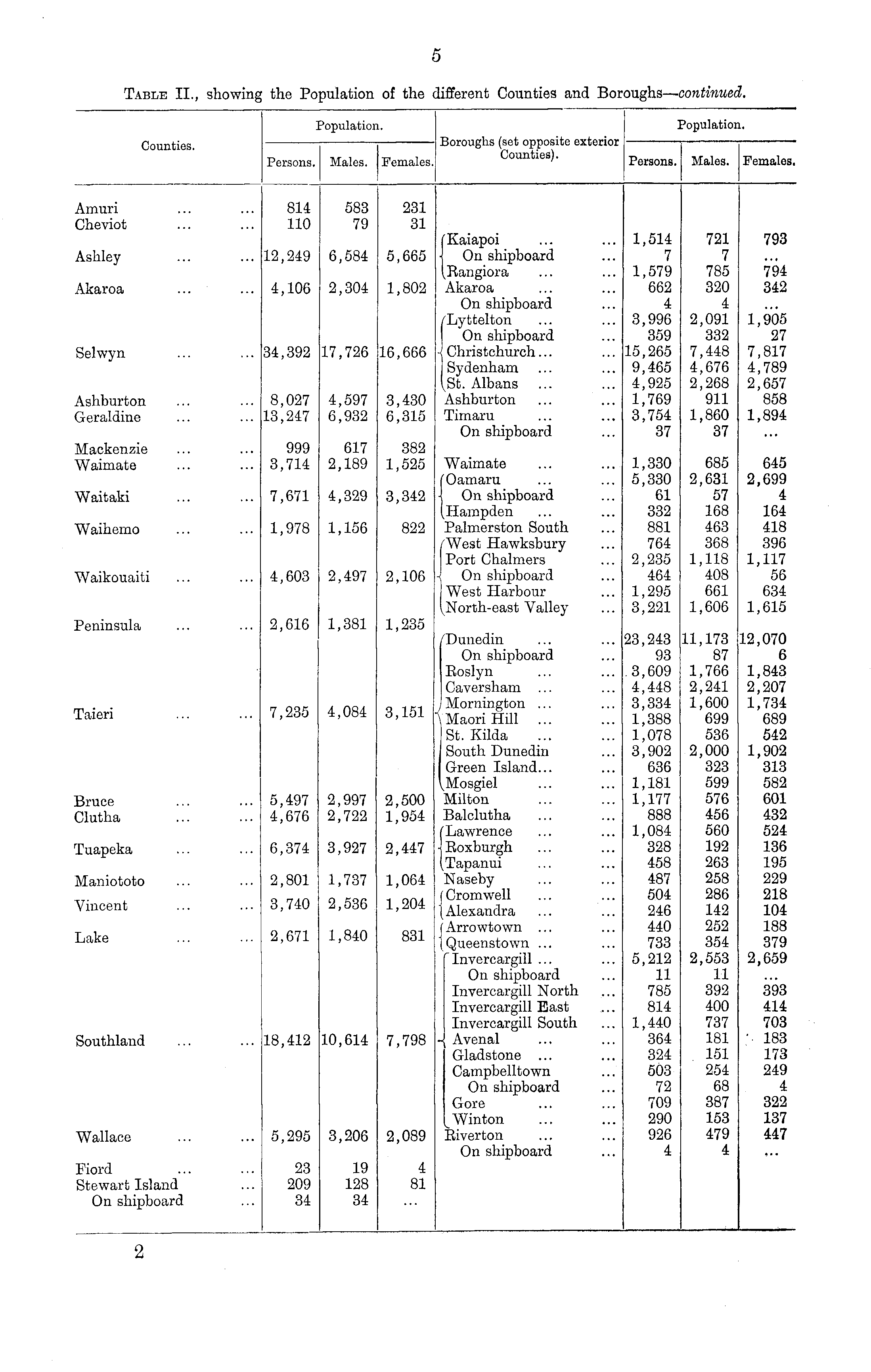 Population. Population. Counties. Persons. Males. Females. Boroughs (set opposite exterior Counties). Persons. Males. Females. Amuri Cheviot 814 110 583 79 231 31 Ashley Akaroa Selwyn 12,249 4,106 34,392 6,584 2,304 17,726 5,665 1,802 16,666 (Kaiapoi On shipboard (Rangiora Akaroa On shipboard /Lyttelton On shipboard - Christchurch... Sydenham (St. Albans Ashburton Timaru On shipboard 1,514 7 1,579 662 4 3,996 359 15,265 9,465 4,925 1,769 3,754 37 721 7 785 320 4 2,091 332 7,448 4,676 2,268 911 1,860 37 793 794 342 1,905 27 7,817 4,789 2,657 858 1,894 Ashburton Geraldine 8,027 13,247 4,597 6,932 3,430 6,315 Mackenzie Waimate 999 3,714 617 2,189 382 1,525 Waimate (Oamaru \ On shipboard (Hampden Palmerston South /West Hawksbury Port Chalmers < On shipboard I West Harbour (North-east Valley 1,330 5,330 61 332 881 764 2,235 464 1,295 3,221 685 2,631 57 168 463 368 1,118 408 661 1,606 645 2,699 4 164 418 396 1,117 56 634 1,615 Waitaki 7,671 4,329 3,342 Waihemo 1,978 1,156 822 Waikouaiti 4,603 2,497 2,106 Peninsula 2,616 1,381 1,235 /Dunedin On shipboard Roslyn Caversham , Mornington ... "YMaori Hill ... St. Kilda South Dunedin Green Island... \Mosgiel Milton Balclutha 23,243 93 3,609 4,448 3,334 1,388 1,078 3,902 636 1,181 1,177 888 1,084 328 458 487 504 246 440 733 5,212 11 785 814 1,440 364 324 503 72 709 290 926 4 11,173 87 1,766 2,241 1,600 699 536 2,000 323 599 576 456 560 192 263 258 286 142 252 354 2,553 11 392 400 737 181 151 254 68 387 153 479 4 12,070 6 1,843 2,207 1,734 689 542 1,902 313 582 601 432 524 136 195 229 218 104 188 379 2,659 Taieri 7,235 4,084 3,151 Bruce Clutha 5,497 4,676 2,997 2,722 2,500 1,954 Tuapeka Maniototo Vincent Lake 6,374 2,801 3,740 2,671 3,927 1,737 2,536 1,840 2,447 1,064 1,204 831 ("Lawrence ■j Roxburgh (Tapanui Naseby ( Cromwell {Alexandra I Arrowtown ... | Queenstown ... 'Invercargill ... On shipboard Invercargill North Invercargill East Invercargill South ~{ Avenal Gladstone ... Campbelltown On shipboard Southland 18,412 10,614 7,798 393 414 703 ' 183 173 249 4 322 137 447 Wallace Gore _ Winton 5,295 3,206 2,089 Riverton On shipboard Fiord Stewart Island On shipboard 23 209 34 19 128 34 4 81