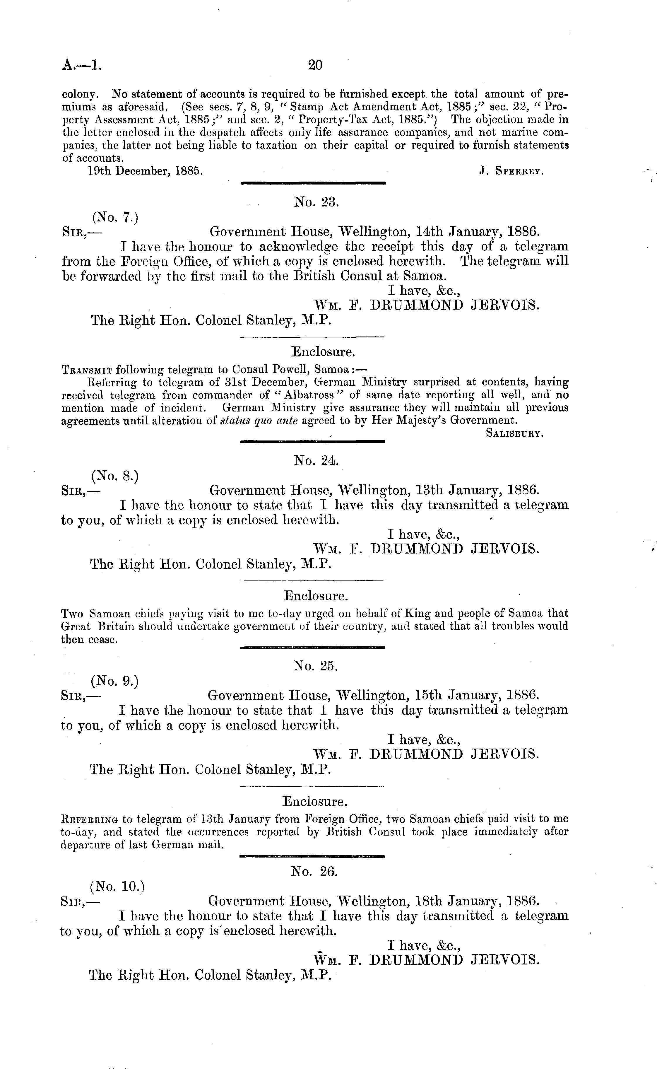 No. 23. (No. 7.) Sir, — Government House, Wellington, 14th January, 1886. I have the honour to acknowledge the receipt this day of a telegram from the Foreign Office, of which a copy is enclosed herewith. The telegram will be forwarded by the first mail to the British Consul at Samoa. I have, &c, Wm. E. DEUMMOND JEEVOIS. The Eight Hon. Colonel Stanley, M.E.