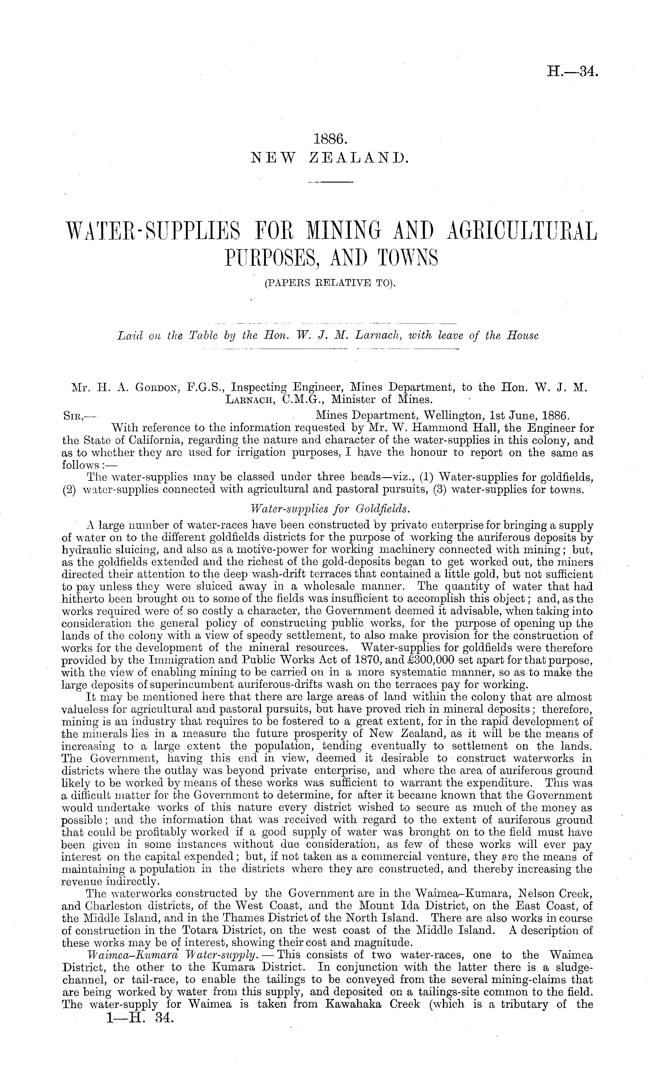 Mr. H. A. Gokdon, F.G.S., Inspecting Engineer, Mines Department, to the Hon. W. J. M. Laenaoh, C.M.G., Minister of Mines. Sik, — . Mines Department, Wellington, Ist June, 1886. With reference to the information requested by Mr. W. Hammond Hall, the Engineer for the State of California, regarding the nature and character of the water-supplies in this colony, and as to whether they are used for irrigation purposes, I have the honour to report on the same as follows: — The water-supplies may be classed under three heads—viz., (1) Water-supplies for goldfields, (2) water-supplies connected with agricultural and pastoral pursuits, (3) water-supplies for towns. Water-supplies for Goldfields. A large number of water-races have been constructed by private enterprise for bringing a supply of water on to the different goldfields districts for the purpose of working the auriferous deposits by hydraulic sluicing, and also as a motive-power for working machinery connected with mining; but, as the goldfields extended and the richest of the gold-deposits began to get worked out, the miners directed their attention to the deep wash-drift terraces that contained a little gold, but not sufficient to pay unless they were sluiced away in a wholesale manner. The quantity of water that had hitherto been brought on to some of the fields was insufficient to accomplish this object; and, as the works required were of so costly a character, the Government deemed it advisable, when taking into consideration the general policy of constructing public works, for the purpose of opening up the lands of the colony with a view of speedy settlement, to also make provision for the construction of works for the development of the mineral resources. Water-supplies for goldfields were therefore provided by the Immigration and Public Works Act of 1870, and £300,000 set apart for that purpose, with the view of enabling mining to be carried on in a more systematic manner, so as to make the large deposits of superincumbent auriferous-drifts wash on the terraces pay for working. It may be mentioned here that there are large areas of land within the colony that are almost valueless for agricultural and pastoral pursuits, but have proved rich in mineral deposits; therefore, mining is an industry that requires to be fostered to a great extent, for in the rapid development of the minerals lies in a measure the future prosperity of New Zealand, as it will be the means of increasing to a large extent the population, tending eventually to settlement on the lands. The Government, having this end in view, deemed it desirable to construct waterworks in districts where the outlay was beyond private enterprise, and where the area of auriferous ground likely to be worked by means of these works was sufficient to warrant the expenditure. This was a difficult matter for the Government to determine, for after it became known that the Government would undertake works of this nature every district wished to secure as much of the money as possible; and the information that was received with regard to the extent of auriferous ground that could be profitably worked if a good supply of water was bronght on to the field must have been given in some instances without due consideration, as few of these works will ever pay interest on the capital expended; but, if not taken as a commercial venture, they «?ro the means of maintaining a population in the districts where they are constructed, and thereby increasing the revenue indirectly. The waterworks constructed by the Government are in the Waiinea-Kumara, Nelson Creek, and Charleston districts, of the West Coast, and the Mount Ida District, on the East Coast, of the Middle Island, and in the Thames District of the North Island. There are also works in course of construction in the Totara District, on the west coast of the Middle Island. A description of these works may be of interest, showing their cost and magnitude. Waimca-Rwmard Water-supply. — This consists of two water-races, one to the Waimea District, the other to the Kumara District. In conjunction with the latter there is a sludgechannel, or tail-race, to enable the tailings to be conveyed from the several mining-claims that are being worked by water from this supply, and deposited on a tailings-site common to the field. The water-supply for Waimea is taken from Kawahaka Creek (which is a tributary of the I—H. 34.
