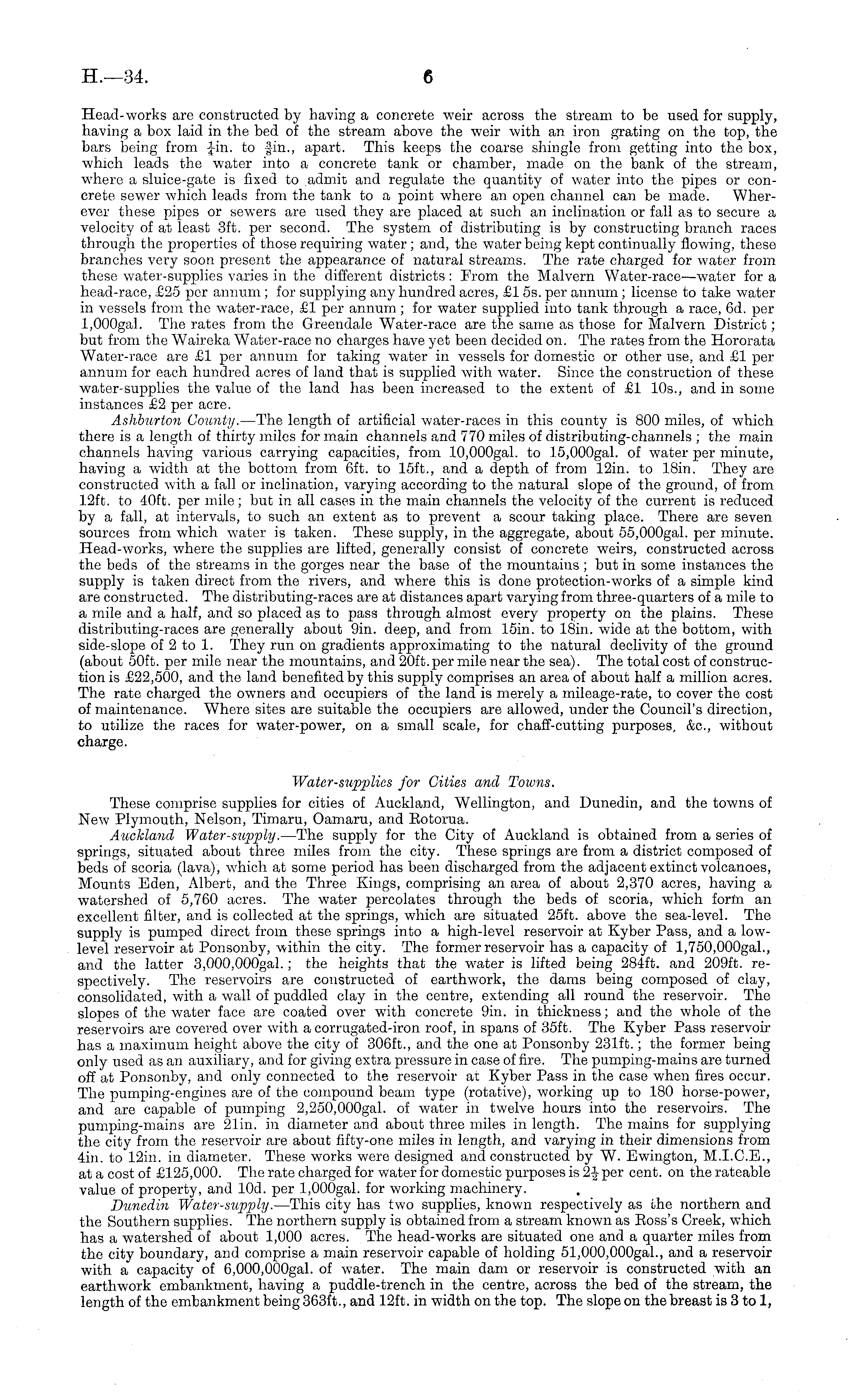 Head-works are constructed by having a concrete weir across the stream to be used for supply, having a box laid in the bed of the stream above the weir with an iron grating on the top, the bars being from Jin. to -gin., apart. This keeps the coarse shingle from getting into the box, which leads the water into a concrete tank or chamber, made on the bank of the stream, where a sluice-gate is fixed to admit and regulate the quantity of water into the pipes or concrete sewer which leads from the tank to a point where an open channel can be made. Wherever these pipes or sewers are used they are placed at such an inclination or fall as to secure a velocity of at least 3ft. per second. The system of distributing is by constructing branch races through the properties of those requiring water; and, the water being kept continually flowing, those branches very soon present the appearance of natural streams. The rate charged for water from these water-supplies varies in the different districts: From the Malvern Water-race—water for a head-race, £25 per annum ; for supplying any hundred acres, £1 ss. per annum ; license to take water in vessels from the water-race, £1 per annum ; for water supplied into tank through a race, 6d. per l,ooogal. The rates from the Greendale Water-race are the same as those for Malvern District; but from the Waireka Water-race no charges have yet been decided on. The rates from the Hororata Water-race are £1 per annum for taking water in vessels for domestic or other use, and £1 per annum for each hundred acres of land that is supplied with water. Since the construction of these water-supplies the value of the land has been increased to the extent of £1 10s., and in some instances £2 per acre. Ashburton County. —The length of artificial water-races in this county is 800 miles, of which there is a length of thirty miles for main channels and 770 miles of distributing-channels ; the main channels having various carrying capacities, from 10,000gal. to 15,000ga1. of water per minute, having a width at the bottom from 6ft. to 15ft., and a depth of from 12in. to 18in. They are constructed with a fall or inclination, varying according to the natural slope of the ground, of from 12ft. to 40ft. per mile ; but in all cases in the main channels the velocity of the current is reduced by a fall, at intervals, to such an extent as to prevent a scour taking place. There are seven sources from which water is taken. These supply, in the aggregate, about 55,000ga1. per minute. Head-works, where the supplies are lifted, generally consist of concrete weirs, constructed across the beds of the streams in the gorges near the base of the mountains ; but in some instances the supply is taken direct from the rivers, and where this is done protection-works of a simple kind are constructed. The distributing-races are at distances apart varying from three-quarters of a mile to a mile and a half, and so placed as to pass through almost every property on the plains. These distributing-races are generally about 9in. deep, and from 15in. to 18in. wide at the bottom, with side-slope of 2to 1. They run on gradients approximating to the natural declivity of the ground (about 50ft. per mile near the mountains, and 20ft. per mile near the sea). The total cost of construction is £22,500, and the land benefited by this supply comprises an area of about half a million acres. The rate charged the owners and occupiers of the land is merely a mileage-rate, to cover the cost of maintenance. Where sites are suitable the occupiers are allowed, under the Council's direction, to utilize the races for water-power, on a small scale, for chaff-cutting purposes, &c, without charge. Water-supplies for Cities and Towns. These comprise supplies for cities of Auckland, Wellington, and Dunedin, and the towns of New Plymouth, Nelson, Timaru, Oamaru, and Eotorua. AvxMand Water-supply. —The supply for the City of Auckland is obtained from a series of springs, situated about three miles from the city. These springs are from a district composed of beds of scoria (lava), which at some period has been discharged from the adjacent extinct volcanoes, Mounts Eden, Albert, and the Three Kings, comprising an area of about 2,370 acres, having a watershed of 5,760 acres. The water percolates through the beds of scoria, which form an excellent filter, and is collected at the springs, which are situated 25ft. above the sea-level. The supply is pumped direct from these springs into a high-level reservoir at Kyber Pass, and a lowlevel reservoir at Ponsonby, within the city. The former reservoir has a capacity of 1,750,000ga1., and the latter 3,000,000gal.; the heights that the water is lifted being 284ft. and 209ft. respectively. The reservoirs are constructed of earthwork, the dams being composed of clay, consolidated, with a wall of puddled clay in the centre, extending all round the reservoir. The slopes of the water face are coated over with concrete 9in. in thickness; and the whole of the reservoirs are covered over with a corrugated-iron roof, in spans of 35ft. The Kyber Pass reservoir has a maximum height above the city of 306ft., and the one at Ponsonby 231ft.; the former being only used as an auxiliary, and for giving extra pressure in case of lire. The pumping-mains are turned off at Ponsonby, and only connected to the reservoir at Kyber Pass in the case when fires occur. The pumping-engines are of the compound beam type (rotative), working up to 180 horse-power, and are capable of pumping 2,250,000ga1. of water in twelve hours into the reservoirs. The pumping-mains are 21in. in diameter and about three miles in length. The mains for supplying the city from the reservoir are about fifty-one miles in length, and varying in their dimensions from 4in. to 12in. in diameter. These works were designed and constructed by W. Ewington, M.1.C.E., at a cost of £125,000. The rate charged for water for domestic purposes is 2| per ce