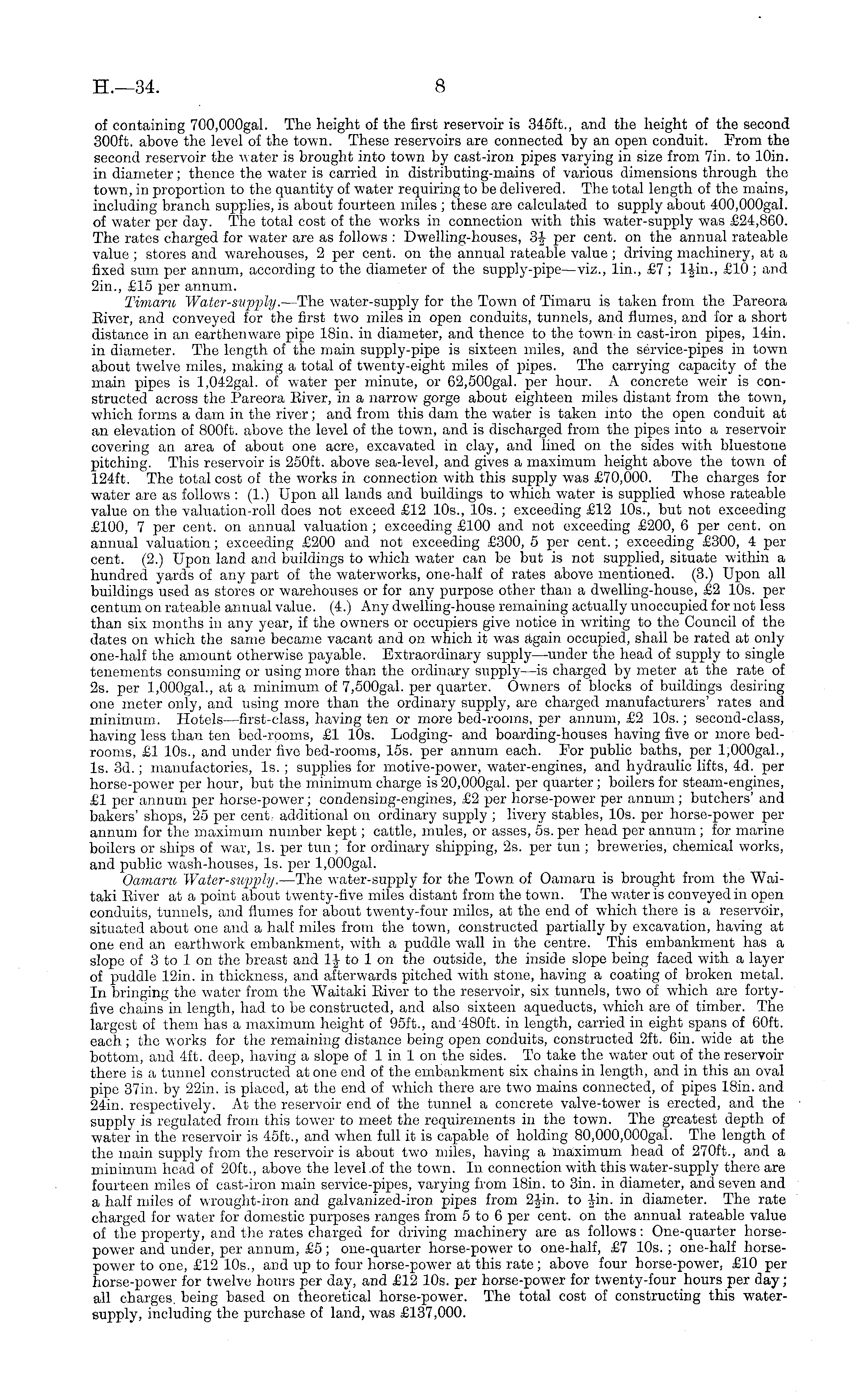 of containing 700,000ga1. The height of the first reservoir is 345ft., and the height of the second 300ft. above the level of the town. These reservoirs are connected by an open conduit. Prom the second reservoir the water is brought into town by cast-iron pipes varying in size from 7in. to lOin. in diameter; thence the water is carried in distributing-mains of various dimensions through the town, in proportion to the quantity of water requiring to be delivered. The total length of the mains, including branch supplies, is about fourteen miles ; these are calculated to supply about 400,000ga1. of water per day. The total cost of the works in connection with this water-supply was £24,860. The rates charged for water are as follows : Dwelling-houses, 3-J per cent, on the annual rateable value ; stores and warehouses, 2 per cent, on the annual rateable value ; driving machinery, at a fixed sum per annum, according to the diameter of the supply-pipe—viz., lin., £7 ; lfin., £10 ; and 2in., £15 per annum. Timaru Water-supply. —The water-supply for the Town of Timaru is taken from the Pareora Eiver, and conveyed for the first two miles in open conduits, tunnels, and flumes, and for a short distance in an earthenware pipe 18in. in diameter, and thence to the town in cast-iron pipes, 14in. in diameter. The length of the main supply-pipe is sixteen miles, and the service-pipes in town about twelve miles, making a total of twenty-eight miles of pipes. The carrying capacity of the main pipes is 1,042ga1. of water per minute, or 62,500ga1. per hour. A concrete weir is constructed across the Pareora Eiver, in a narrow gorge about eighteen miles distant from the town, which forms a dam in the river; and from this dam the water is taken into the open conduit at an elevation of 800ft. above the level of the town, and is discharged from the pipes into a reservoir covering an area of about one acre, excavated in clay, and lined on the sides with bluestone pitching. This reservoir is 250ft. above sea-level, and gives a maximum height above the town of 124ft. The total cost of the works in connection with this supply was £70,000. The charges for water are as follows : (1.) Upon all lands and buildings to which water is supplied whose rateable value on the valuation-roll does not exceed £12 10s., 10s. ; exceeding £12 10s., but not exceeding £100, 7 per cent, on annual valuation ; exceeding £100 and not exceeding £200, 6 per cent, on annual valuation; exceeding £200 and not exceeding £300, 5 per cent.; exceeding £300, 4 per cent. (2.) Upon land and buildings to which water can be but is not supplied, situate within a hundred yards of any part of the waterworks, one-half of rates above mentioned. (3.) Upon all buildings used as stores or warehouses or for any purpose other than a dwelling-house, £2 10s. per centum on rateable annual value. (4.) Any dwelling-house remaining actually unoccupied for not less than six months in any year, if the owners or occupiers give notice in writing to the Council of the dates on which the same became vacant and on which it was again occupied, shall be rated at only one-half the amount otherwise payable. Extraordinary supply—under the head of supply to single tenements consuming or using more than the ordinary supply —is charged by meter at the rate of 2s. per 1,000ga1., at a minimum of 7,500ga1. per quarter. Owners of blocks of buildings desiring one meter only, and using more than the ordinary supply, are charged manufacturers' rates and minimum. Hotels —first-class, having ten or more bed-rooms, per annum, £2 10s.; second-class, having less than ten bed-rooms, £1 10s. Lodging- and boarding-houses having five or more bodrooms, £1 10s., and under five bed-rooms, 15s. per annum each. For public baths, per 1,000ga1., Is. 3d.; manufactories, Is. ; supplies for motive-power, water-engines, and hydraulic lifts, 4d. per horse-power per hour, but the minimum charge is 20,000ga1. per quarter ; boilers for steam-engines, £1 per annum per horse-power ; condensing-engines, £2 per horse-power per annum ; butchers' and bakers' shops, 25 per cent, additional on ordinary supply ; livery stables, 10s. per horse-power per annum for the maximum number kept; cattle, mules, or asses, ss. per head per annum ; for marine boilers or ships of war, Is. per tun ; for ordinary shipping, 2s. per tun ; breweries, chemical works, and public wash-houses, Is. per l,ooogal. Oamaru Water-supply. —The water-supply for the Town of Oamaru is brought from the Waitaki Eiver at a point about twenty-five miles distant from the town. The water is conveyed in open conduits, tunnels, and flumes for about twenty-four miles, at the end of which there is a reservoir, situated about one and a half miles from the town, constructed partially by excavation, having at one end an earthwork embankment, with a puddle wall in the centre. This embankment has a slope of 3 to 1 on the breast and If to 1 on the outside, the inside slope being faced with a layer of puddle 12in. in thickness, and afterwards pitched with stone, having a coating of broken metal. In bringing the water from the Waitaki Eiver to the reservoir, six tunnels, two of which are fortyfive chains in length, had to be constructed, and also sixteen aqueducts, which are of timber. The largest of them has a maximum height of 95ft., and'4Boft. in length, carried in eight spans of 60ft. each ; the works for the remaining distance being open conduits, constructed 2ft. 6in. wide at the bottom, and 4ft. deep, having a slope of linl on the sides. To take the water out of the reservoir there is a tunnel constructed at one end of the embankment six chains in length, and in this an oval pipe 37in. by 22in. is placed, at the end of which there are two mains connected, of pipes 18in. and 24in. respectively. At the reservoir end of the tunnel a concrete valve-tower is erected, and the supply is regulated from this tower to meet the requirements in the 